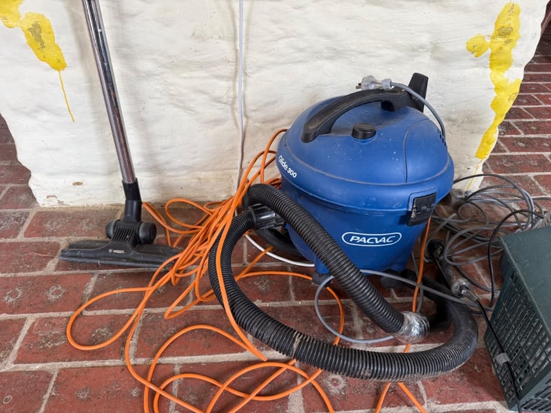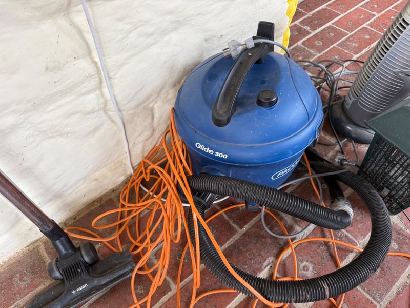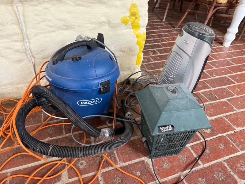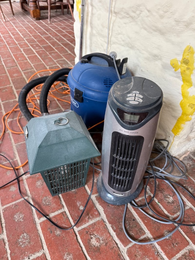 Assorted Appliances featuring a Pacific Glide 300 wet/dry vacuum, Heller Tower System, Yard Guard Mosquito Catcher. The Pacific vacuum is a robust blue canister model equipped with black flexible ducting.Note: Items Untested.