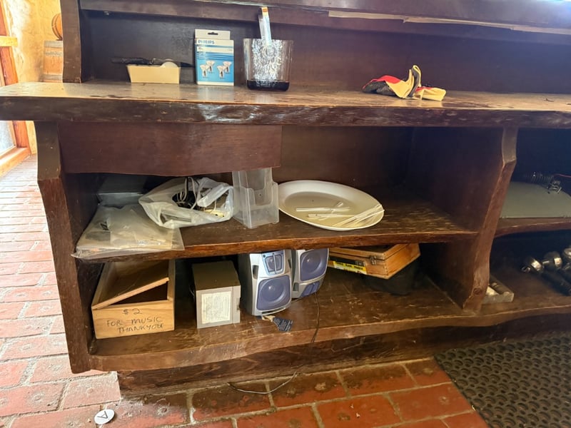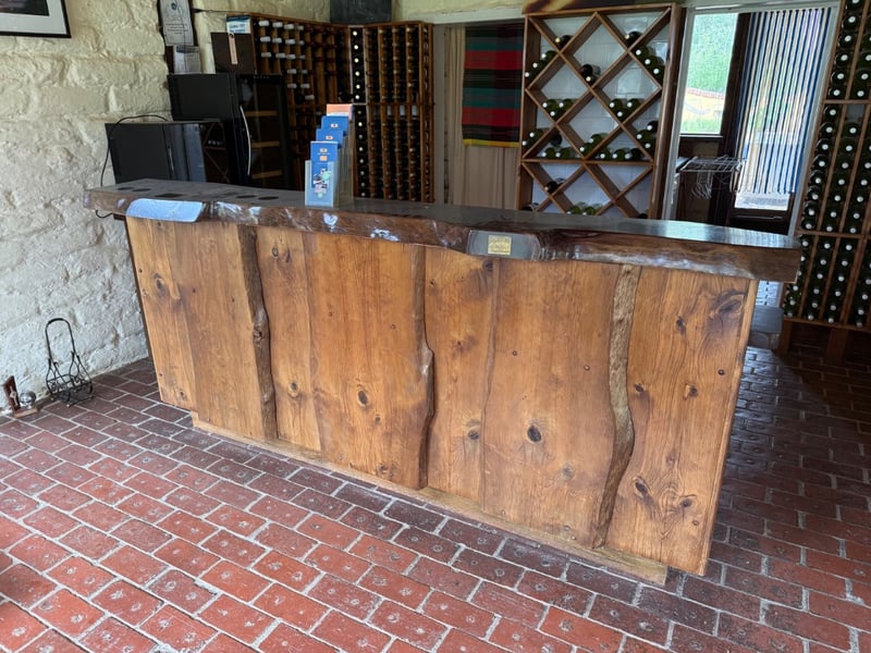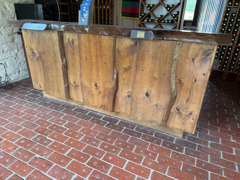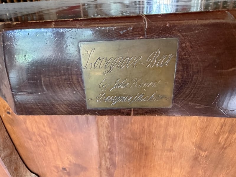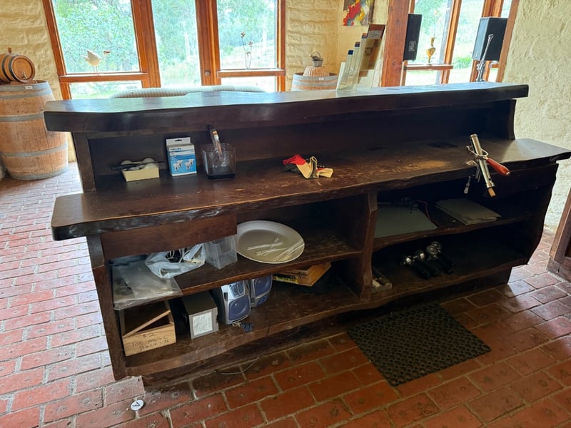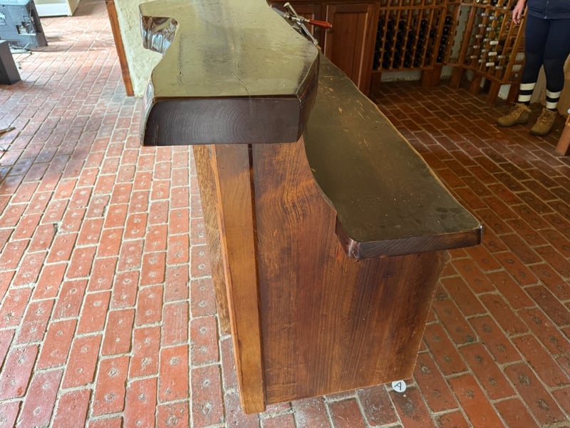 Impressive Longwood Bar by John Punnett, Designer Maker. This substantial wooden bar counter features a rustic aesthetic with four prominent panel-front sections crafted from solid timber with natural grain and knot detailing. The bar showcases a dark stained top surface with visible wear patina, complemented by open shelving beneath for storage and display. A brass nameplate identifies the maker and designer. The piece demonstrates quality craftsmanship with sturdy construction, featuring multiple compartments ideal for hospitality or retail use. The warm timber tones and traditional design make this a distinctive statement piece suitable for wine bars, restaurants, or period-style venues.Approx Dimensions: 116H x 57D x 257WNote: Buyer to bring appropriate tools/ equipment to remove.Sold as lot