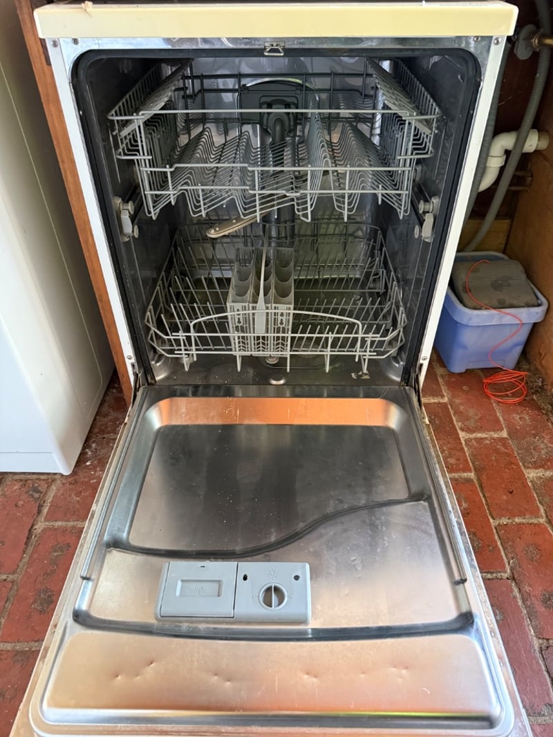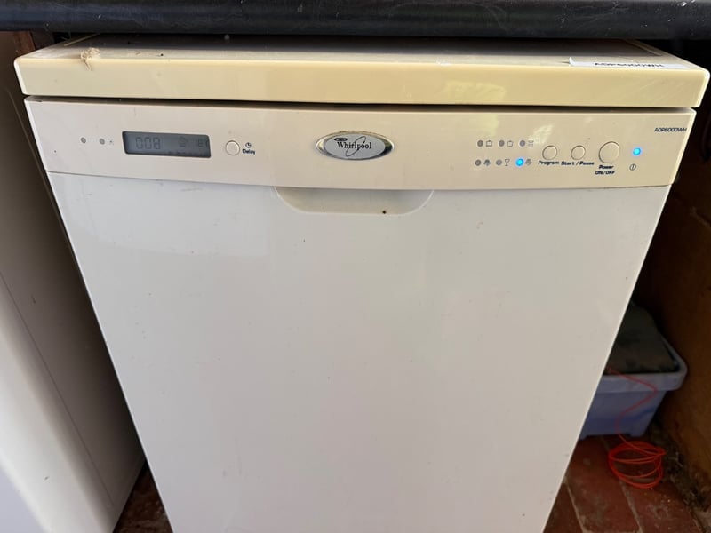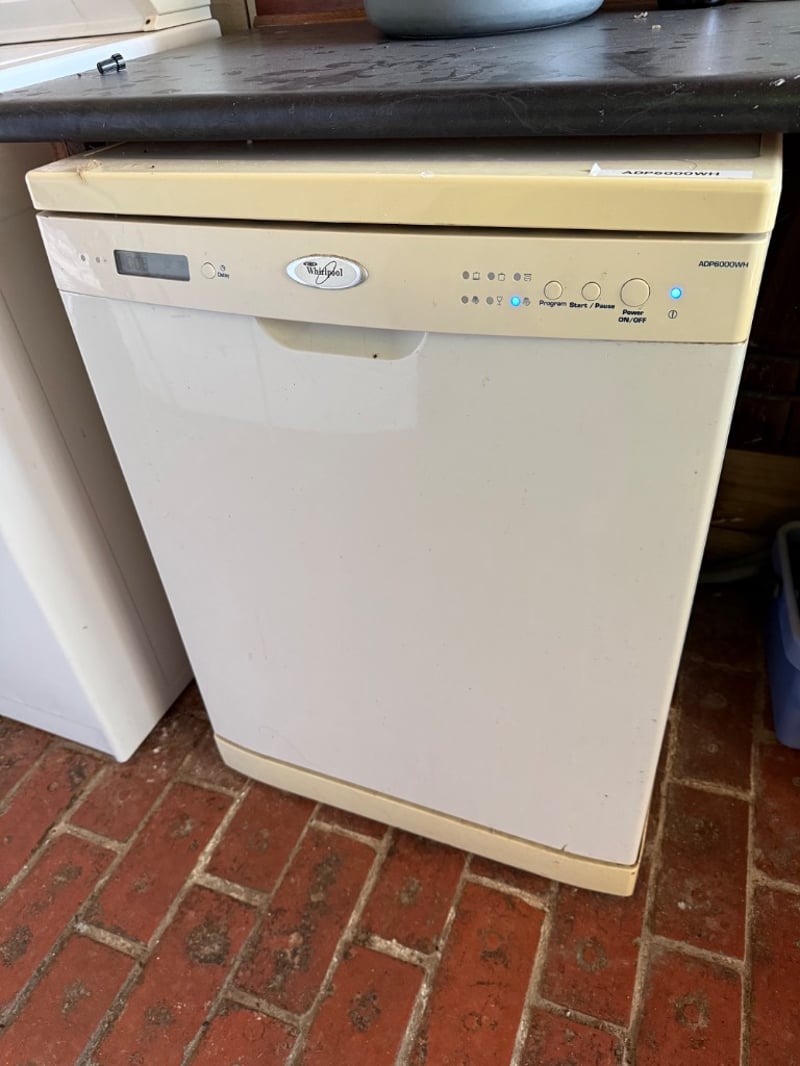 Whirlpool ADP6000WH freestanding dishwasher in cream/ivory finish. Features digital display, multiple wash programs with start/pause function, and energy-efficient operation. Equipped with two fold-down spray arm racks and lower basket configuration. Control panel includes program selection buttons, on/off switch, and indicator lights. Model number ADP6000WH visible on top panel. Suitable for standard kitchen installation.Approx Dimensions: 87H x 60W x 55DNote: Item Untested, Buyer to bring appropriate tools/ equipment to remove.