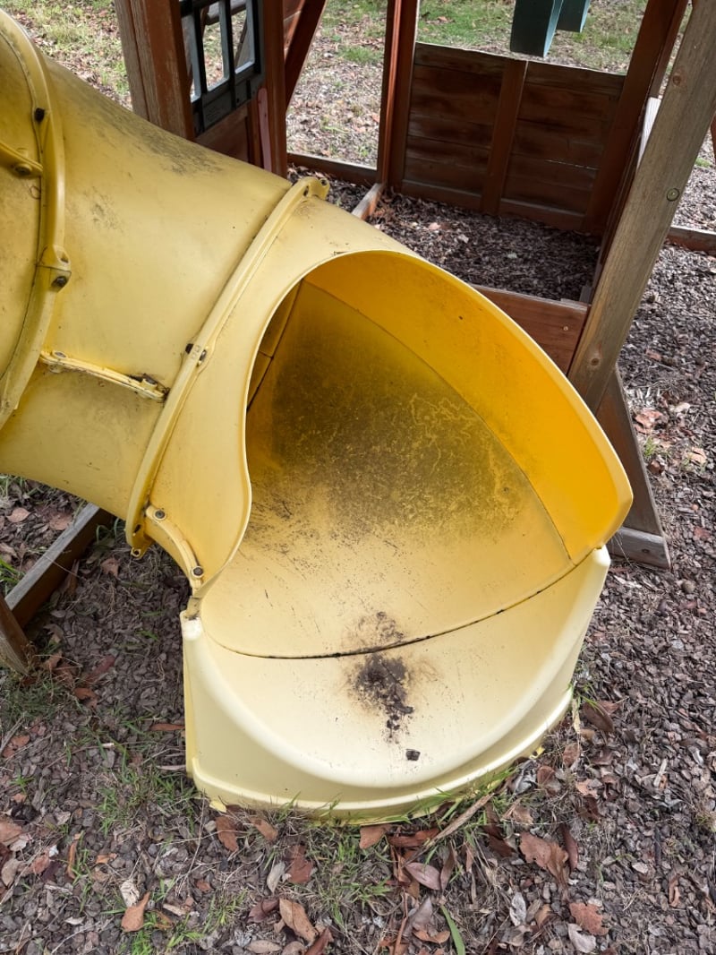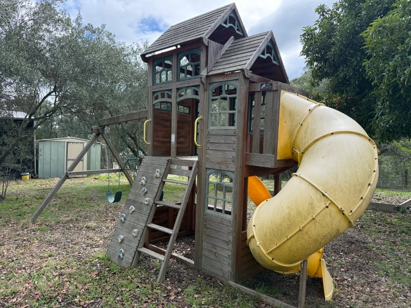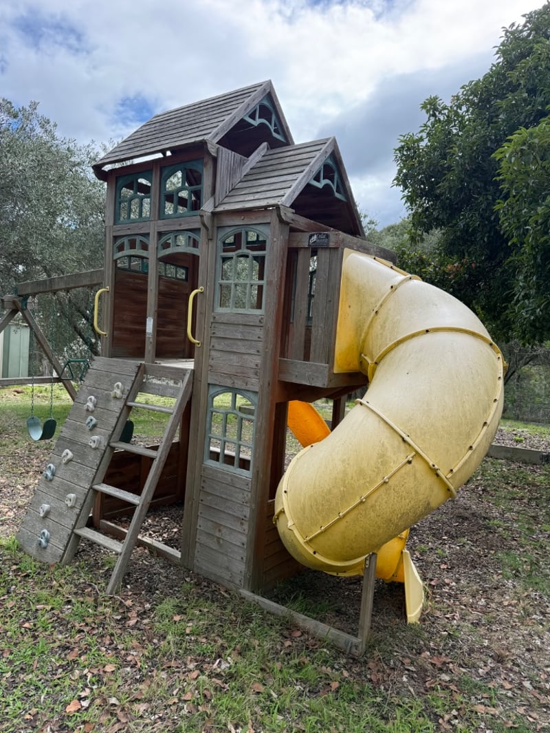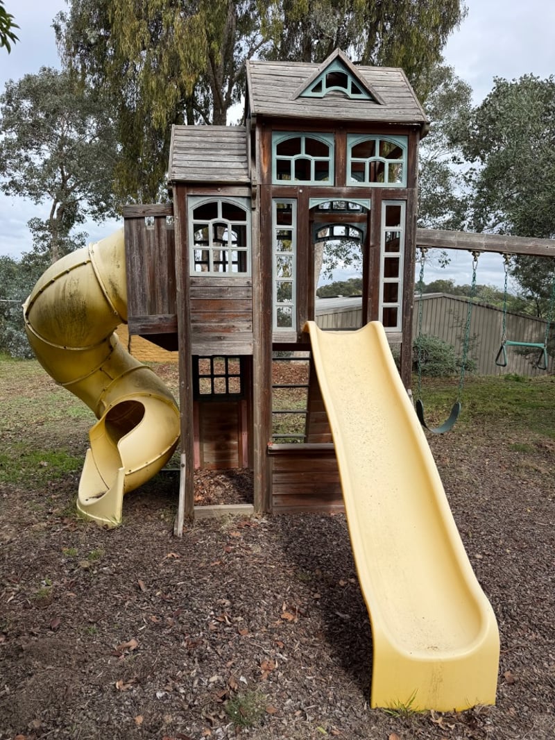 Wooden play tower with dual yellow tube slides and integrated swing set. Features a two-storey timber structure with pitched roof, multiple windows, and climbing ladder access. Includes spiral and straight slide configurations, swing frame with single swing seat. Constructed from weathered timber with metal fittings and hardware. Suitable for children aged 3-10 years with weight limit of 110 lbs per child. Made by Solowaye Design Corp (Buffalo, New York). Outdoor recreational equipment showing signs of age and weathering consistent with extended use.Note: Buyer to bring appropriate tools/ equipment to remove.