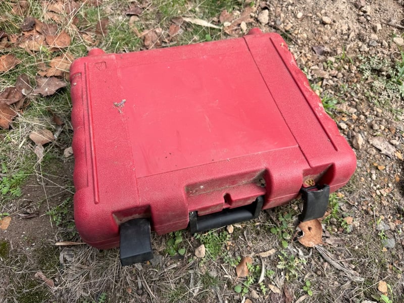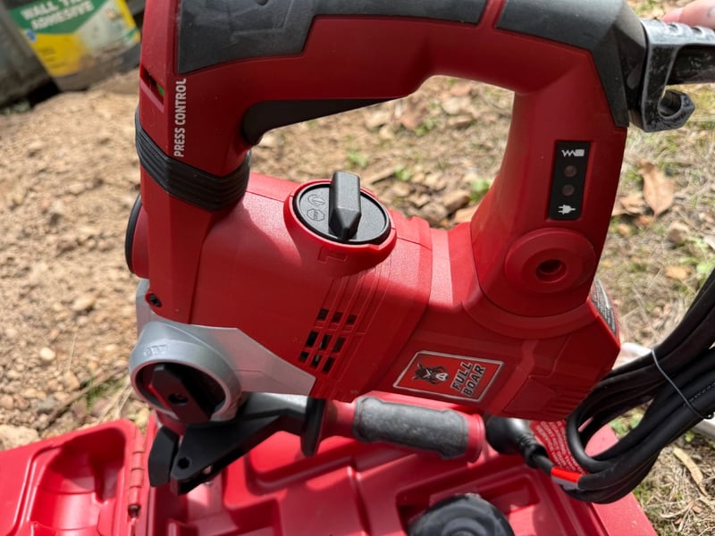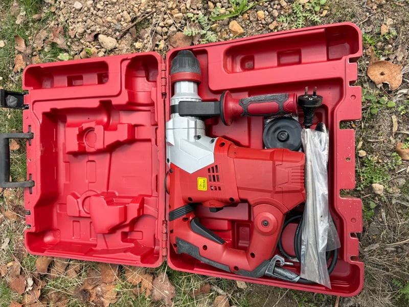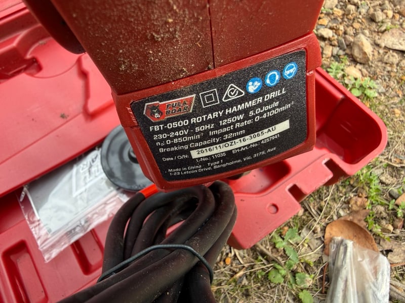 Full Boar FBT-0500 Rotary Hammer Drill in original red carrying case. This 230-240V, 50Hz electric rotary hammer features 125-850rpm variable speed with 10-850mm impact rate and 32mm breaking capacity. The kit includes the main drill unit with auxiliary handle, dust extraction attachment, and original instruction manual. The case shows weathering consistent with outdoor storage but the tool remains functional. Ideal for masonry, concrete drilling, and chiseling applications. Made in China, model FBT-0500.Note: Item untested