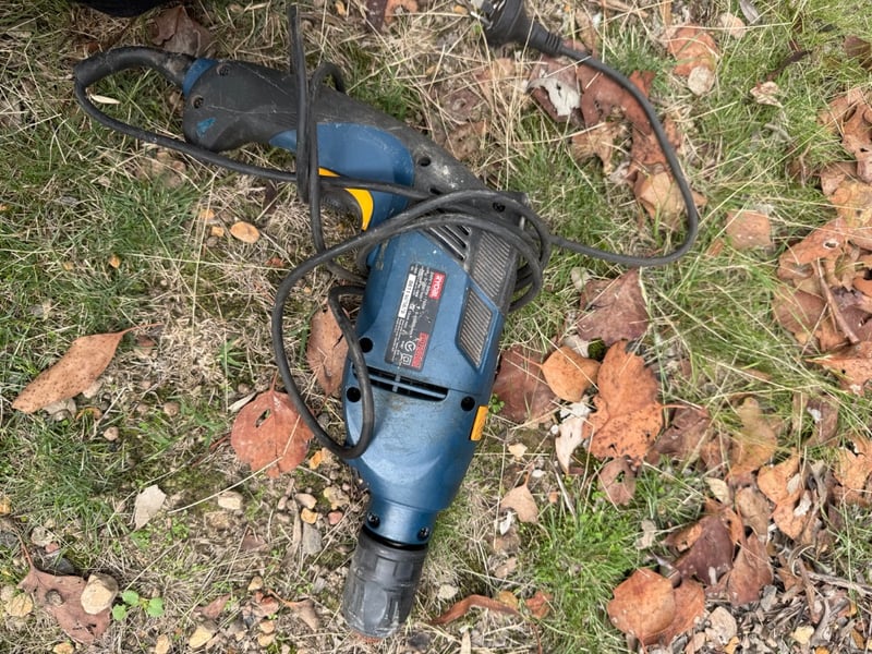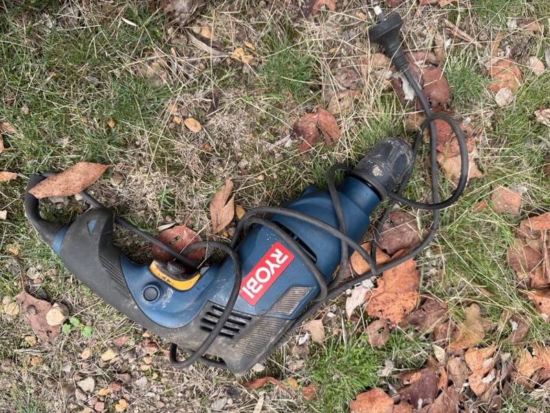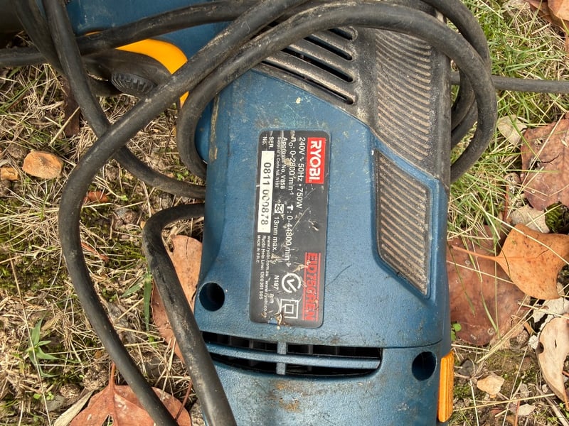 Ryobi corded electric angle grinder in blue and black finish. Features a 115mm cutting disc, variable speed control, and side handle for enhanced grip and stability. The unit displays visible wear consistent with regular workshop use, including surface scuffing and patina on the housing. Equipped with a power cord and operational trigger mechanism. Suitable for cutting, grinding, and finishing applications. Model specifications visible on manufacturer's label. Ideal for DIY enthusiasts and tradespersons requiring a reliable corded grinding tool.Note: Item Untested