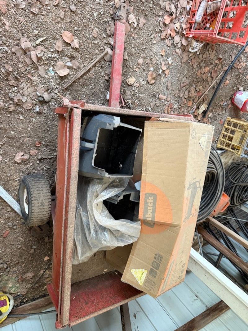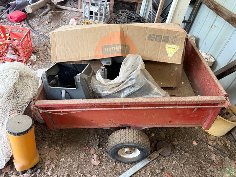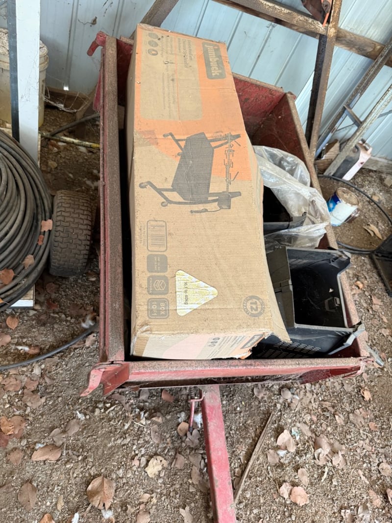 Vintage red metal utility trailer. The trailer features a single axle with pneumatic tire, metal towing hitch, and red painted steel sides showing patina consistent with age and outdoor storage. Includes Mower Catchers. The trailer bed shows rust and weathering typical of a working farm or construction vehicle. Suitable for restoration or functional use. Includes original hitch mechanism and functional wheel assembly.Note: Box is empty.Sold as lotNote: Buyer to bring appropriate tools/ equipment to remove.