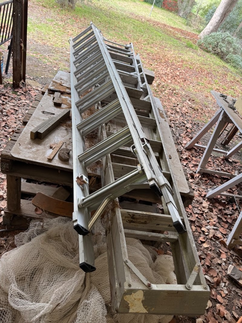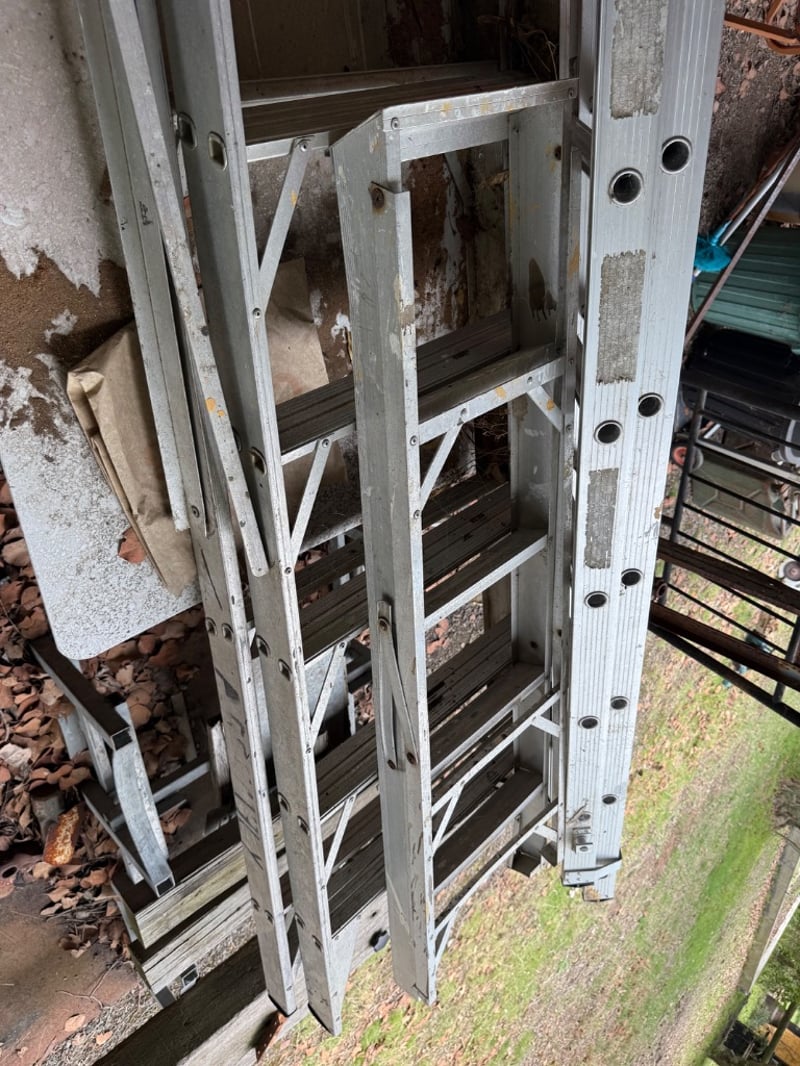 Aluminum extension ladder in fair condition, featuring dual-rail construction with multiple rungs. The ladder displays weathering and oxidation consistent with outdoor storage. Both sections show structural integrity with visible wear patterns. Includes original feet and hardware. Suitable for general maintenance and access tasks. Note surface corrosion and patina throughout.Sold as lot