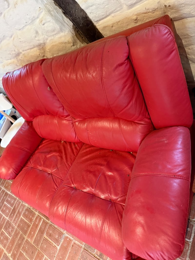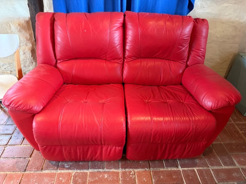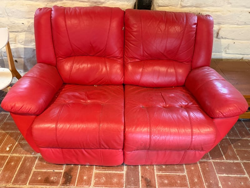 Red leather reclining loveseat featuring a two-seat configuration. The piece showcases genuine red leather upholstery with quilted panel detailing and padded armrests. The frame appears sturdy with visible stitching throughout. Minor wear consistent with age is evident on the leather surface, including slight creasing and surface marks. Ideal for casual living spaces or entertainment areas.Approx Dimensions Per Couch: 90H x 160W x 100DQuantity: 2 Couches, Sold as lotNote: Buyer to bring appropriate tools/ equipment to remove.