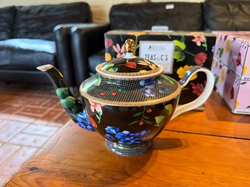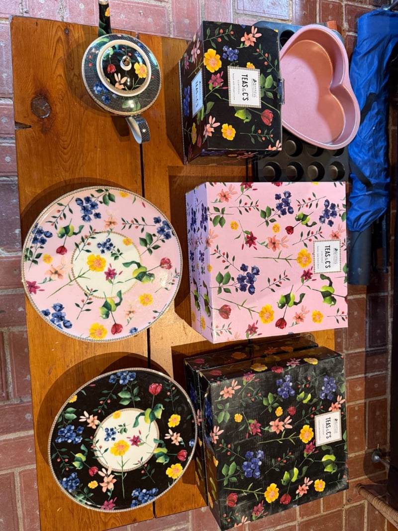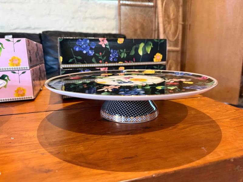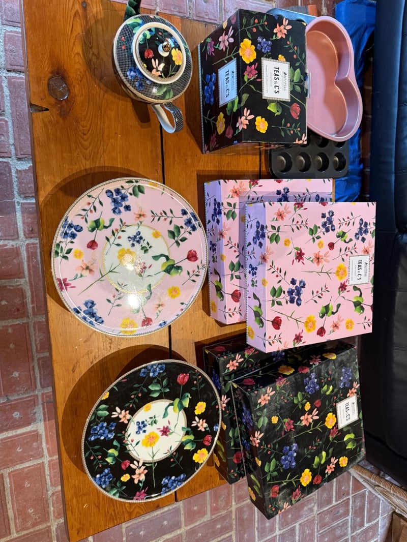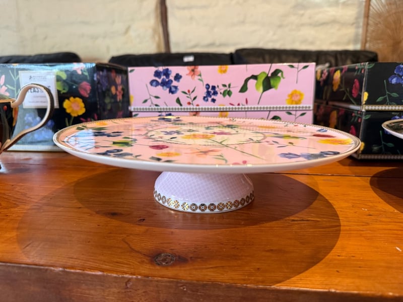 Assortment of Teapot, 2 Cake Stands in pink floral design, 2 Cake stands in black floral design and bakewares. Brand for Teapot and Cake Stands: Maxwells Williams. SOLD AS LOT