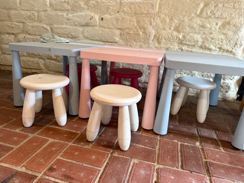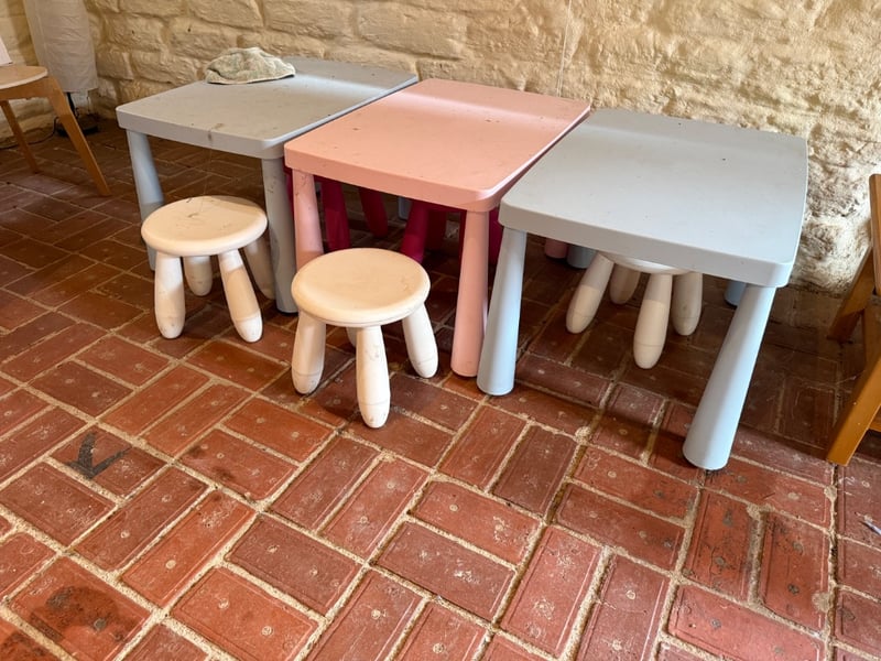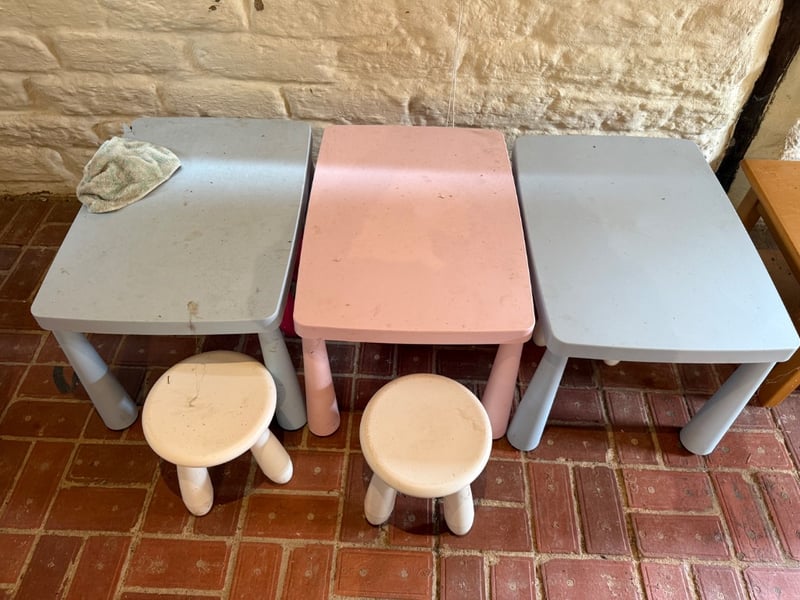 3 Kids tables and 5 chairs, signs of wear consistent with previous use.Approx. Dimensions for All: 50H x 167W x 75D cmSOLD AS LOT