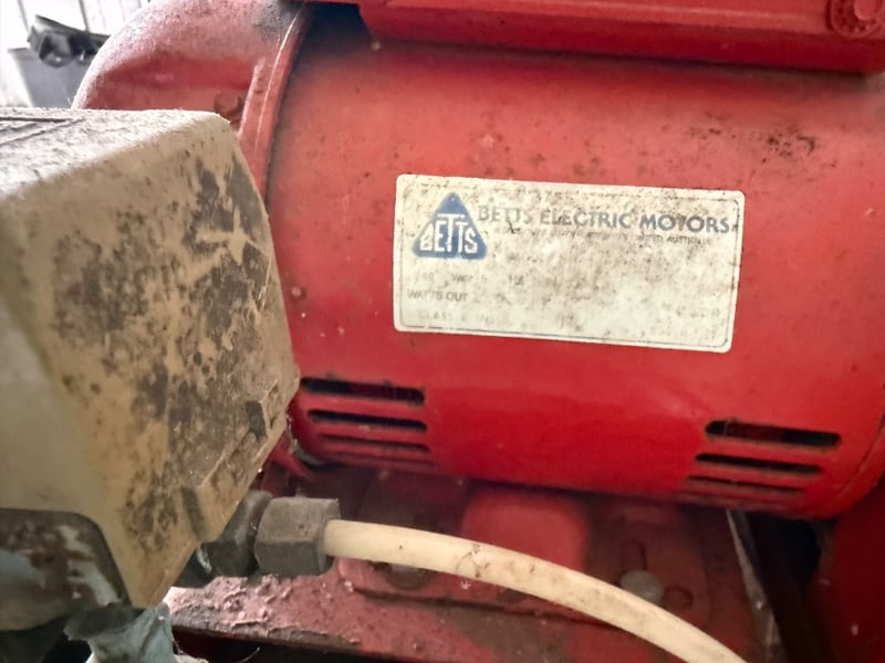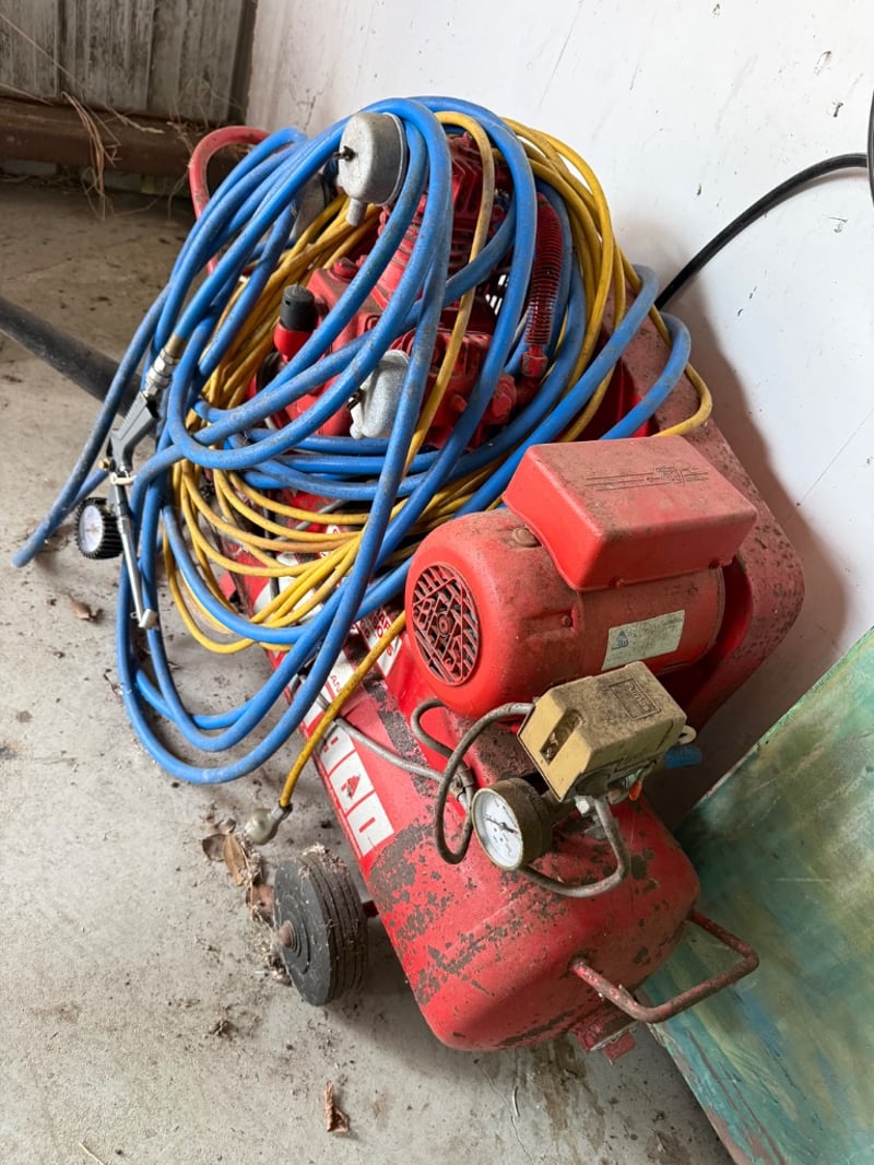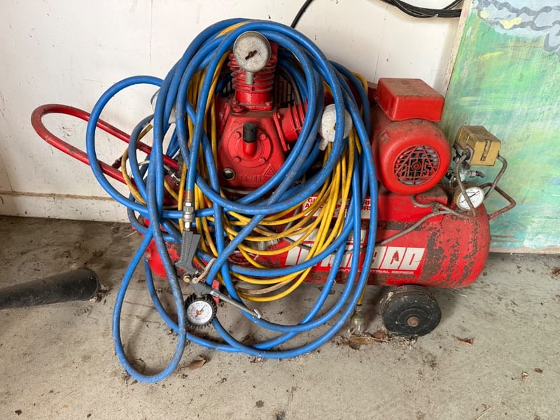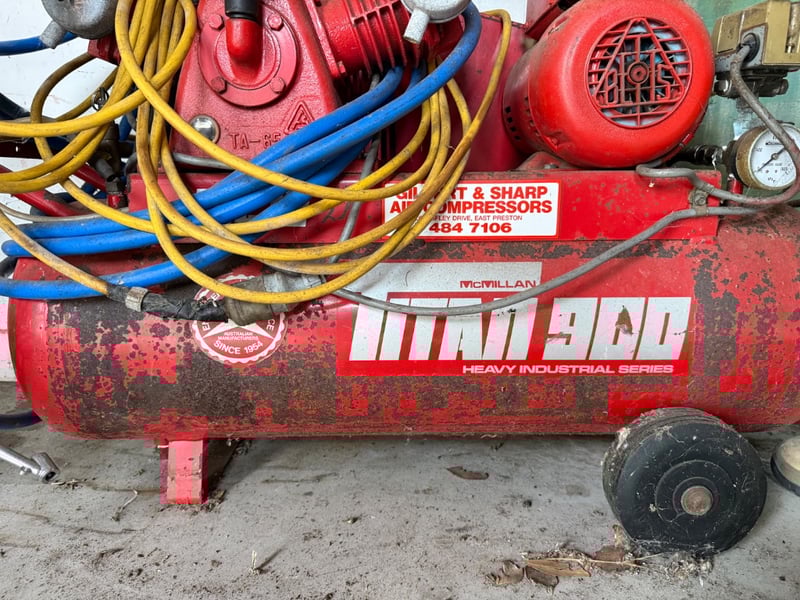 Heavy industrial air compressor, Make: McMillan, Model: Titan900. Suitable for workshop or trade use. Shows significant surface rust and weathering consistent with age and outdoor storage. Untested, sold as it.