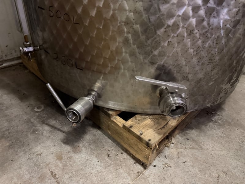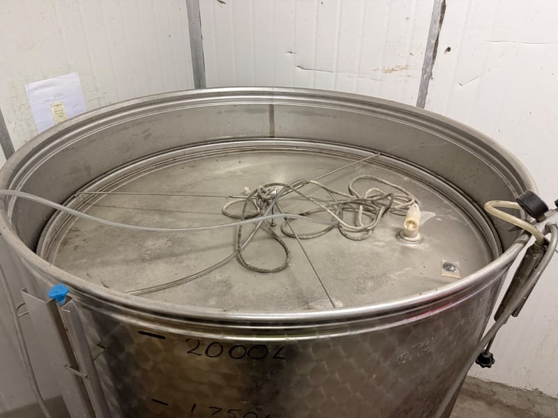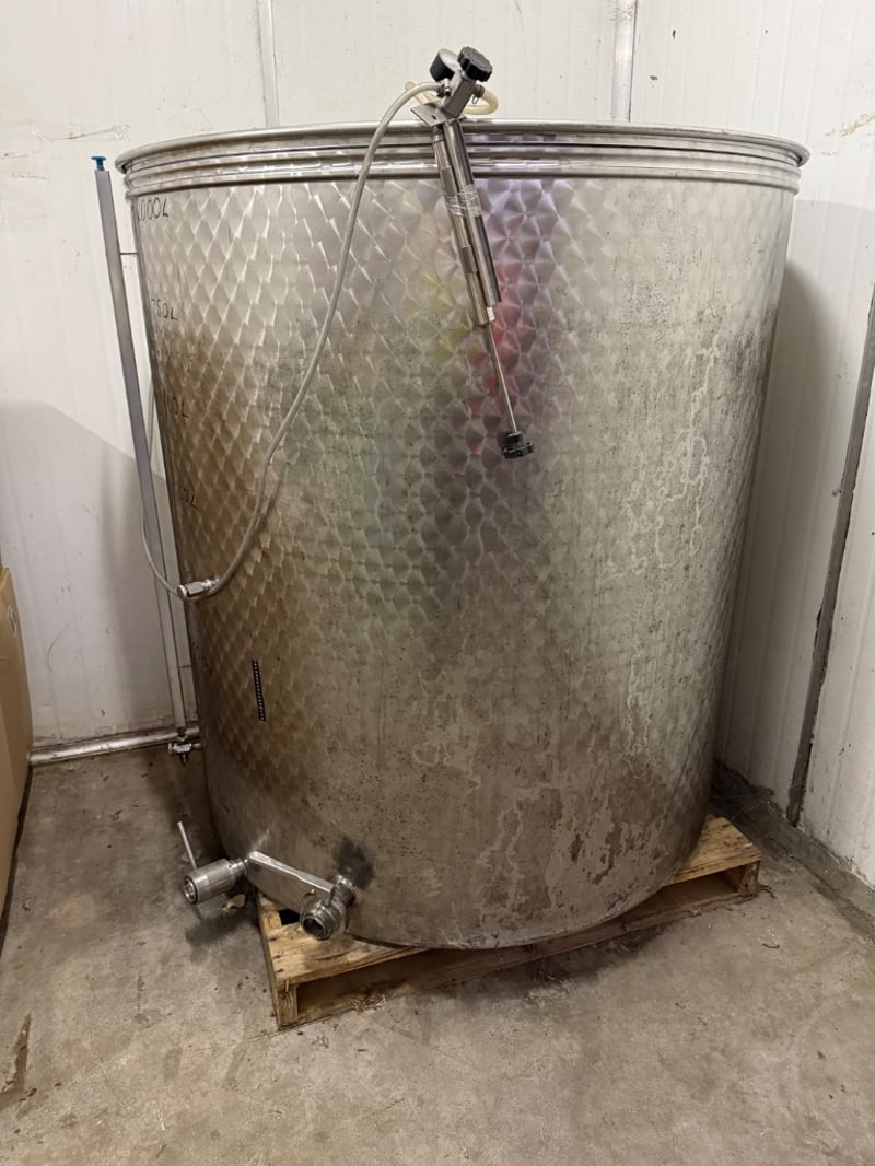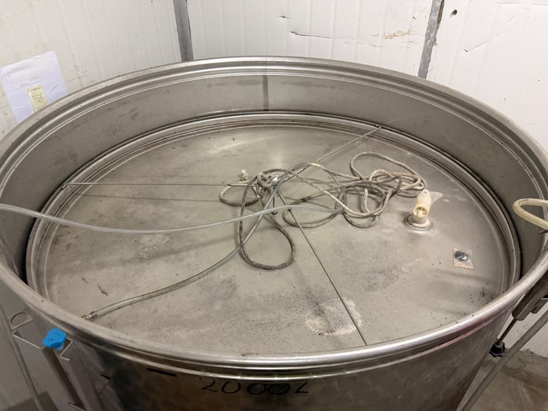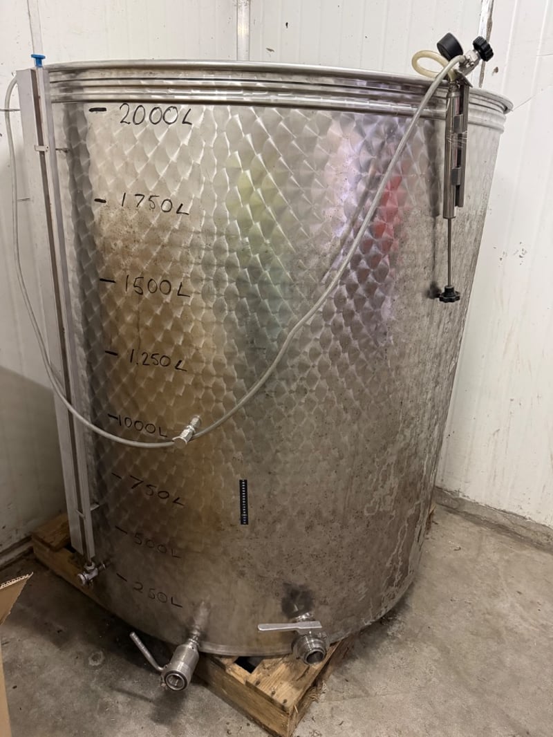 Stainless steel cylindrical fermentation or storage tank with 2000L capacity. Features embossed volume markings (500L, 750L, 1000L, 1250L, 1500L, 1750L, 2000L) on exterior. Equipped with top-mounted spray ball valve assembly with dual control handles, bottom outlet valve with ball cock, and side sampling/drain port. Includes internal coil tubing system visible through transparent sections. Tank mounted on wooden pallet base. Diamond plate embossed exterior finish. Industrial-grade construction suitable for beverage production, brewing, or chemical storage applications. Untested, sold as it.Approx. Dimensions: 160H x 140W x 140DNote: Buyer to bring appropriate tools/ equipment to remove.