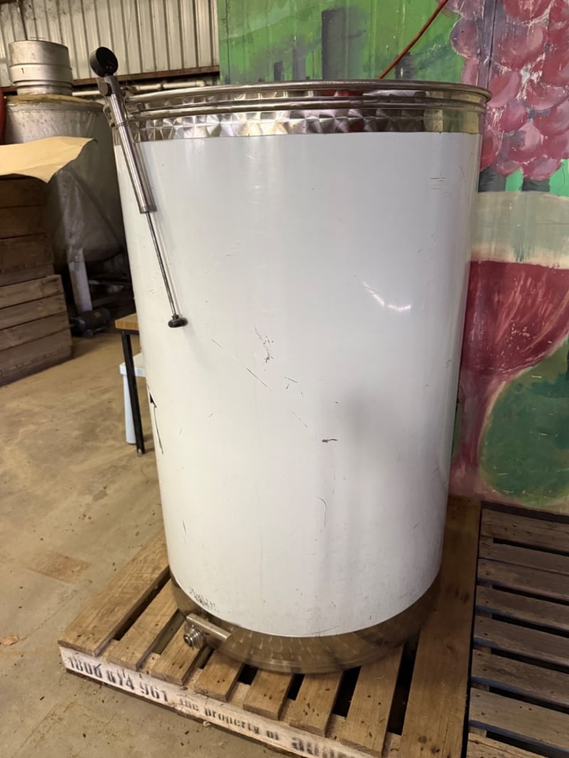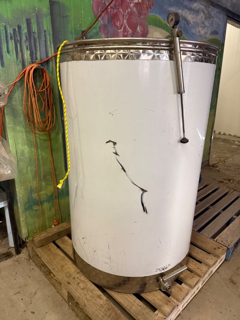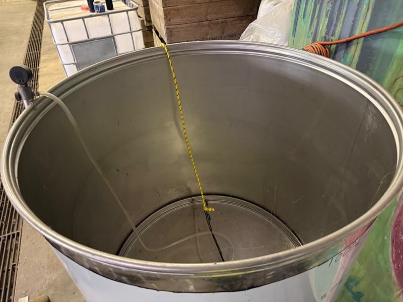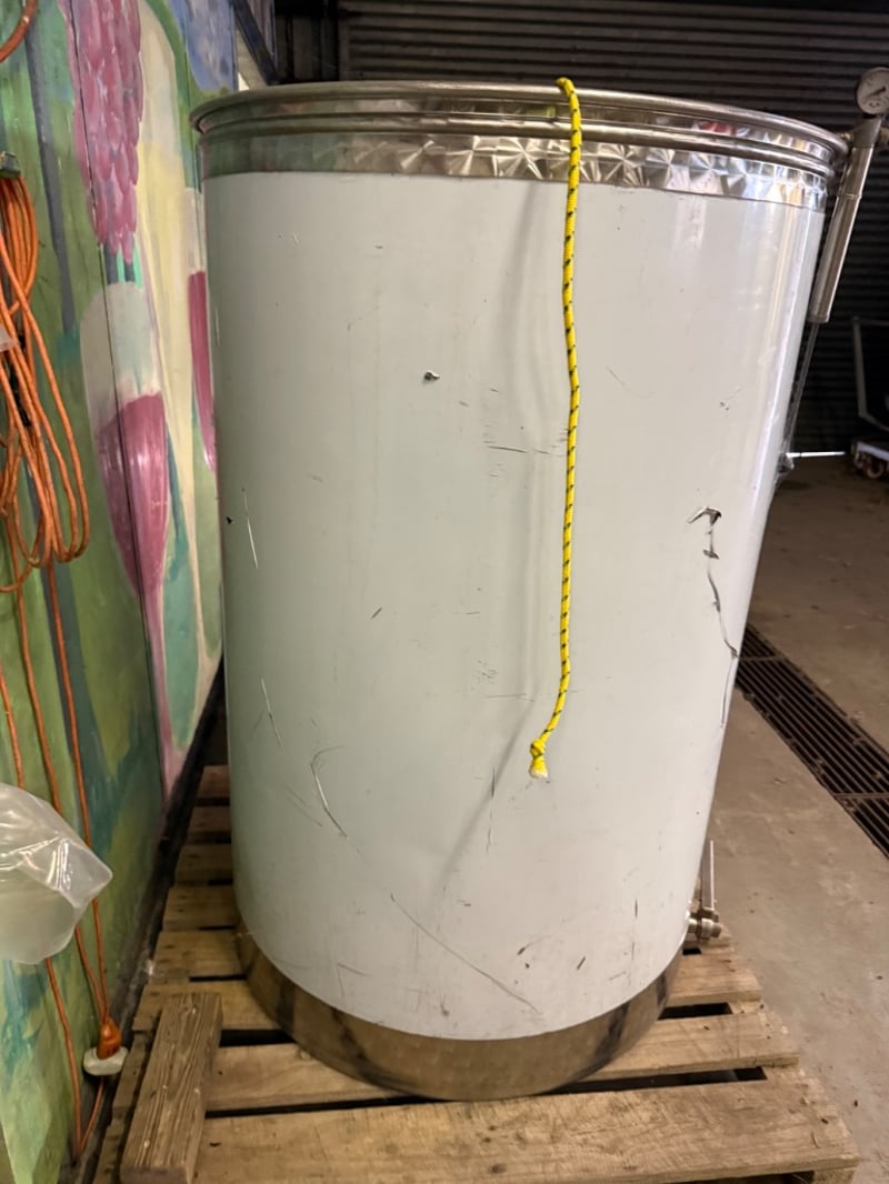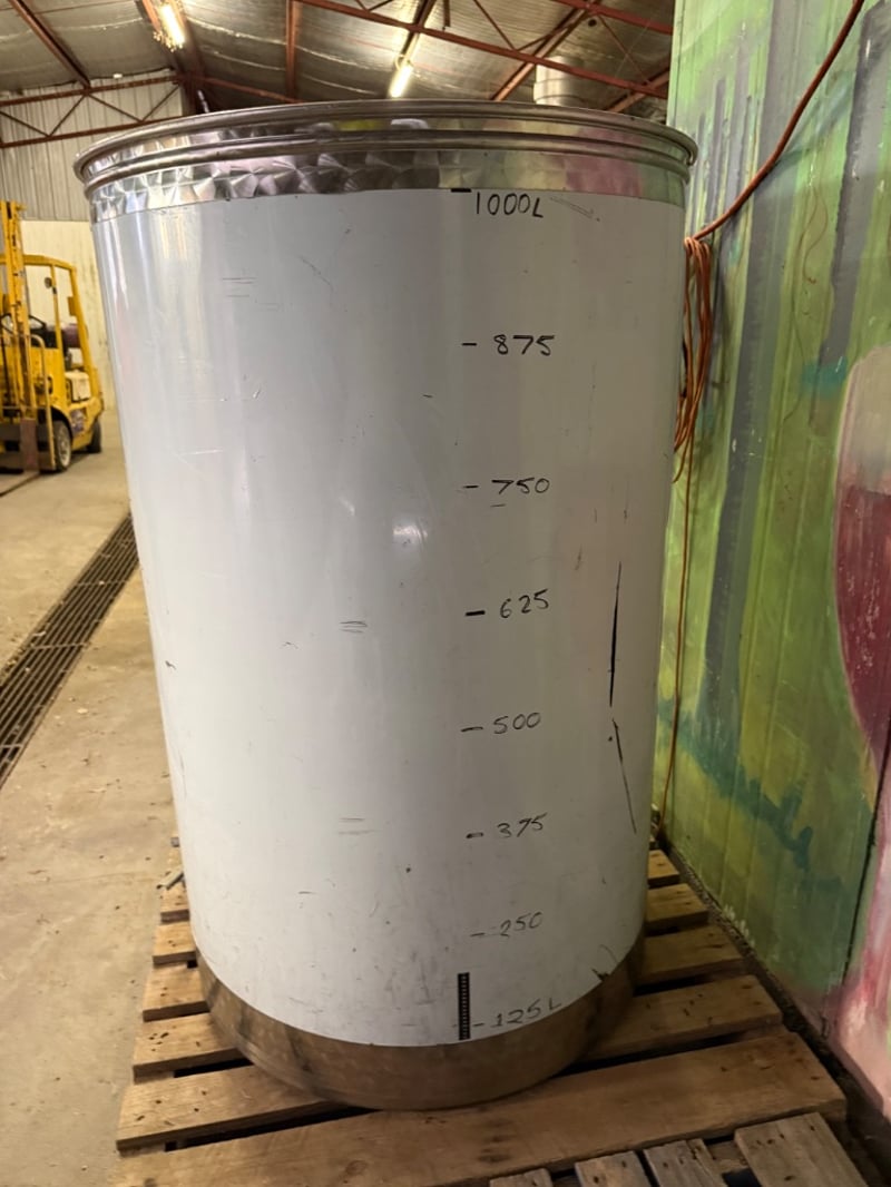 Stainless steel cylindrical storage tank with capacity markings. Features welded construction with polished stainless steel body and decorative banded rim detail. Equipped with hinged top access lid, internal measurement scale (ranging 125L to 1000L), and drainage valve at base. Includes securing straps and rope rigging for transport. Tank shows minor surface scratches and wear consistent with industrial use. Suitable for liquid storage, brewing, or processing applications. Untested, sold as it.Approx. Dimensions: 98W x 98D x 150H cmNote: Buyer to bring appropriate tools/ equipment to remove.