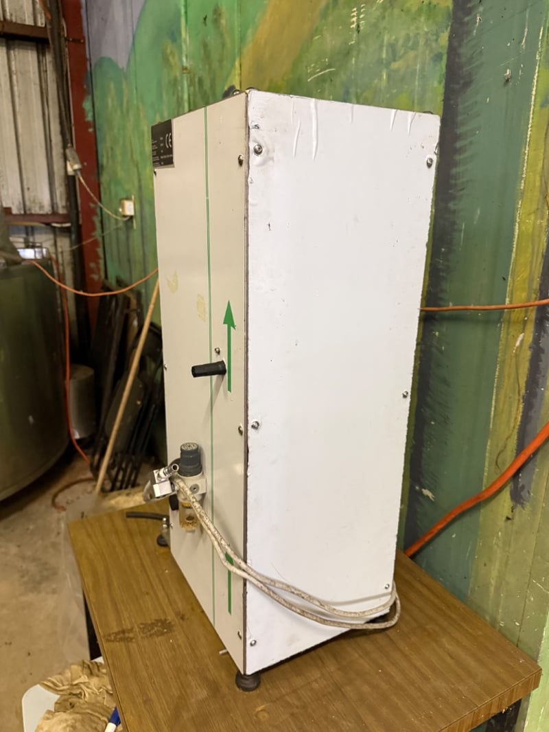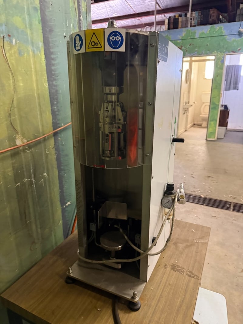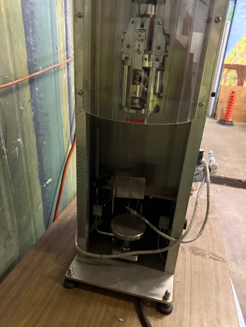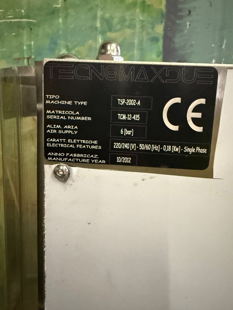 Tecnomax Due bench top capping machine used for sealing bottles. Model: TSP-2002-A, manufactured in October 2012. Untested, sold as it.Approx. Dimensions: 85H x 35W x 45D cm
