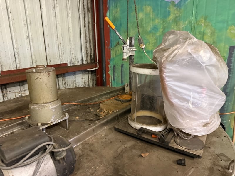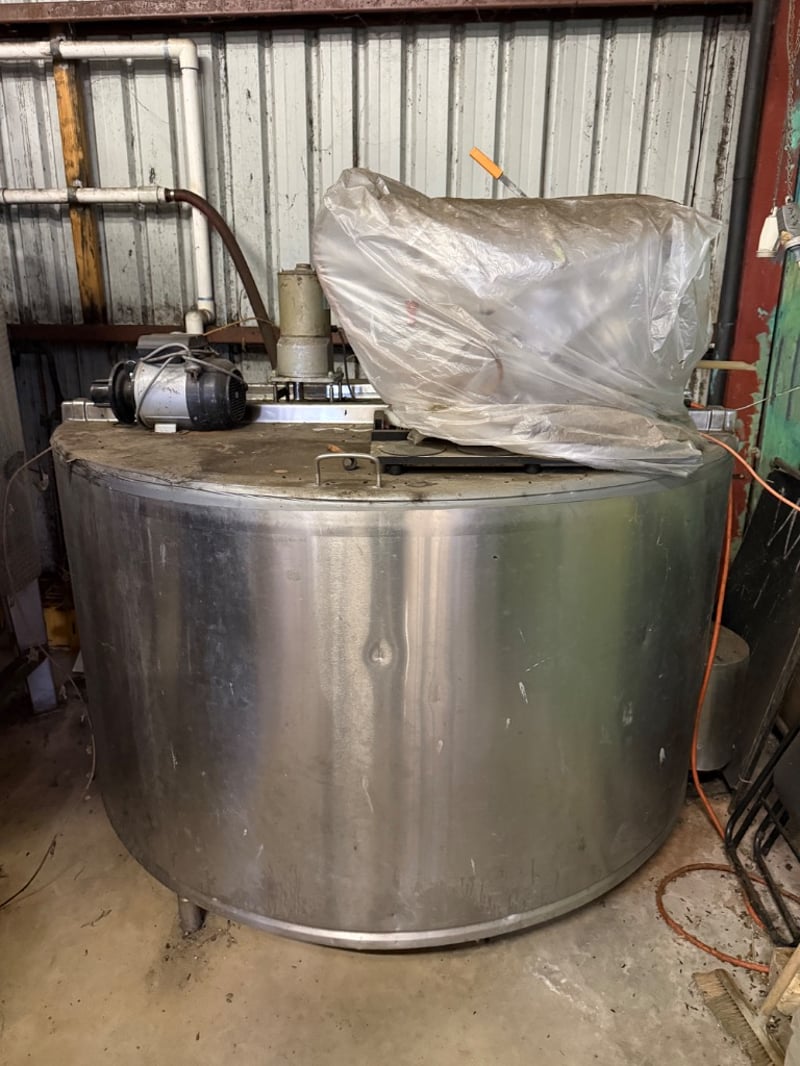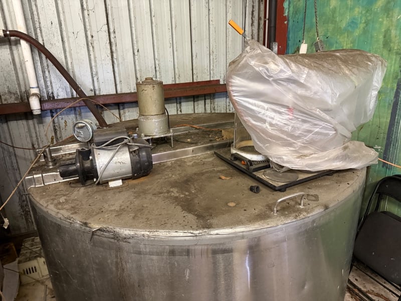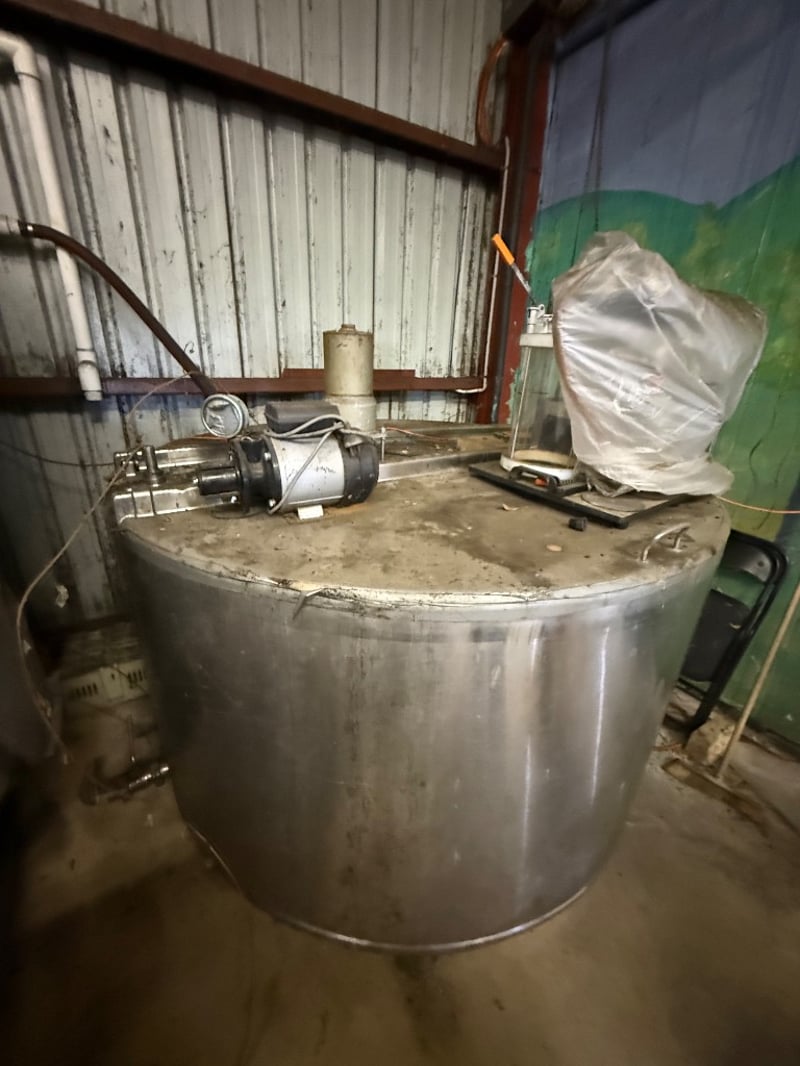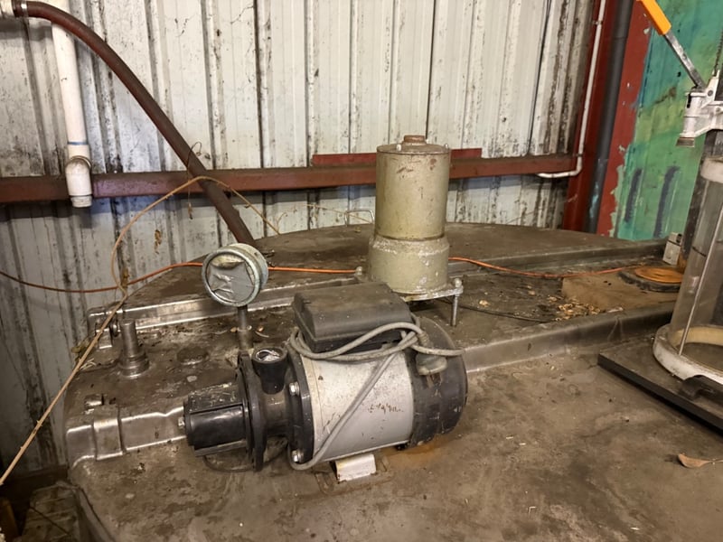 Industrial stainless steel mixing tank with integrated pump system. Large cylindrical vessel featuring a flat base and top-mounted control panel. Equipped with electric motor-driven centrifugal pump and brass/steel piping infrastructure. Includes overhead support frame with structural steel beams and suspension hardware. Suitable for chemical processing, dairy, beverage production, or agricultural applications. Tank shows signs of previous industrial use with surface patina consistent with age and operational history. Untested, sold as it.Approx. Dimensions: 158H x 170W x 170D cmNote: Buyer to bring appropriate tools/ equipment to remove.
