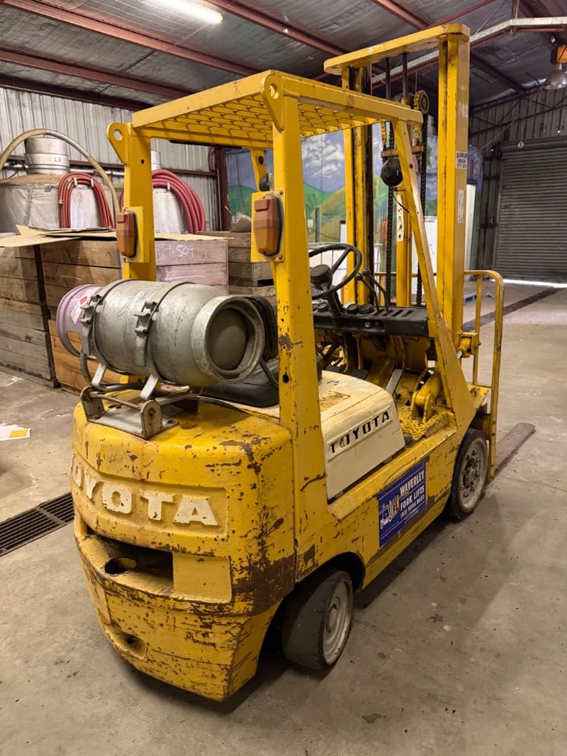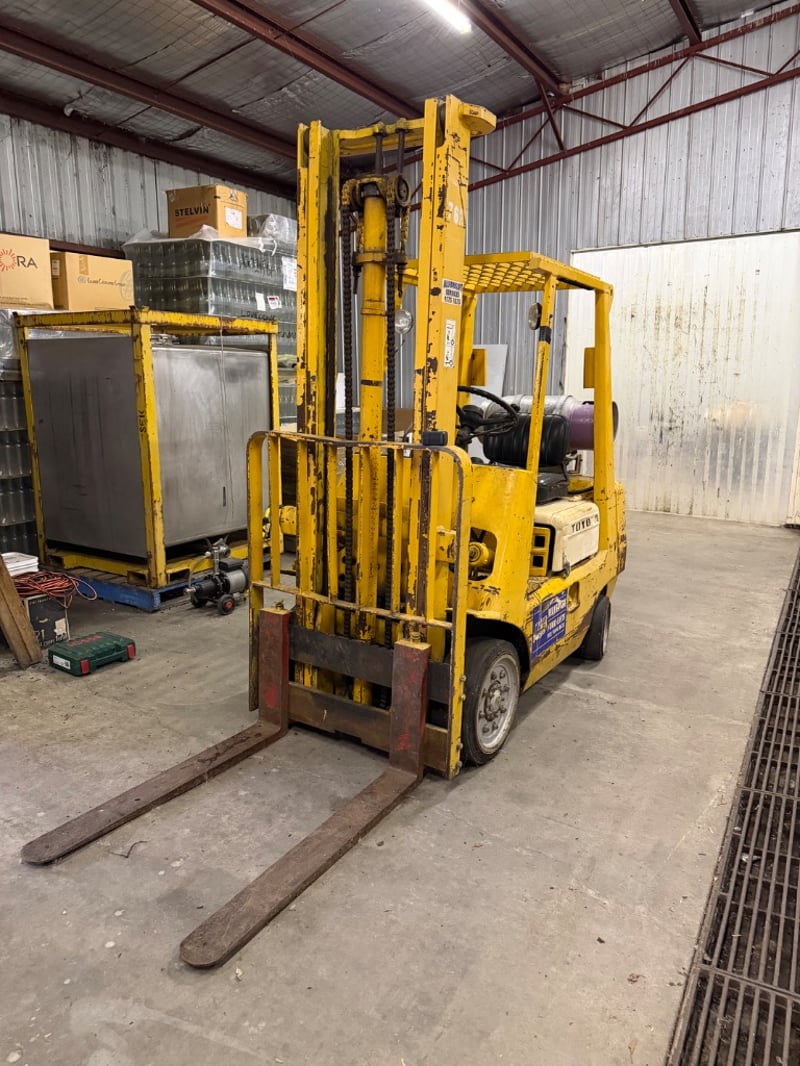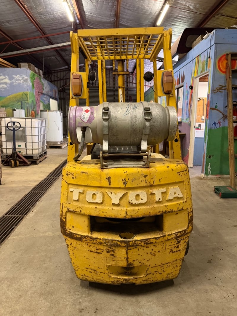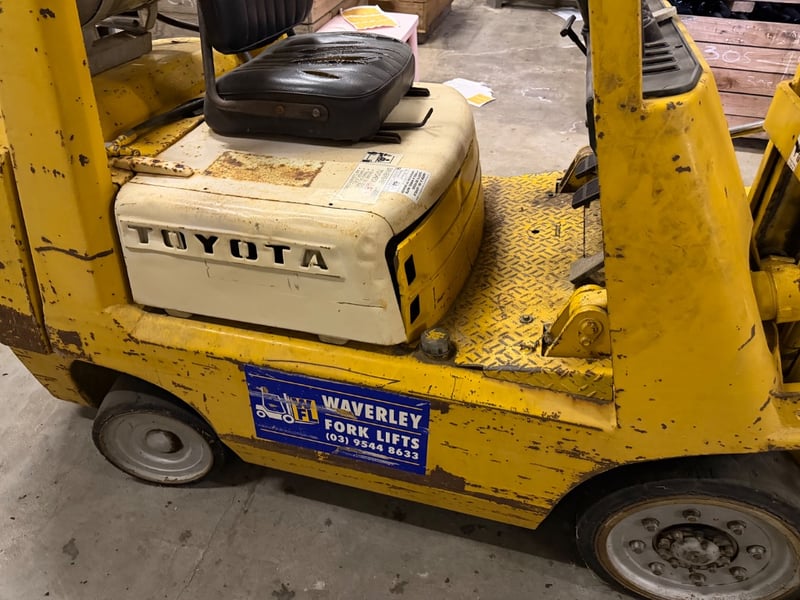 Toyota forklift. The unit displays an hour meter reading of 3203.5 hours, indicating moderate usage. Key features include a hydraulic mast system with dual cylinders for load handling, pneumatic tires, and a spacious operator cabin with manual steering wheel. The forklift is equipped with a water temperature gauge and operational lift controls. The machine includes a concrete/cement barrel attachment capability, as evidenced by the securing mechanisms visible on the load platform. Waverley Fork Lifts branding is present on the side panel. The unit appears mechanically sound with functional hydraulic systems and operational controls intact. Suitable for warehouse, construction, or industrial material handling applications. Untested, sold as it.Note: Buyer to bring appropriate tools/ equipment to remove.