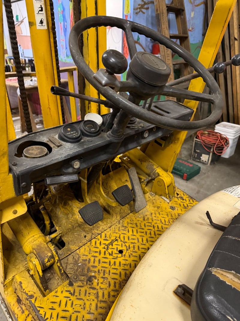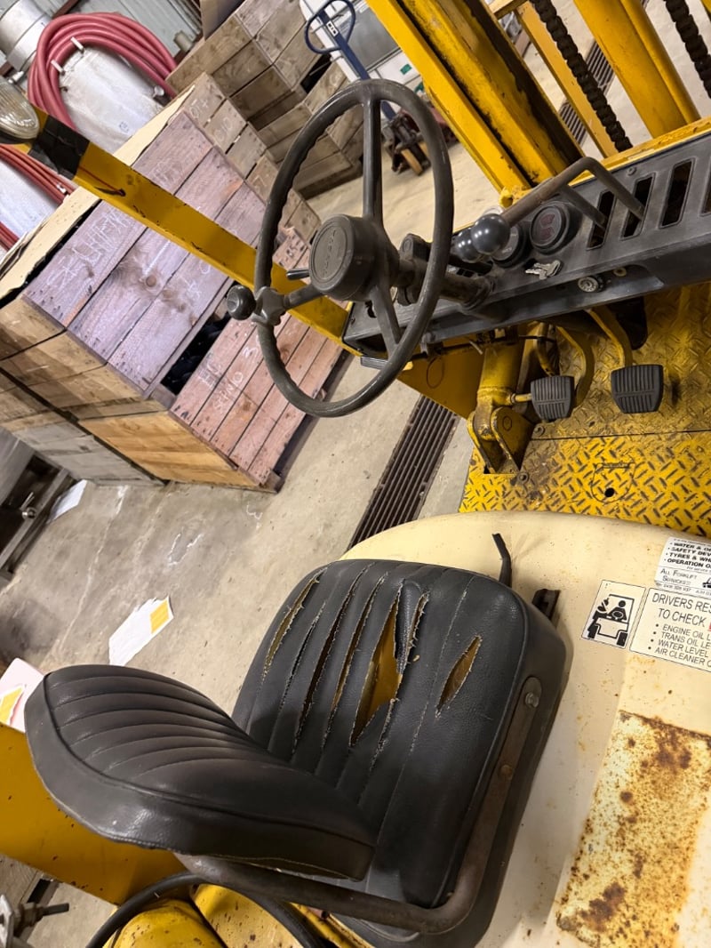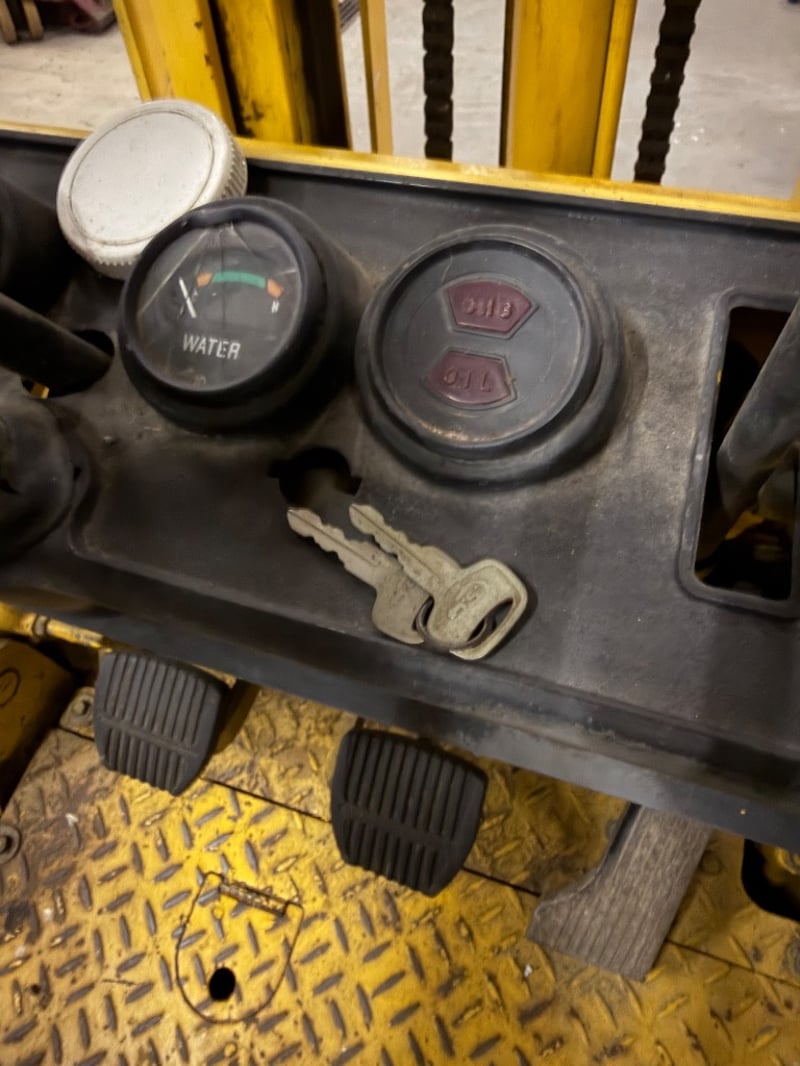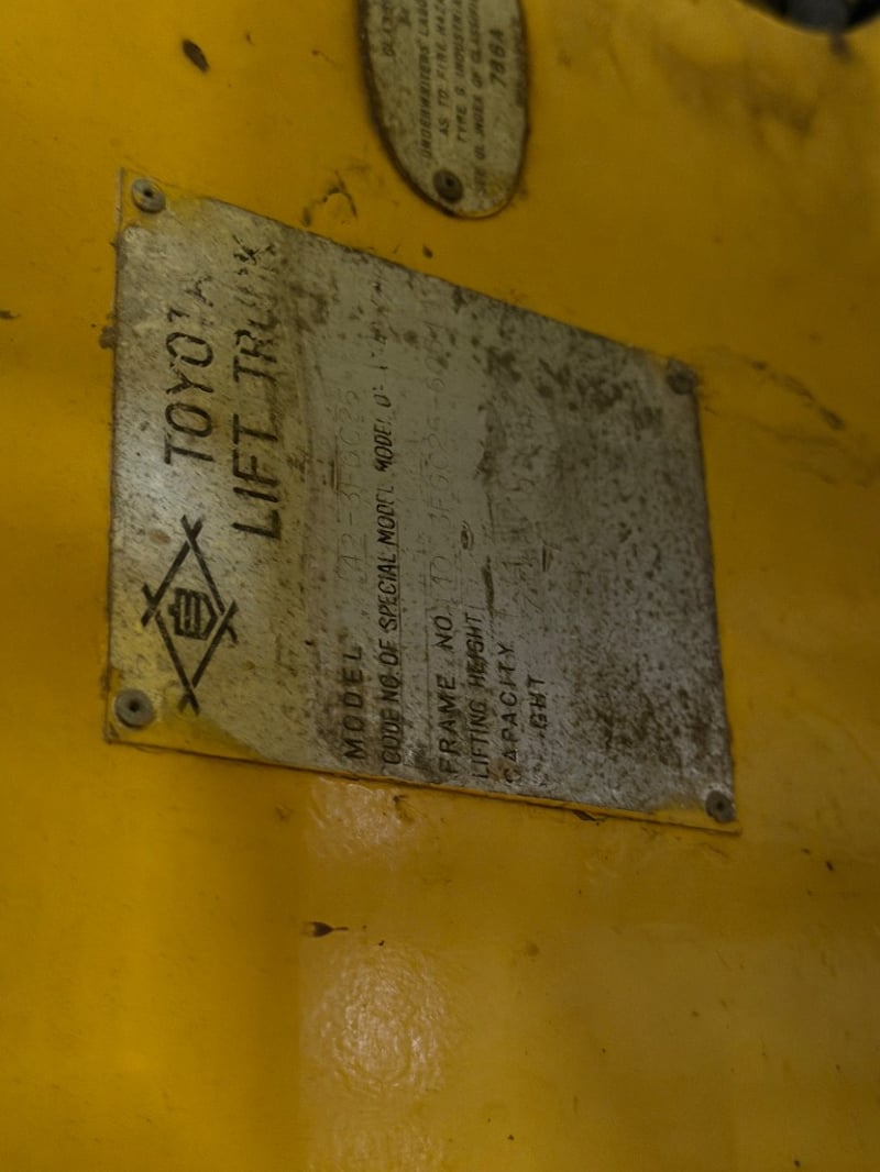 Toyota forklift. The unit displays an hour meter reading of 3203.5 hours, indicating moderate usage. Key features include a hydraulic mast system with dual cylinders for load handling, pneumatic tires, and a spacious operator cabin with manual steering wheel. The forklift is equipped with a water temperature gauge and operational lift controls. The machine includes a concrete/cement barrel attachment capability, as evidenced by the securing mechanisms visible on the load platform. Waverley Fork Lifts branding is present on the side panel. The unit appears mechanically sound with functional hydraulic systems and operational controls intact. Suitable for warehouse, construction, or industrial material handling applications. Untested, sold as it.Note: Buyer to bring appropriate tools/ equipment to remove.