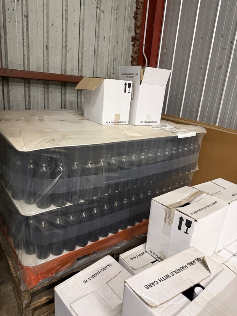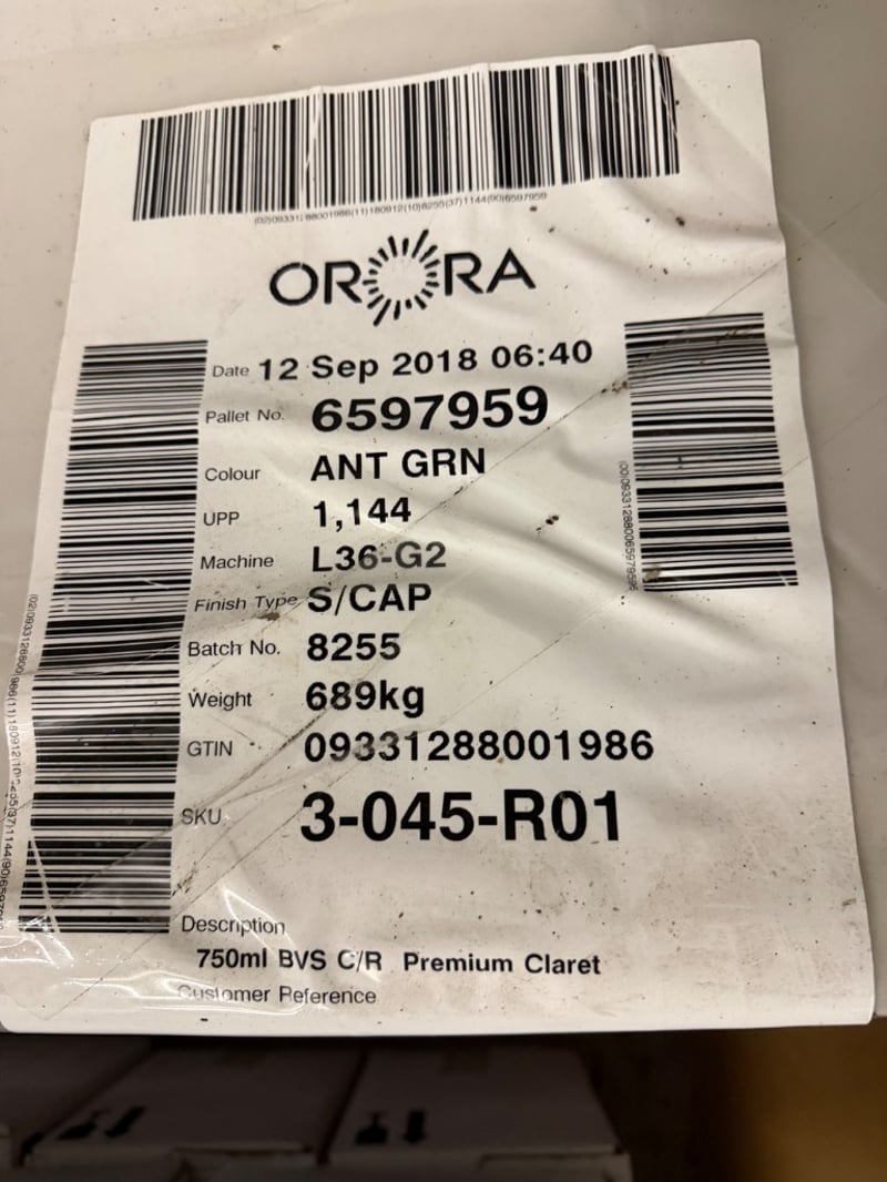 Pallet lot containing units of 750ml BVS C/R Premium Claret wine bottles in ant green finish with screw cap closure. Orora manufacturing batch 8255, produced 12 Sep 2018. Bottles are packaged in white cardboard cartons (12 x 750ml per carton) and wrapped in clear plastic on wooden pallet. Includes original production documentation with barcode labeling and pallet number 6597959. Suitable for wine retail, hospitality, or bulk distribution purposes.Sold as lot Note: Buyer to bring appropriate tools/ equipment to remove.