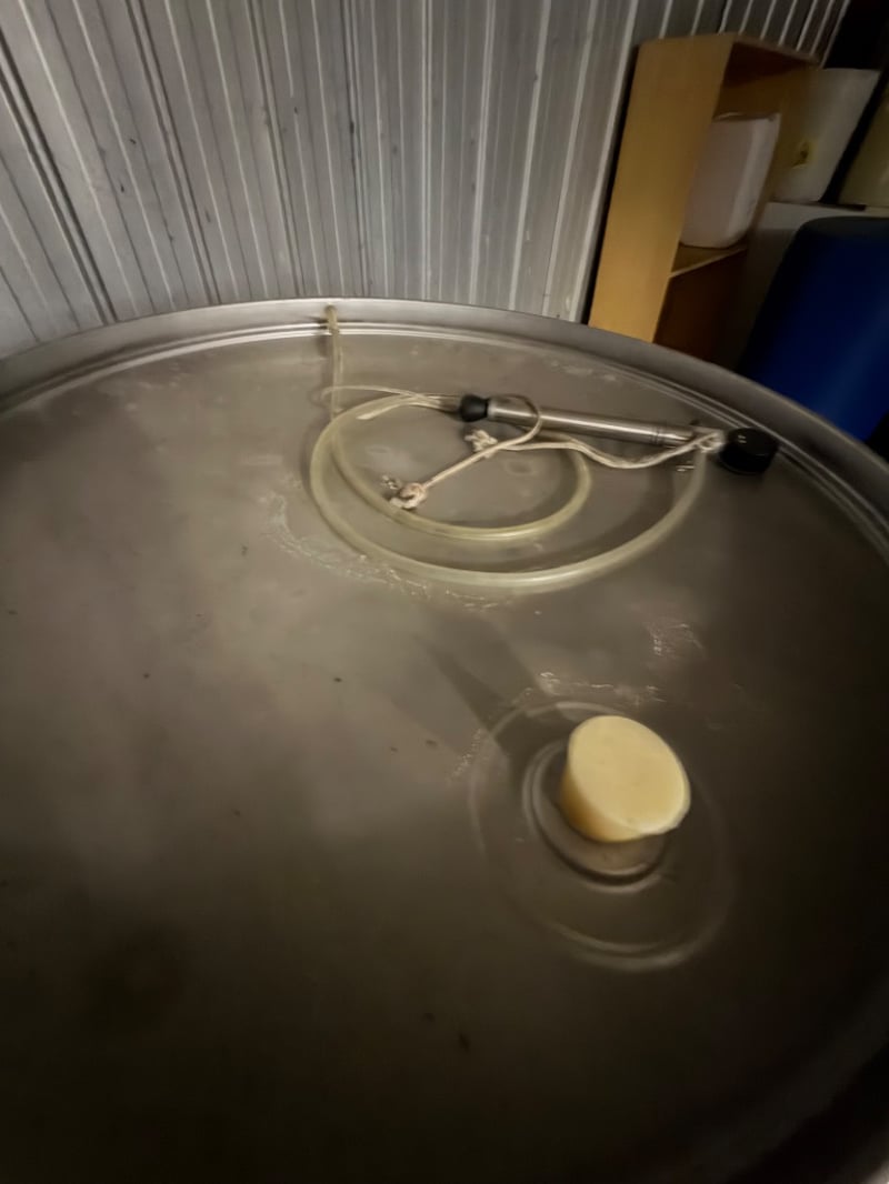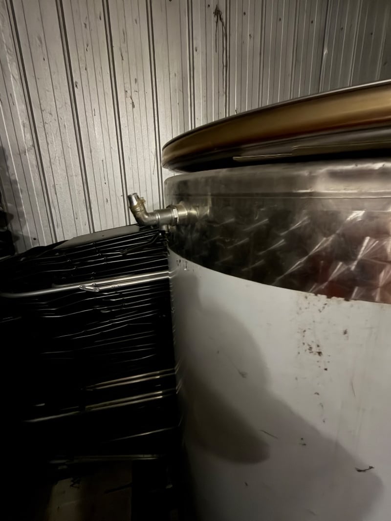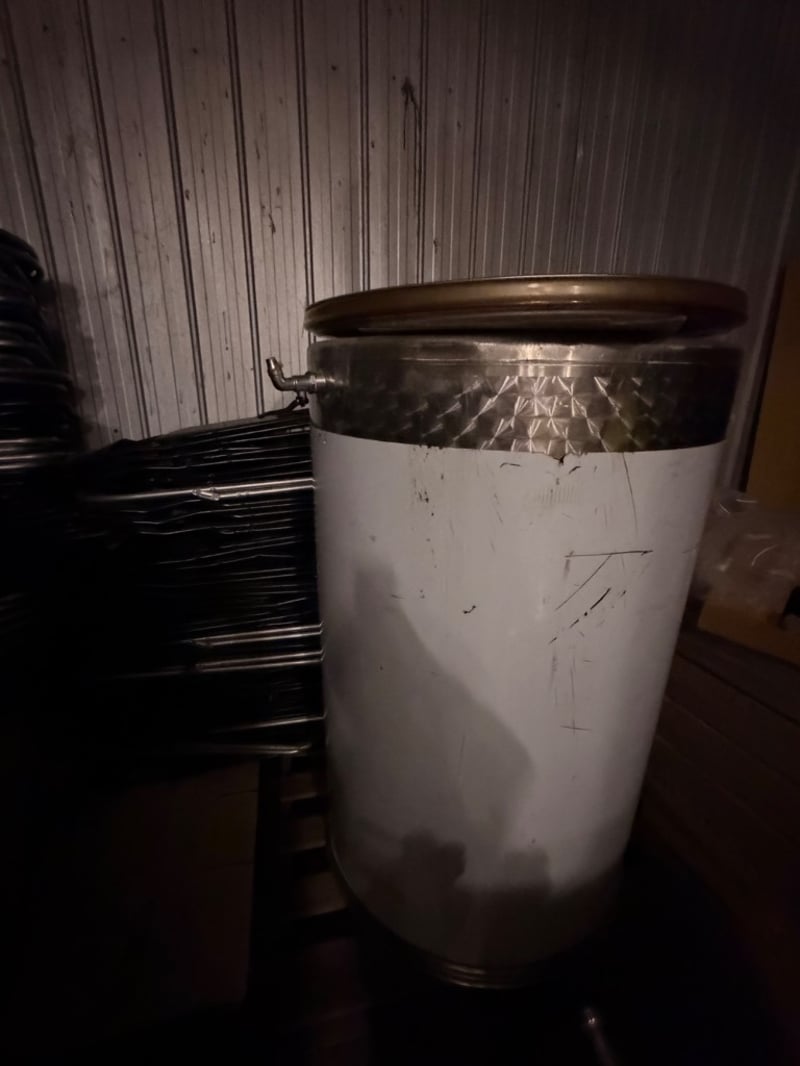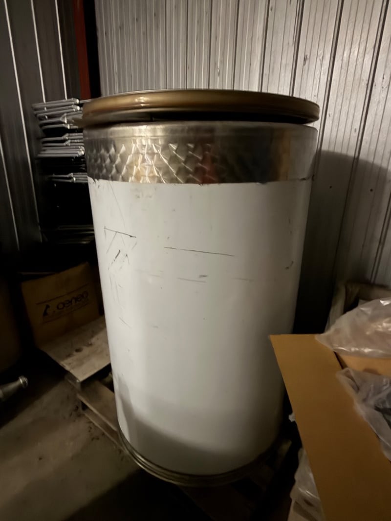 Stainless steel cylindrical storage vessel with white polyethylene lower section and brushed metal upper band. Features a fitted lid with integral handle and a brass ball valve outlet tap positioned on the side. Internal inspection reveals a coiled inlet tube with electrical connection point and a central outlet fitting. The container shows signs of industrial use with surface scratches and minor wear marks. Suitable for liquid storage, mixing, or processing applications. Appears to be a commercial-grade tank with capacity for substantial volume.Approximately Dimensions: 160Hx95Wx95D cmNote: Buyer to bring appropriate tools/ equipment to remove.