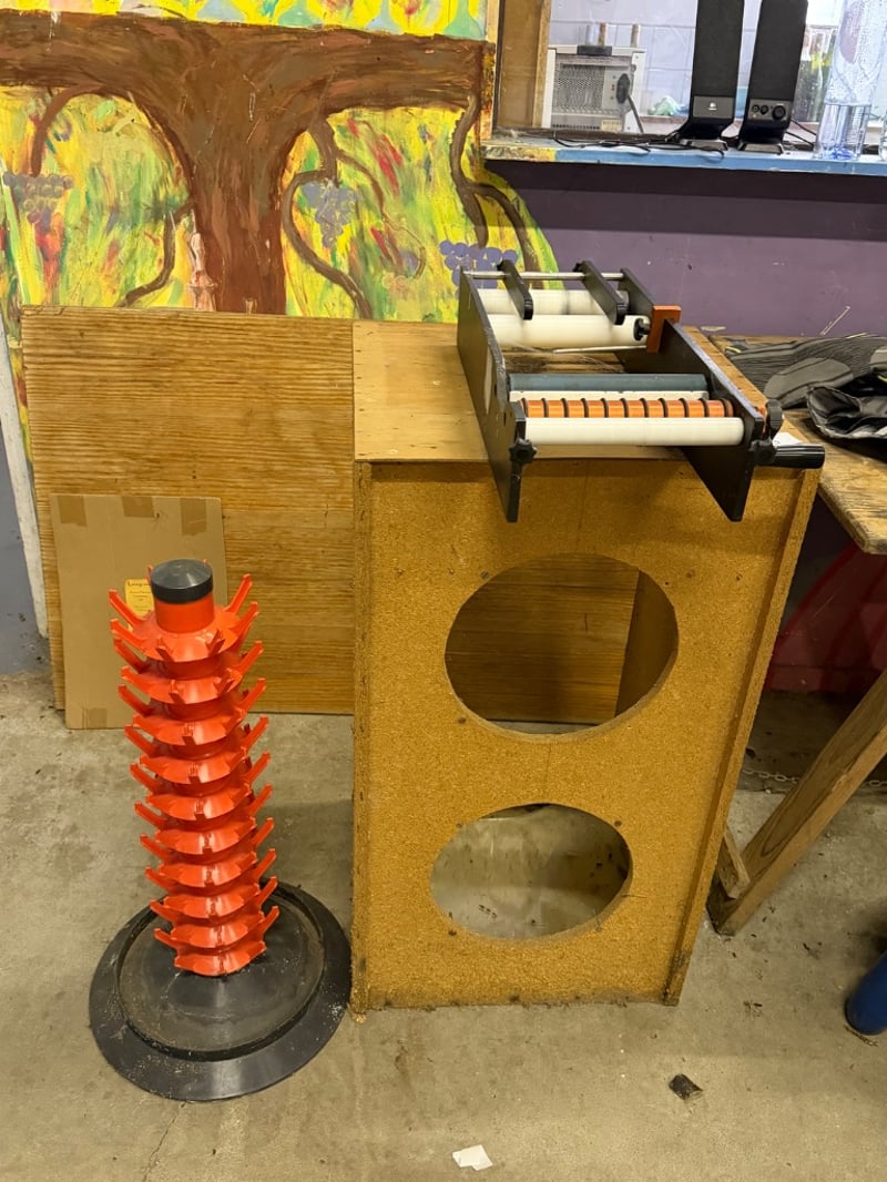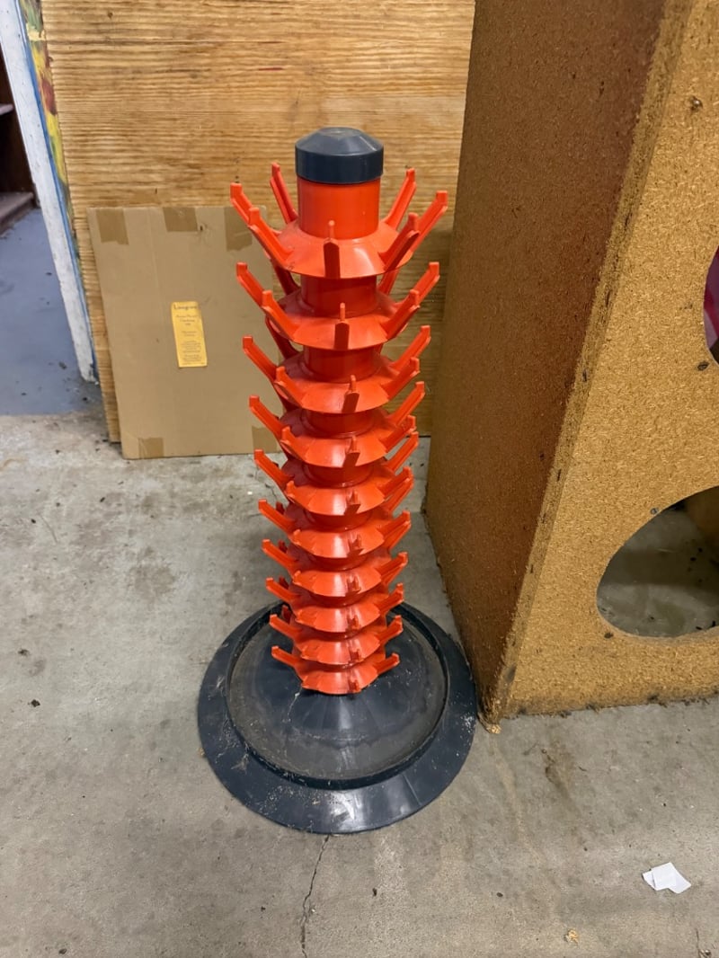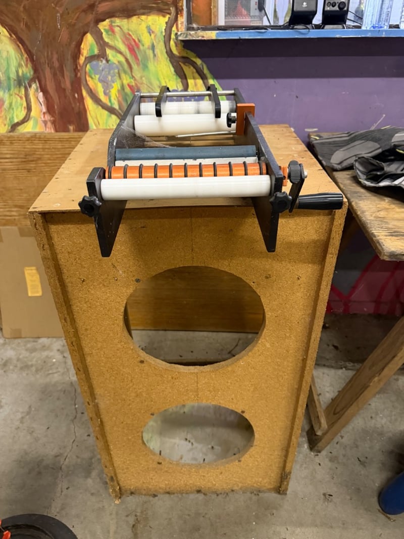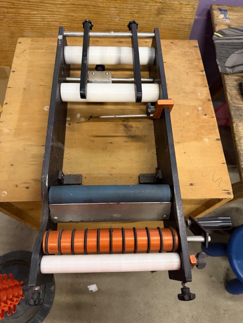 Manuel bottle labeling machine, designed for precise application of labels on round containers and bottle drying tree. Items show evidence of workshop use with minor surface wear and patina consistent with industrial equipment age. Untested, sold as it. SOLD AS LOT