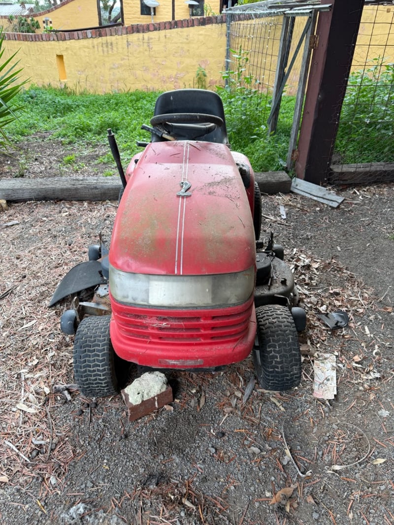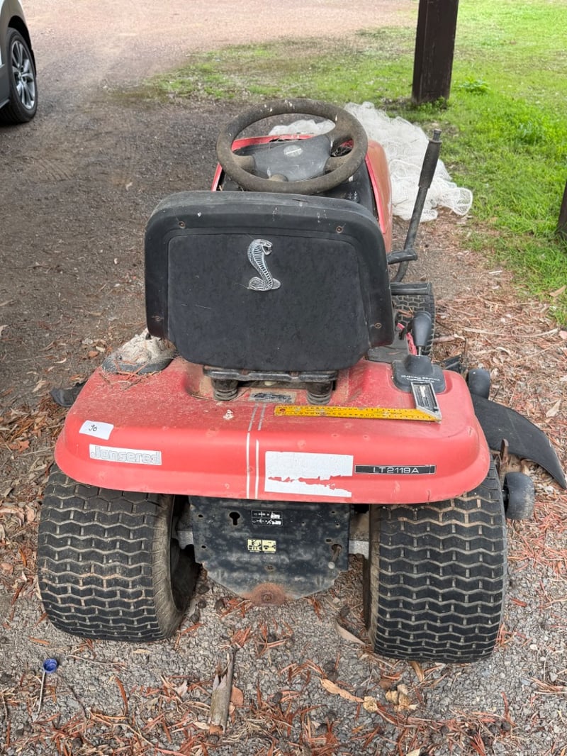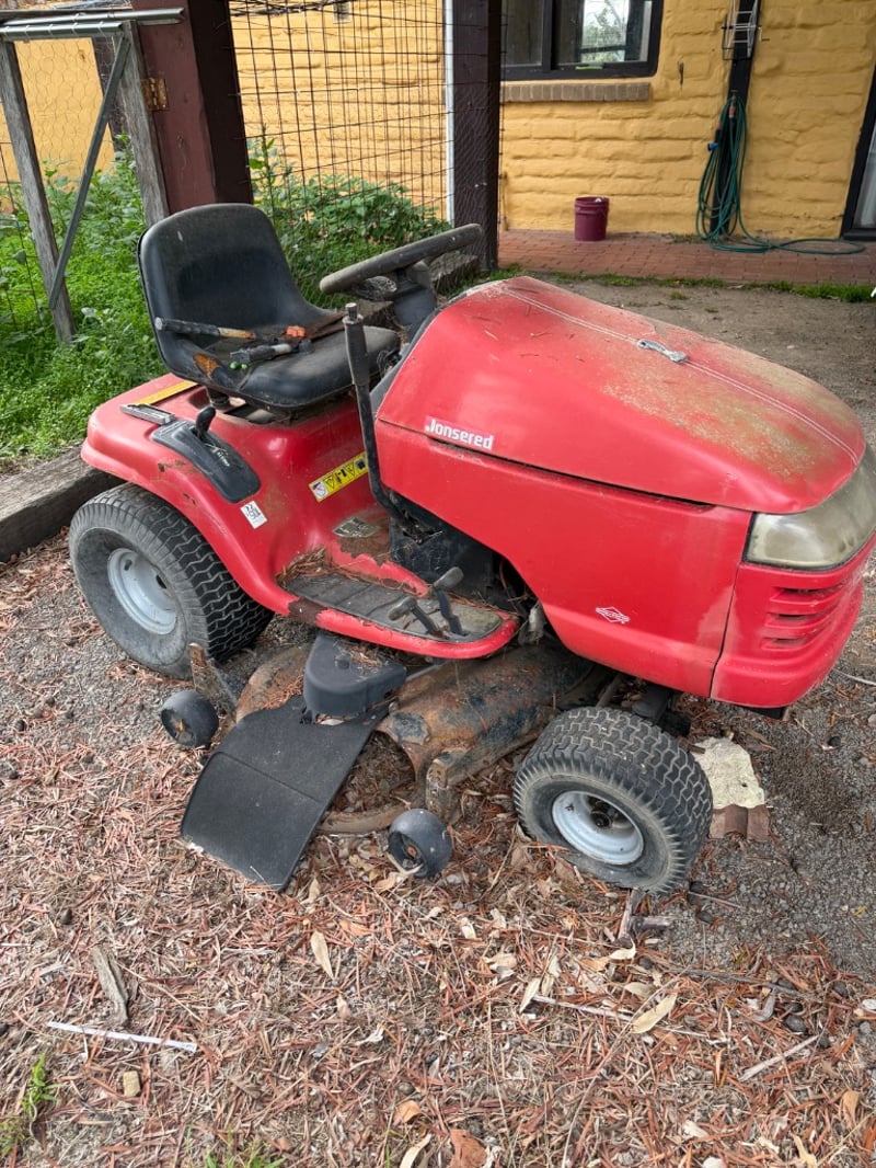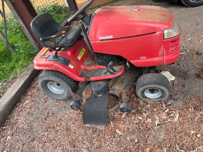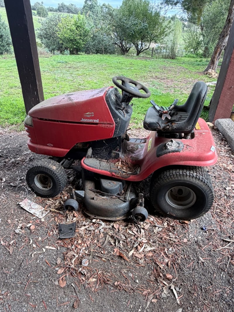 Jonsered LT2119A ride-on lawn mower, manufactured in USA (2003). Red and black colour scheme with Briggs & Stratton engine (245 kg, 2500 RPM).Mower shows significant weathering and rust patina consistent with extended outdoor storage. Mechanical condition requires assessment; engine start capability unknown. Suitable for restoration or parts recovery. Comes as pictured with visible wear throughout chassis, deck, and engine components.Approximately Dimensions: 110Hx175DX97W cmNote: Buyer to bring appropriate tools/ equipment to remove.