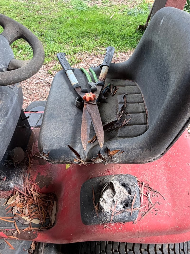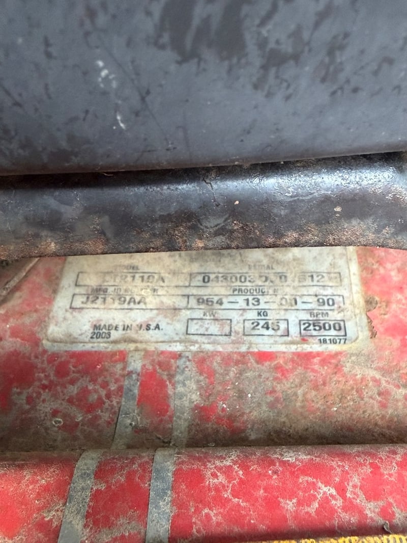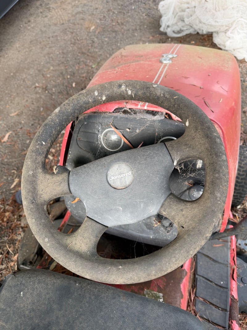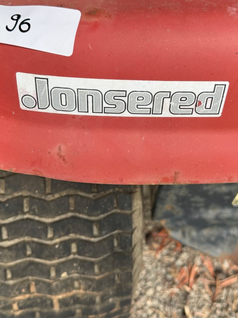 Jonsered LT2119A ride-on lawn mower, manufactured in USA (2003). Red and black colour scheme with Briggs & Stratton engine (245 kg, 2500 RPM).Mower shows significant weathering and rust patina consistent with extended outdoor storage. Mechanical condition requires assessment; engine start capability unknown. Suitable for restoration or parts recovery. Comes as pictured with visible wear throughout chassis, deck, and engine components.Approximately Dimensions: 110Hx175DX97W cmNote: Buyer to bring appropriate tools/ equipment to remove.