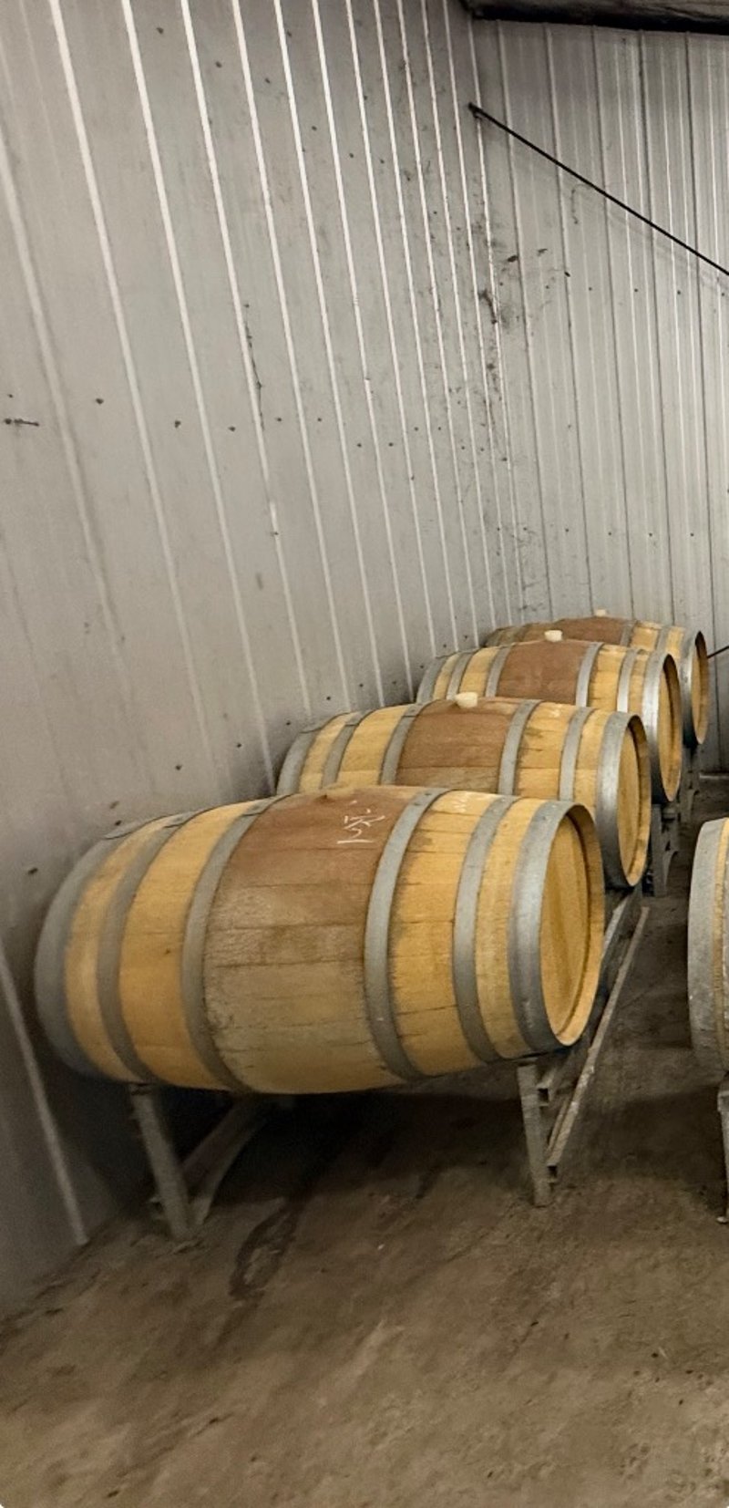 Four wooden wine barrels with metal bands, stored horizontally on steel stand. The barrels appear to be oak construction with brass or steel hooping. Suitable for wine production, storage, or decorative purposes. Barrels show signs of age and use with visible patina on the wood surfaces.Quantity: 4 Barrels and Stand, sold as lot.Note: Owner to bring appropriate tools/ equipment to remove.