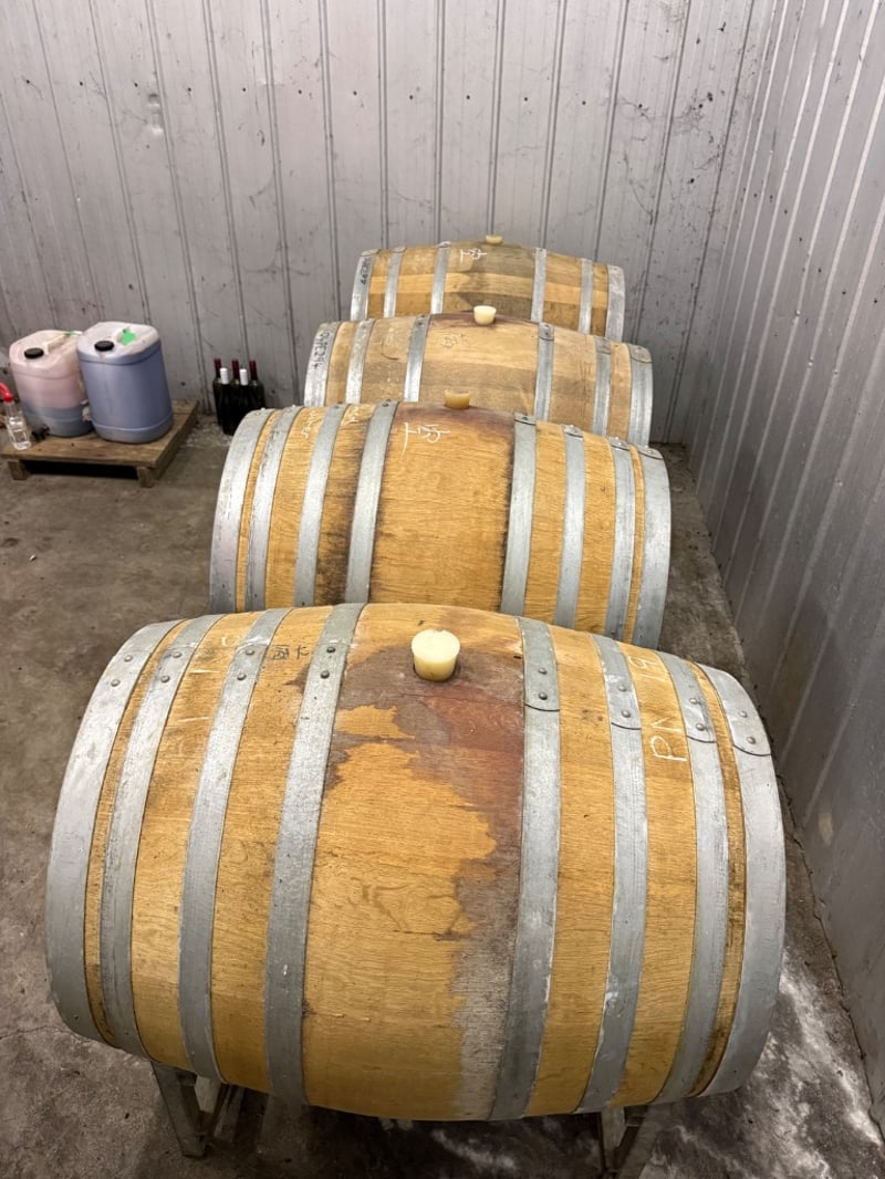 Four wooden wine barrels with metal bands, stored horizontally on steel stand. The barrels appear to be oak construction with brass or steel hooping. Suitable for wine production, storage, or decorative purposes. Barrels show signs of age and use with visible patina on the wood surfaces.