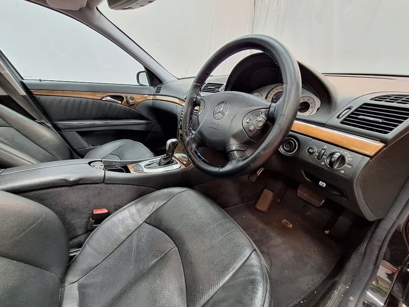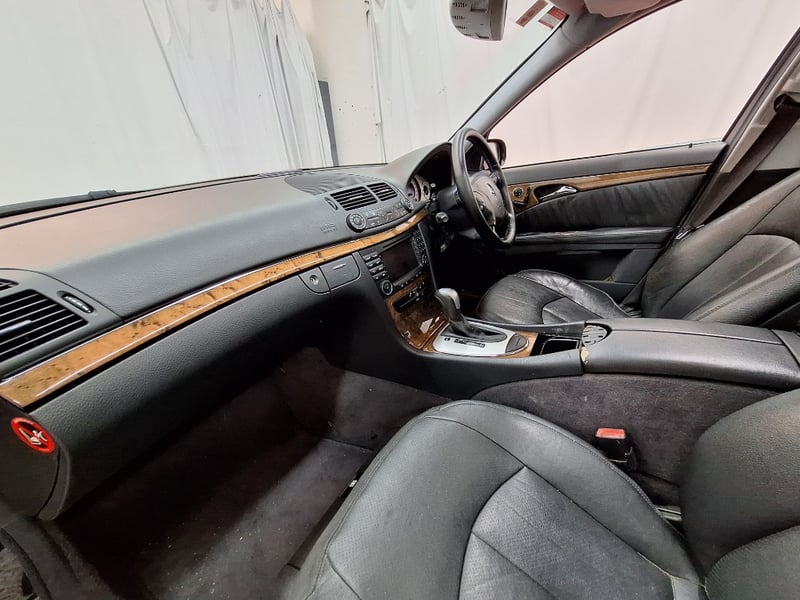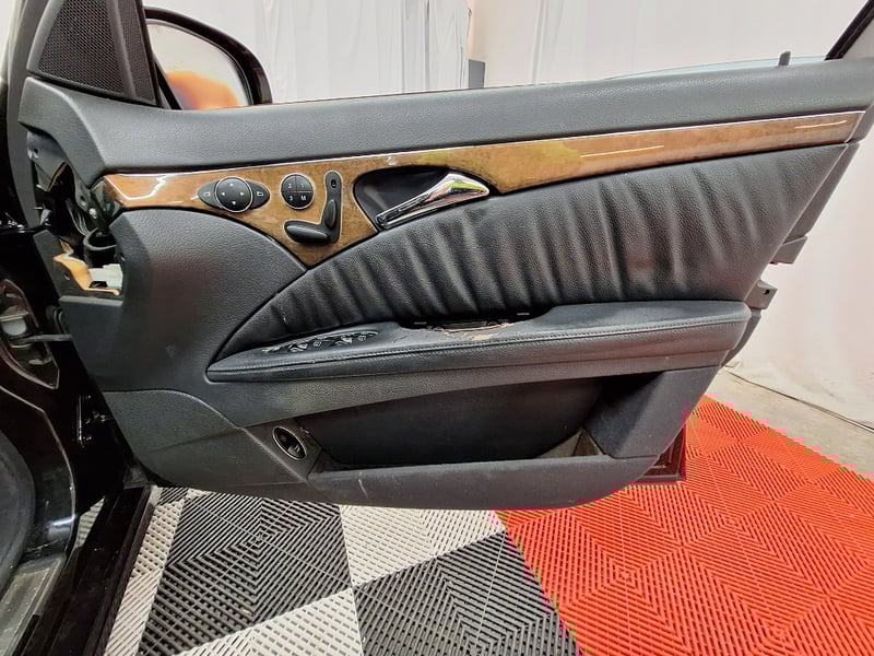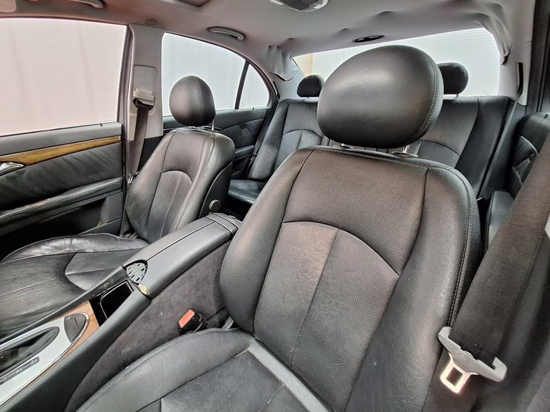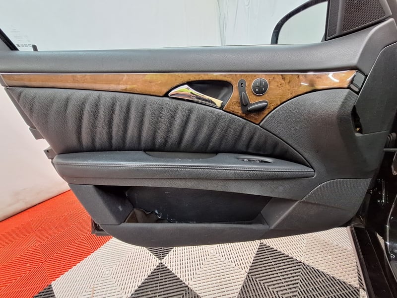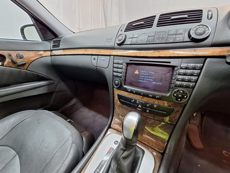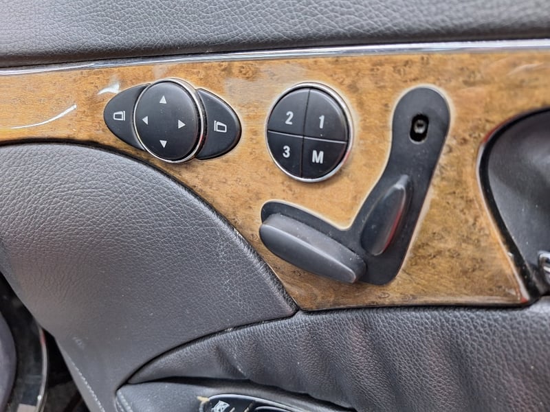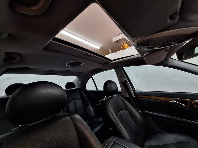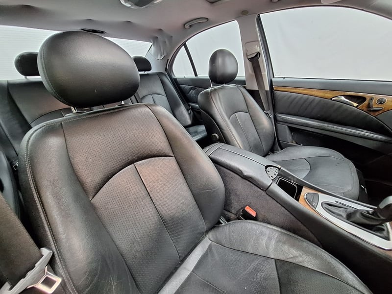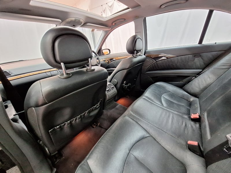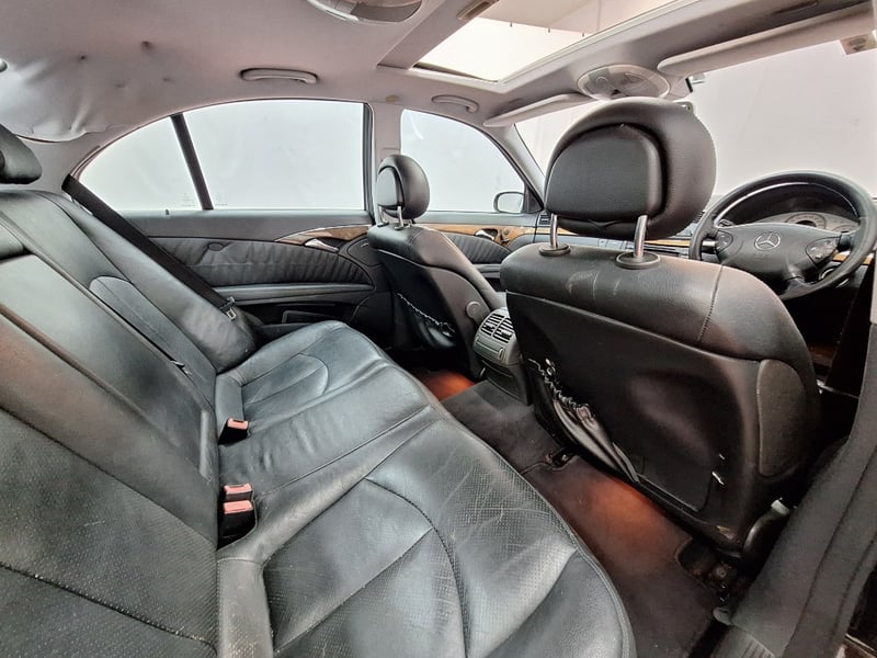 The interior reflects the vehicle's mileage honestly. The leather upholstery shows wear consistent with the kilometres, particularly on the door panels and steering wheel where contact is heaviest. The wood trim and dashboard remain intact with no major cracks or separation. Climate control, cruise control, and the multimedia system are present and functional. The sunroof operates smoothly. Scuff marks on the lower door sills are typical of this age and use pattern. The cabin retains the solid, well-appointed feel that made the W211 a favourite with fleet operators and private buyers alike.