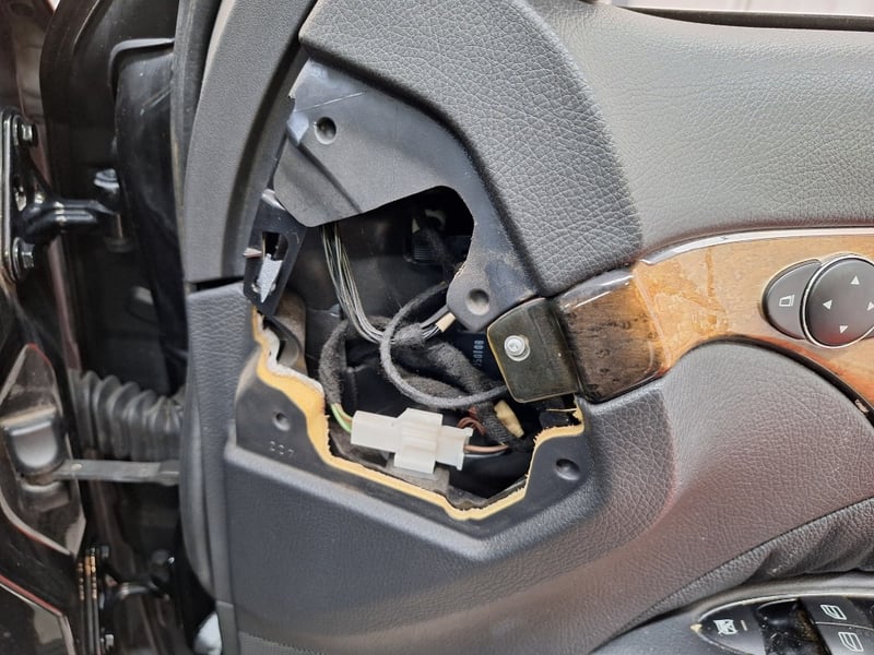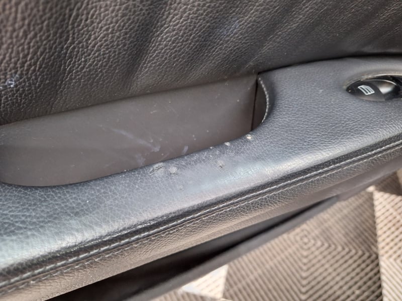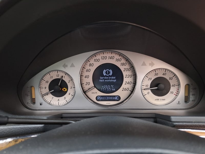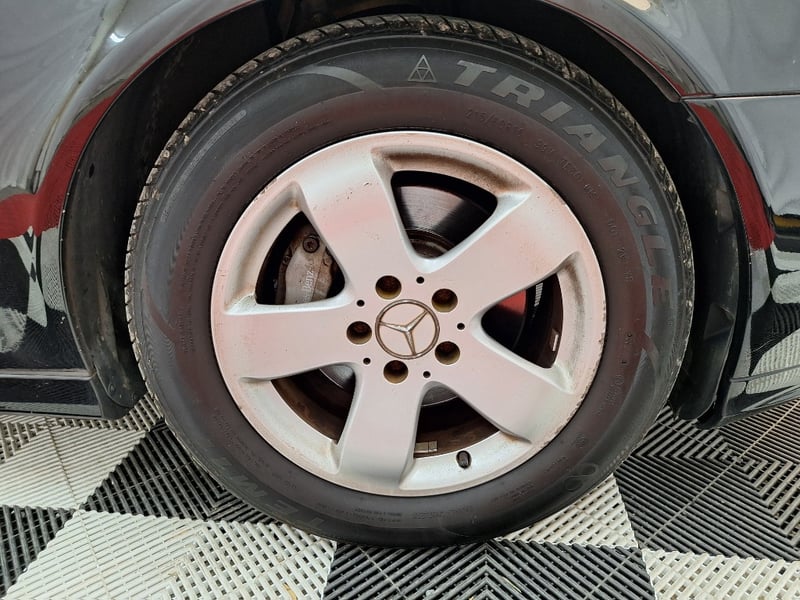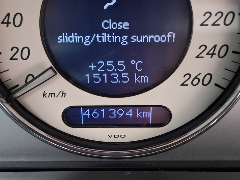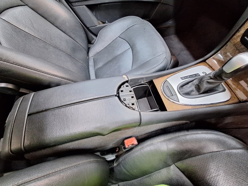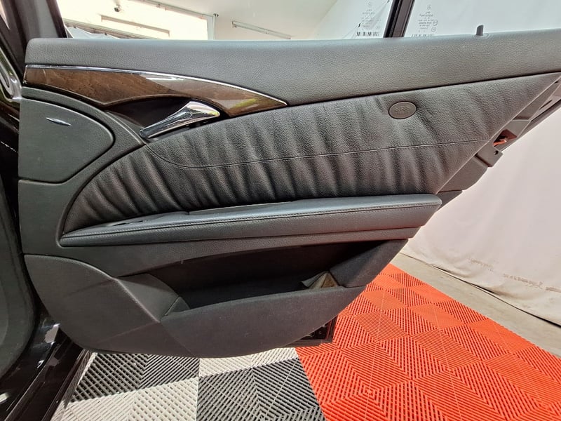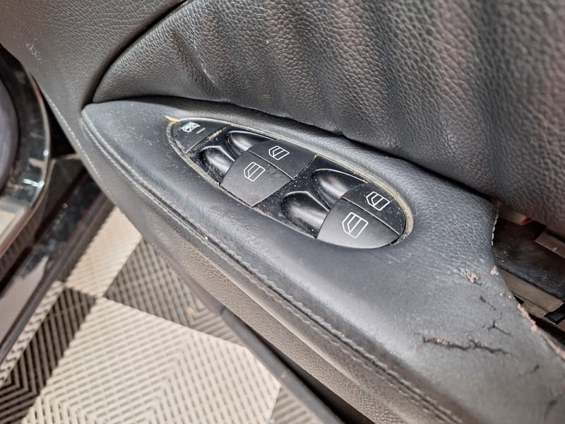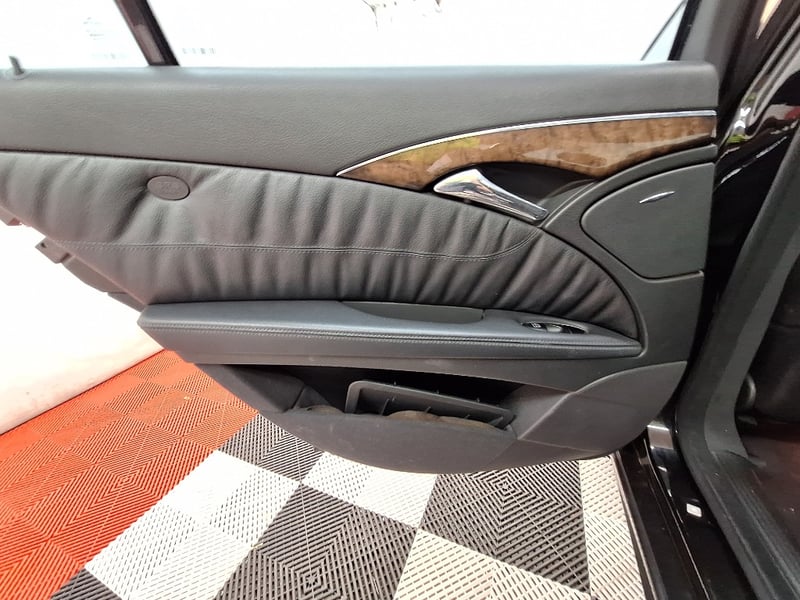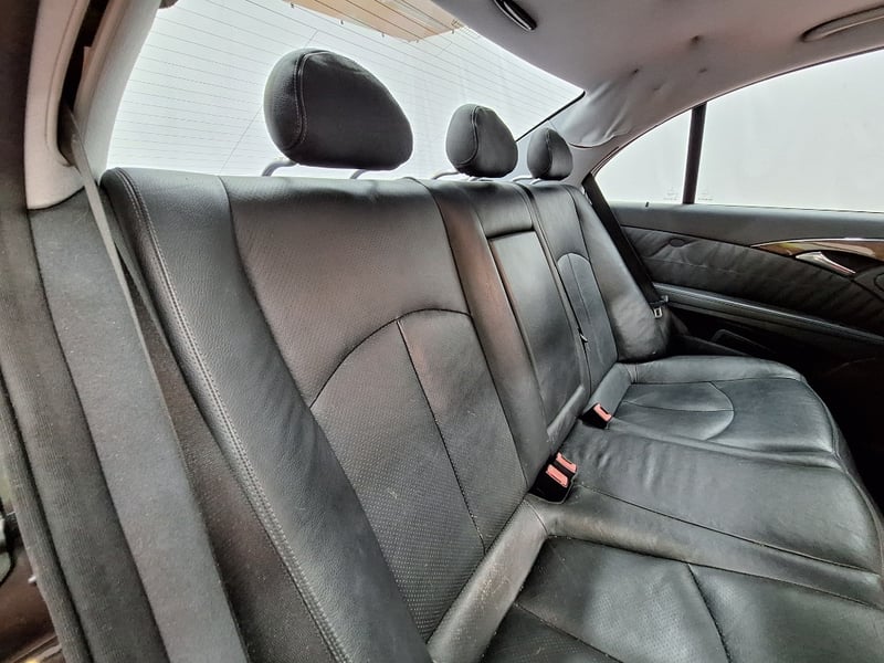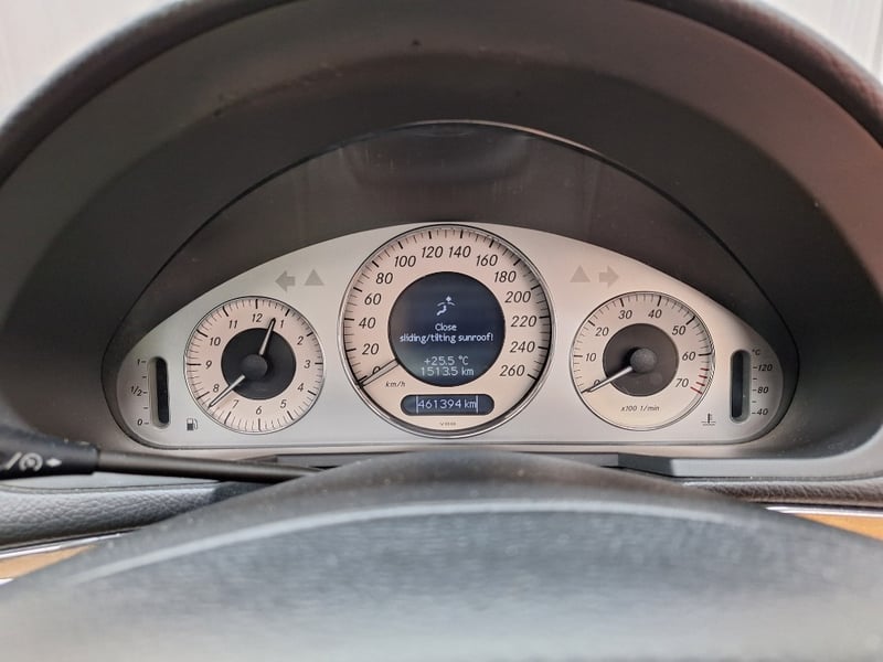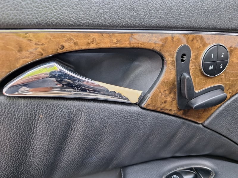 The interior reflects the vehicle's mileage honestly. The leather upholstery shows wear consistent with the kilometres, particularly on the door panels and steering wheel where contact is heaviest. The wood trim and dashboard remain intact with no major cracks or separation. Climate control, cruise control, and the multimedia system are present and functional. The sunroof operates smoothly. Scuff marks on the lower door sills are typical of this age and use pattern. The cabin retains the solid, well-appointed feel that made the W211 a favourite with fleet operators and private buyers alike.