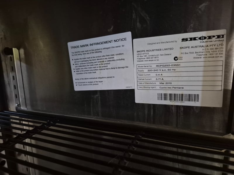 Skope under-bench freezer Model-Serial number: RCPG250-03551 Dimensions: H: 84cm W: 154cm D: 68.5cm