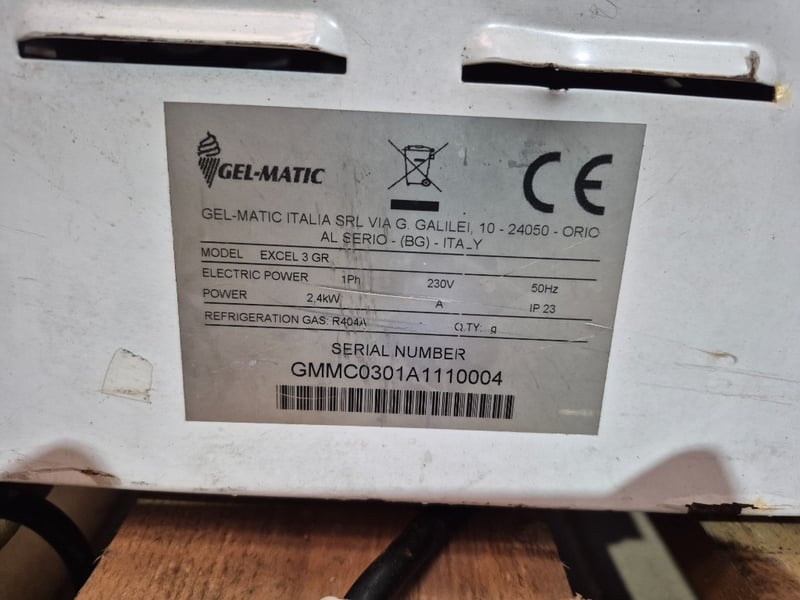 Gel-matic tabletop ice cream freezer Model: Excel 3 GR Serial number: GMMC0301A1110004 Dimensions: H: 75cm W: 49.5cm D: 70cm