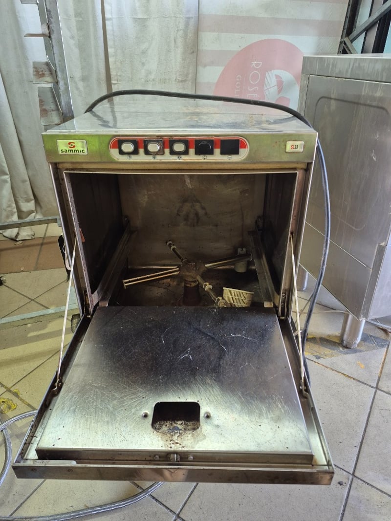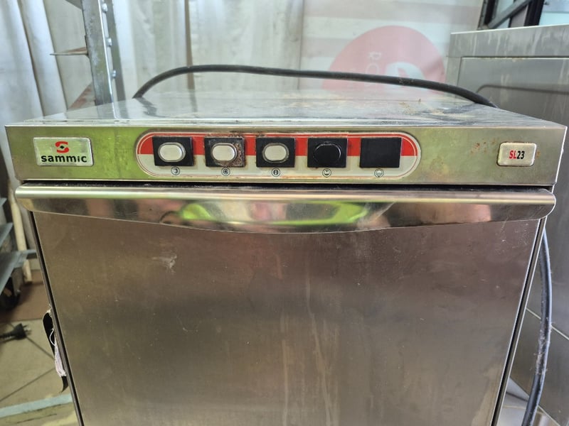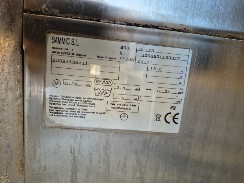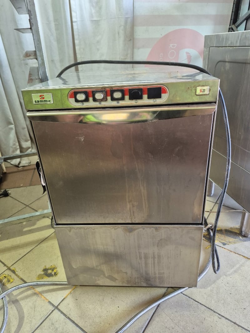 Sammic undercounter dishwasher Model: SL-23 Serial number: 13009601100027 Dimensions: H: 76cm W: 47cm D: 55cm Note: working order unknown, parts only
