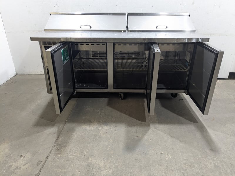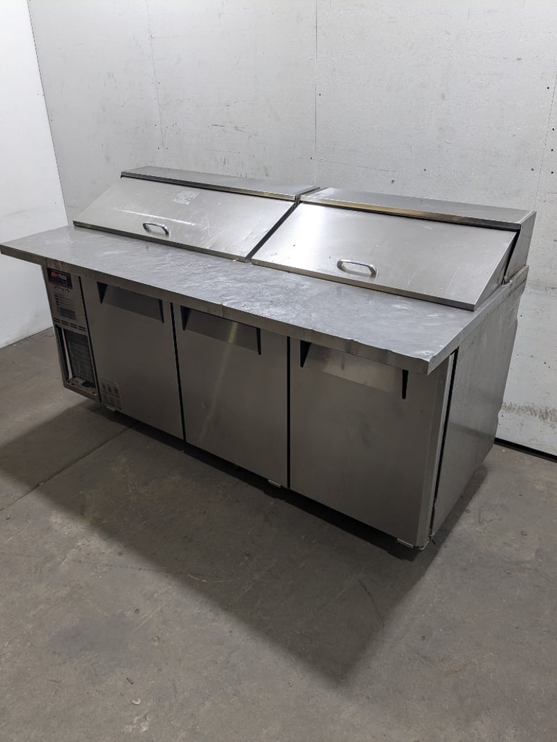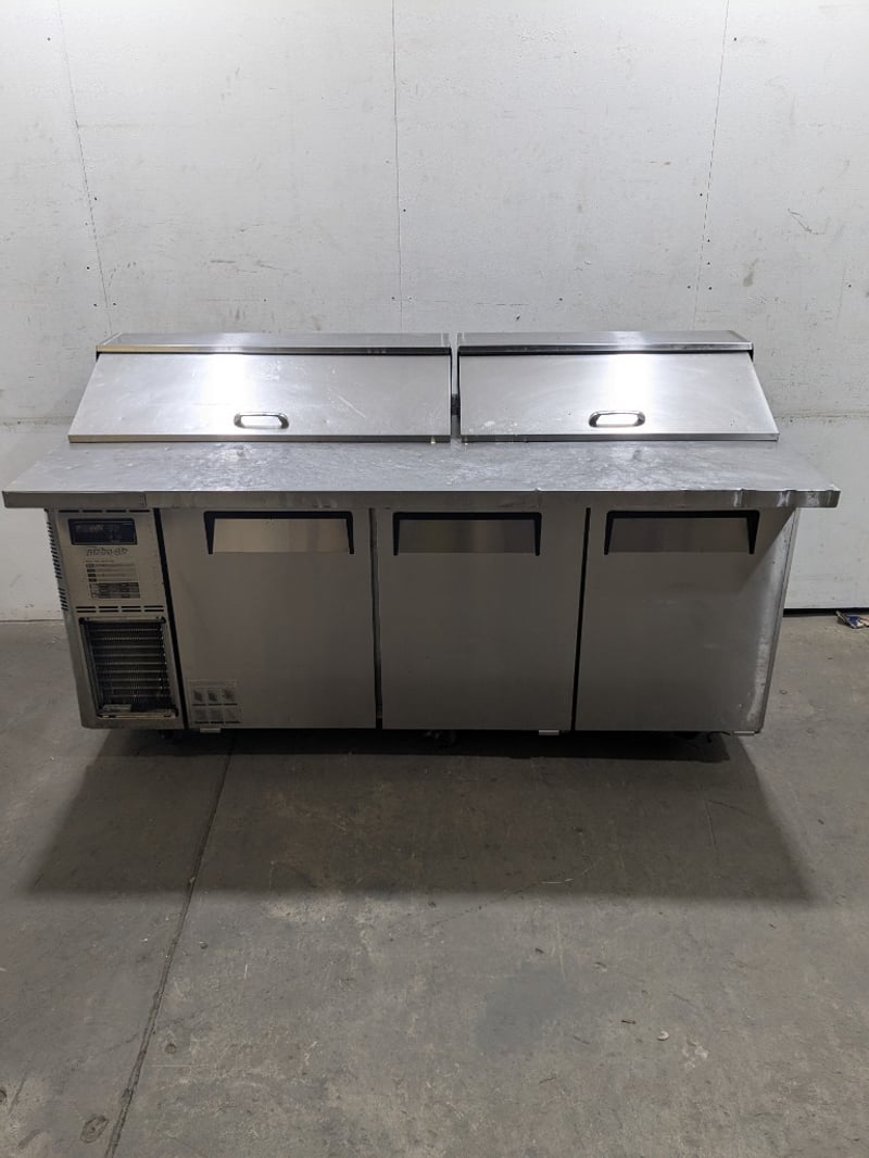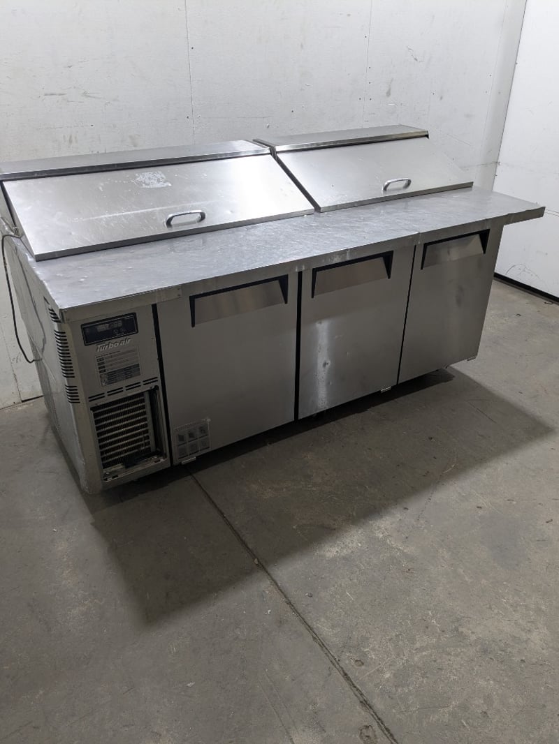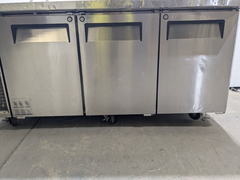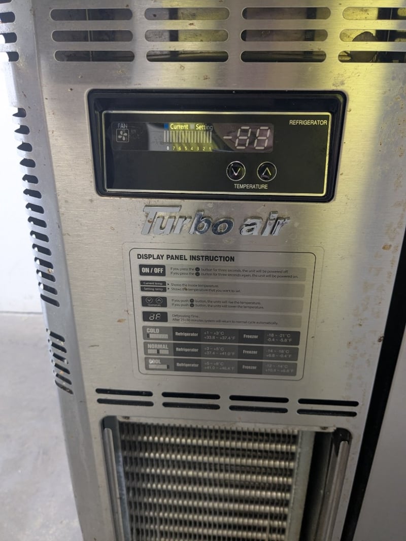 Turbo Air refrigerator, stainless steel, on mobile castors,3 doors. Dims: 183 x 77 x 109cmNote: untested, signs of wearn