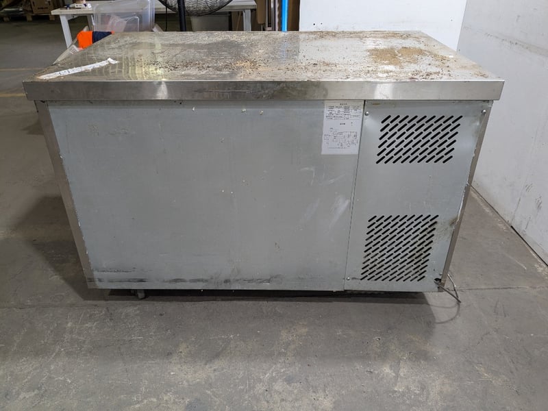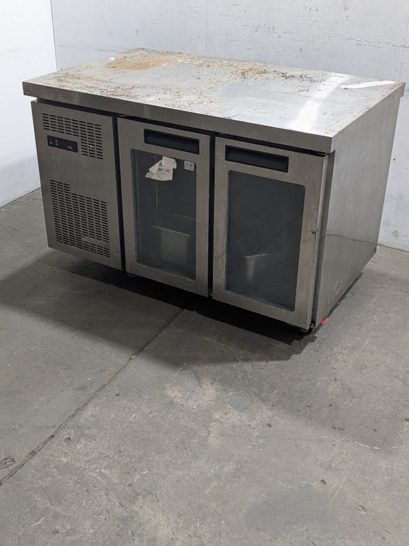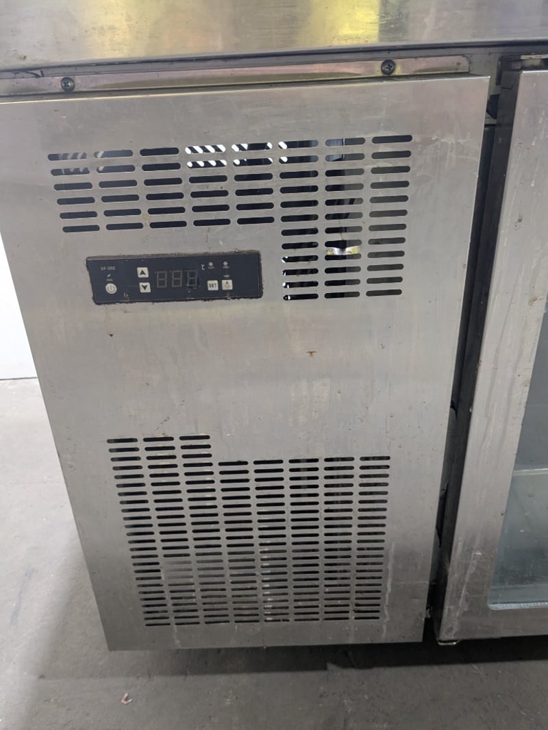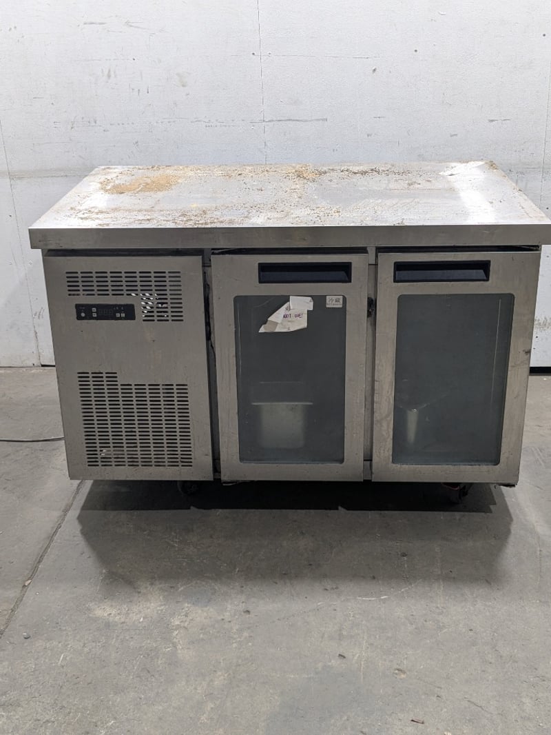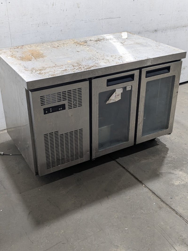 Commercial undercounter refrigeration unit featuring a three-door configuration with glass fronts. Stainless steel construction with a solid work surface top. (TG0.2L2W model),on mobile castors. Dims: 136 x 70 x 90cmNote: untested,signs of wear , cord damaged needs to replaced