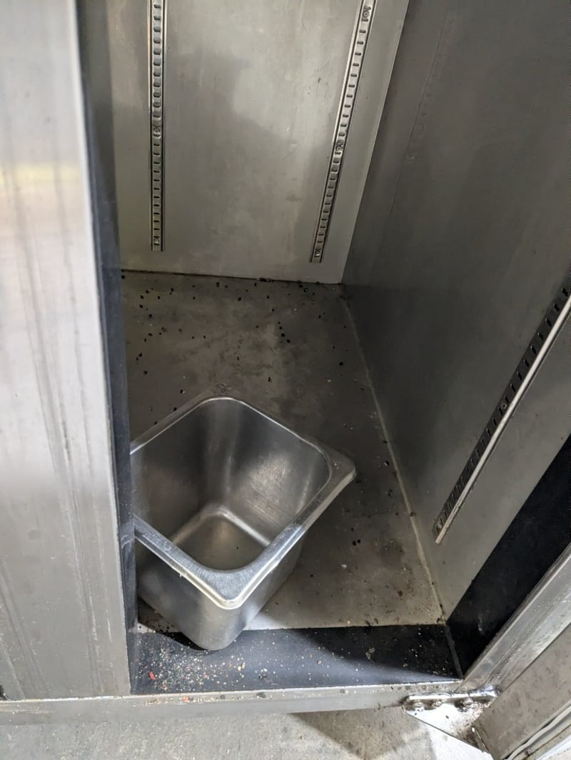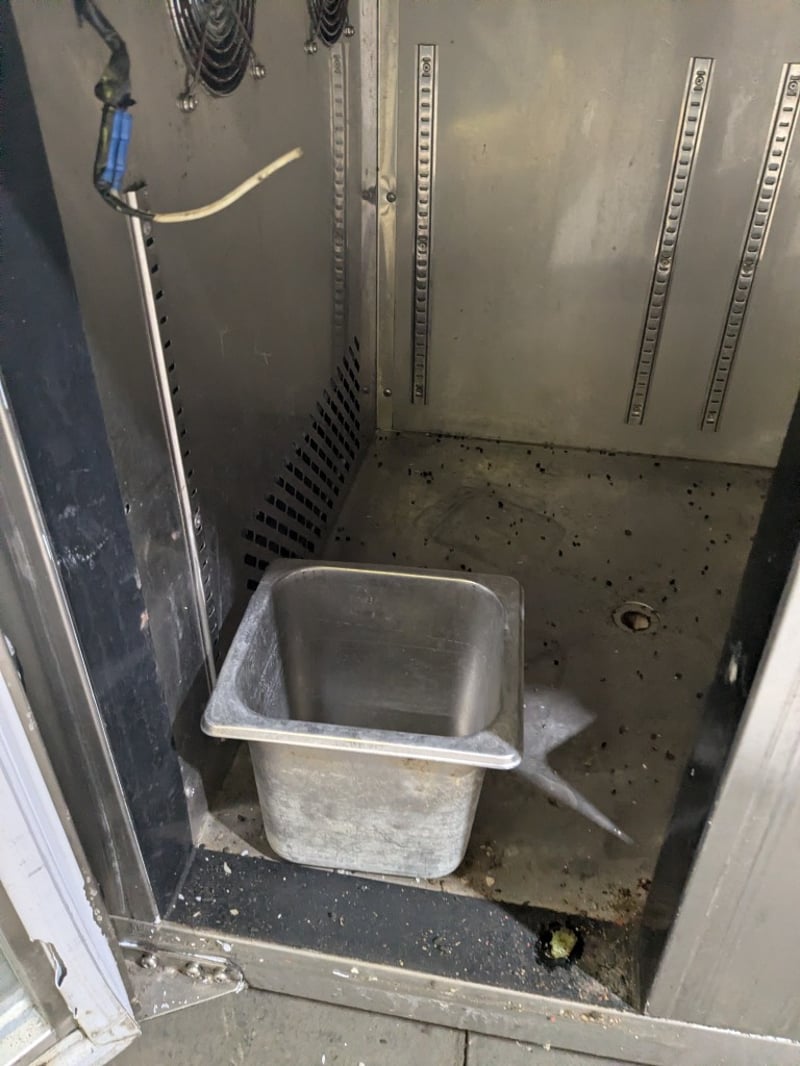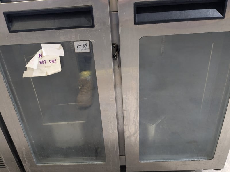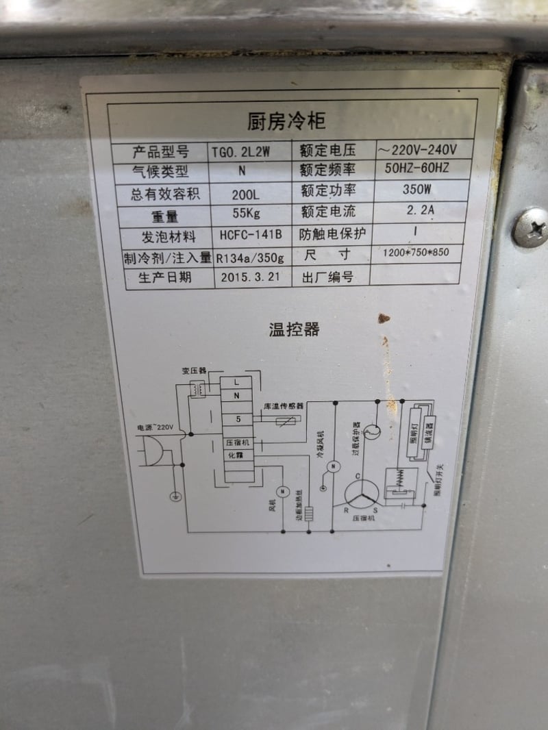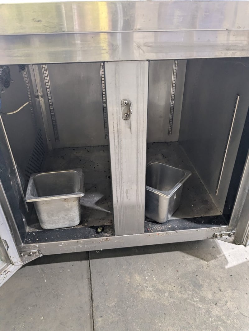Commercial undercounter refrigeration unit featuring a three-door configuration with glass fronts. Stainless steel construction with a solid work surface top. (TG0.2L2W model),on mobile castors. Dims: 136 x 70 x 90cmNote: untested,signs of wear , cord damaged needs to replaced
