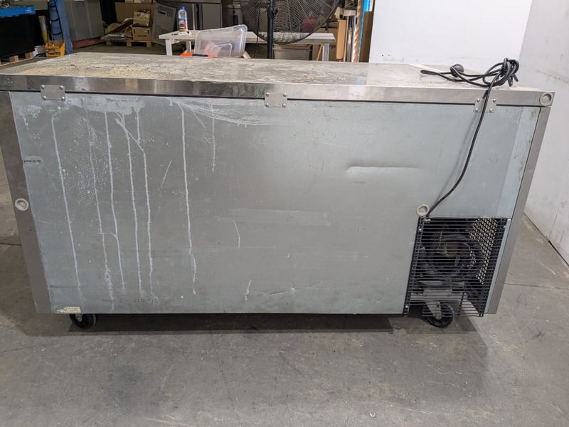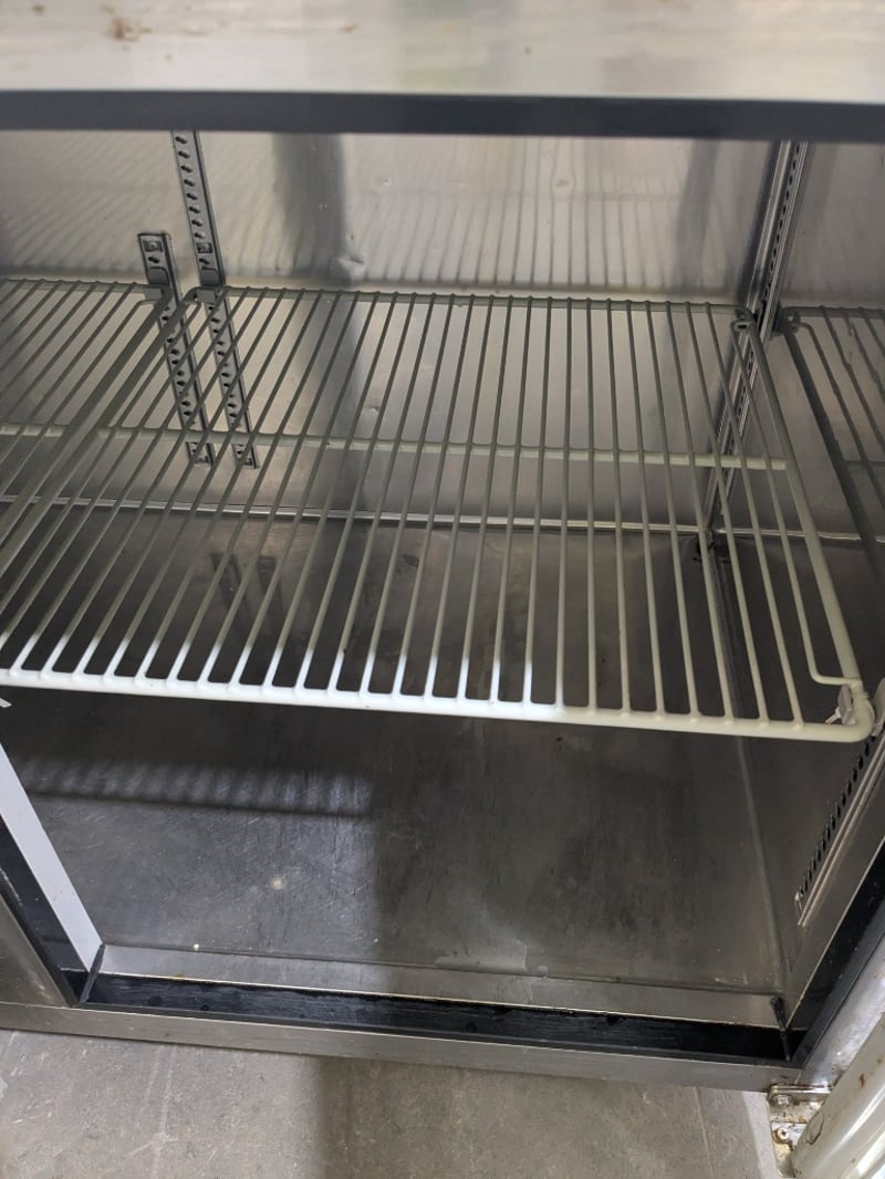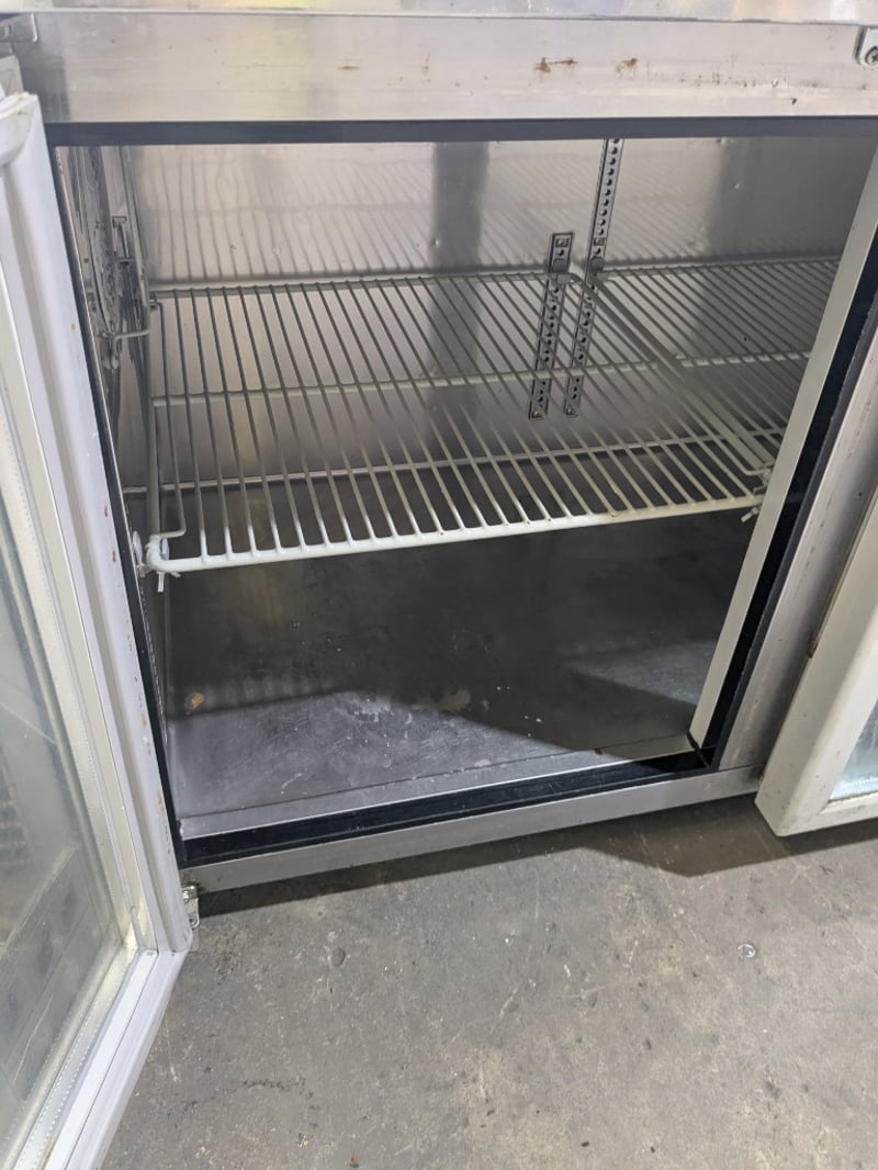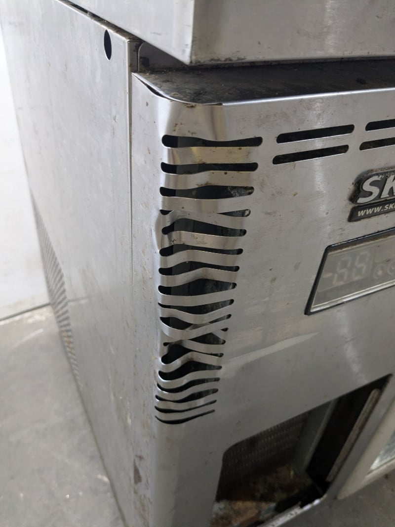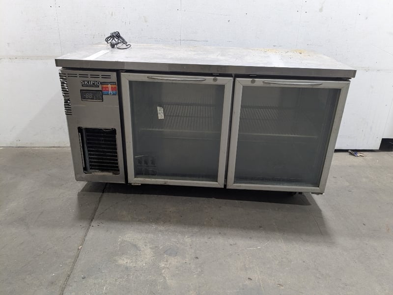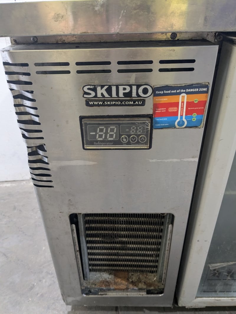 Skipio commercial refrigerated bench unit featuring three glass-door display compartments, stainless steel, on mobile castors