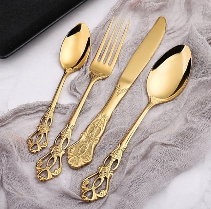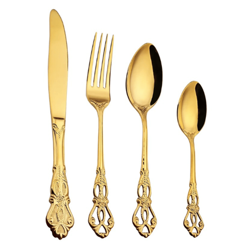 Vintage cutlery set Our vintage cutlery set are made from heavy duty 18/0 stainless steel , making them durable for years to comethey come in a set of 24pcs x6 tablespoonsx6 forks x6 teaspoons x6 knives colour - gold