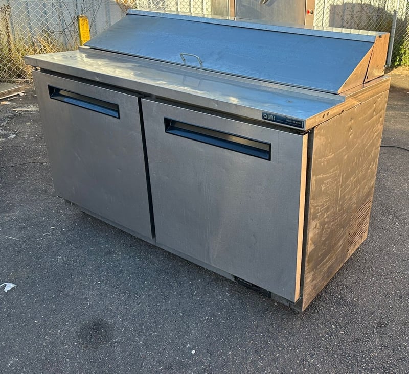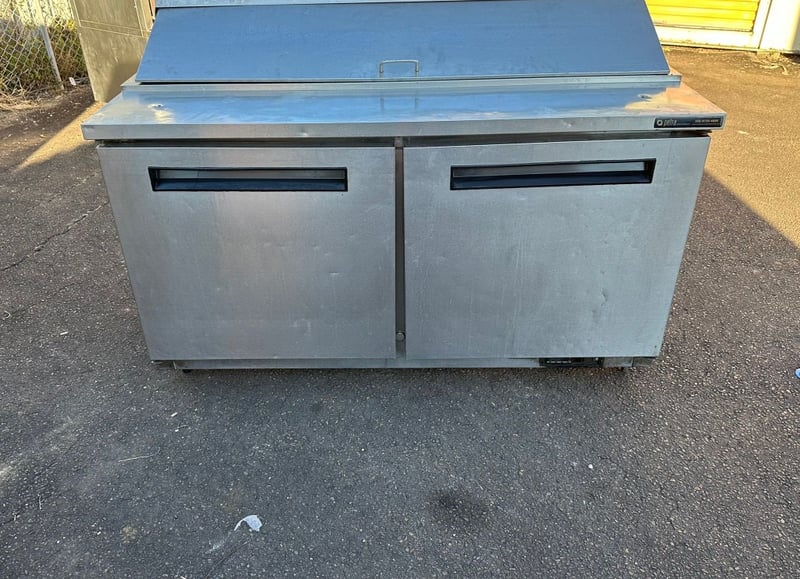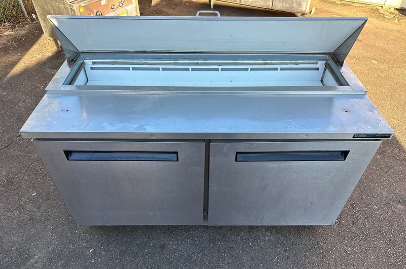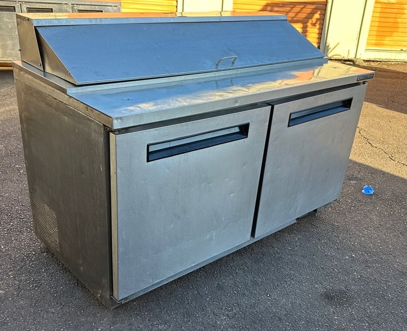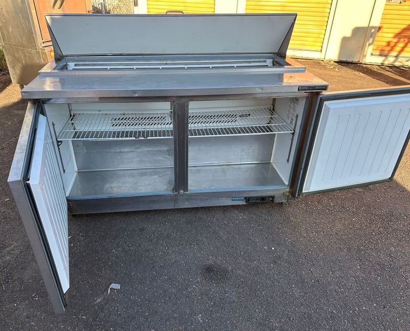 Polar 2 door pizza fridge with open /close top lid with self adjustable storage shelves on castors Dims: 76 x 155 x 108cmNote: untested,signs of wear