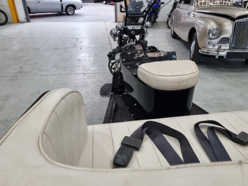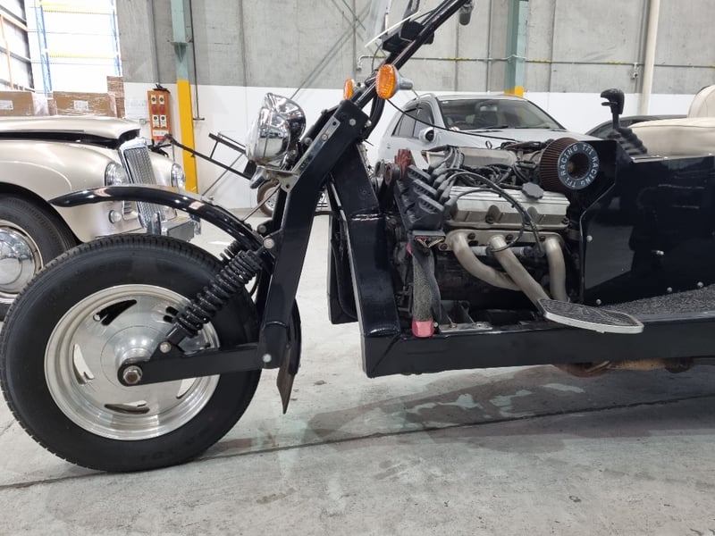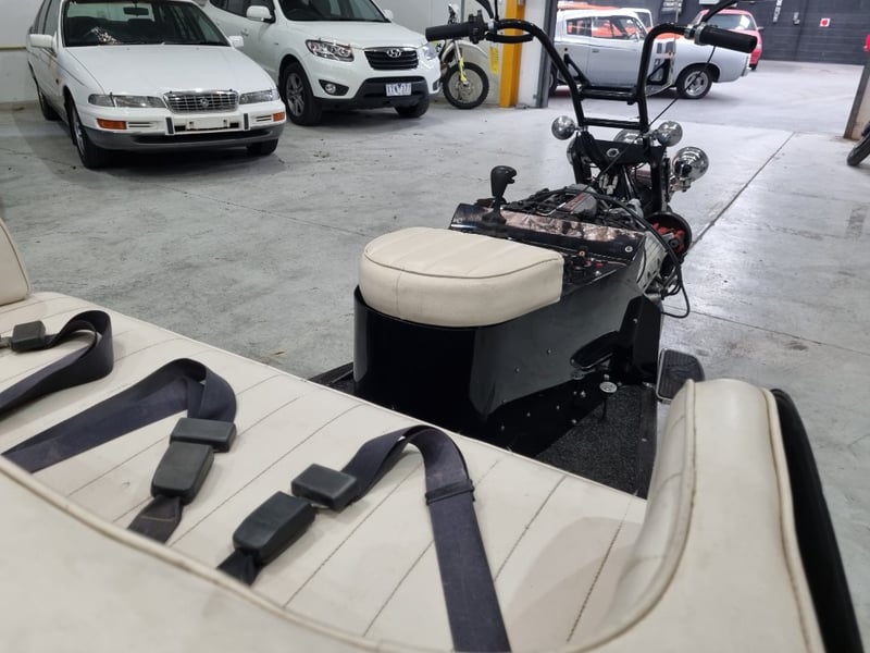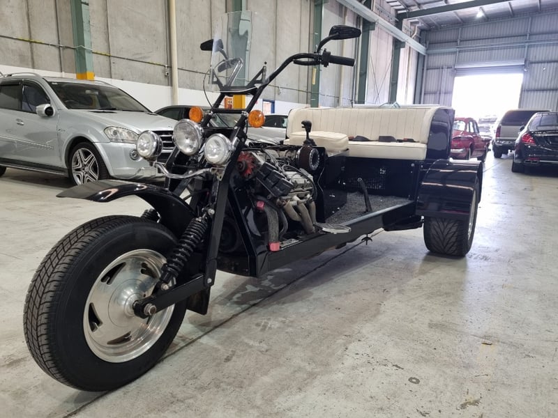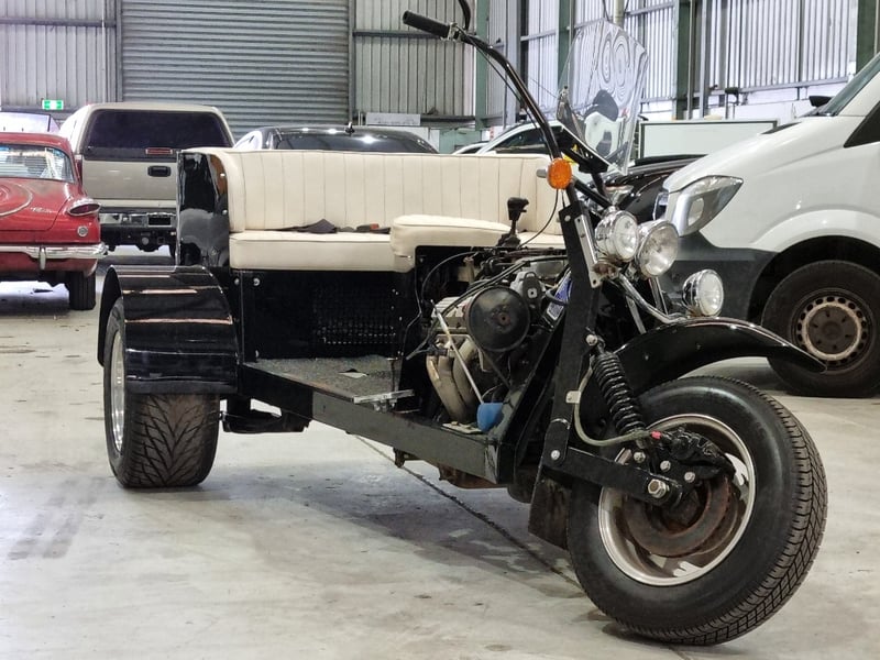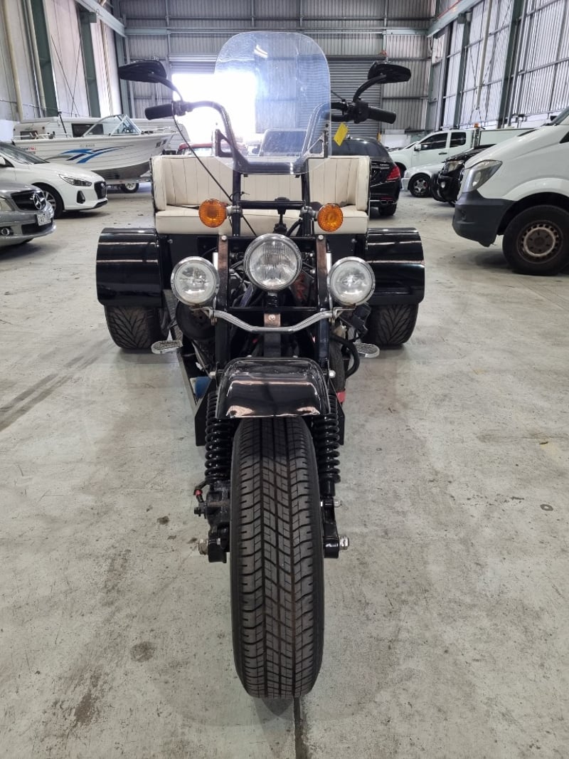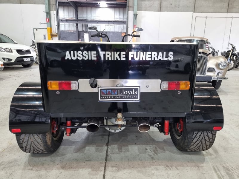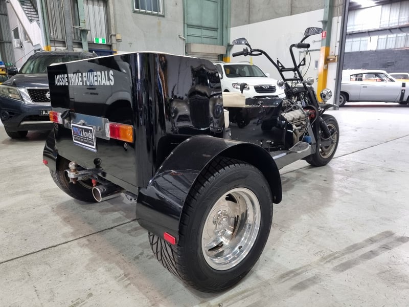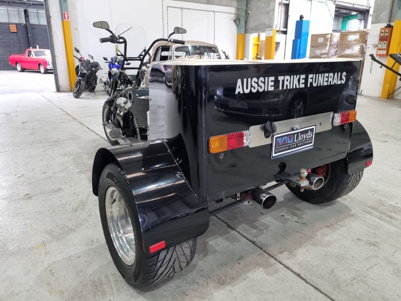 Description/extras: Distinctive custom-built motorcycle trike configured as a funeral hearse, featuring a black and cream colour scheme with professional branding. The trike comprises a substantial V-twin engine (1200cc) mounted to a purpose-built chassis with integrated sidecar attachment. The sidecar features a coffin-style cargo bed with dark grey textured deck surface, aluminium safety rails, and professional-grade tie-down points. Cream leather seating with vertical stitching accommodates the driver and passenger. The motorcycle section displays classic styling with dual headlights, chrome detailing, and extended handlebars. Mechanical specifications include manual transmission, rear-wheel drive configuration, and aspirated petrol engine. The vehicle exhibits a polished stainless steel exhaust system and modern braking components. Instrumentation panel visible with multiple gauges. Tyres show moderate wear. This specialised vehicle represents a unique niche application in the funeral services industry, combining traditional motorcycle aesthetics with functional cargo capacity. Tyre wear moderate, minor surface oxidation on chrome fixtures, weathering consistent with operational use.. Inspection recommended.
