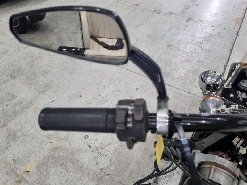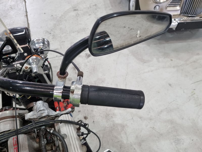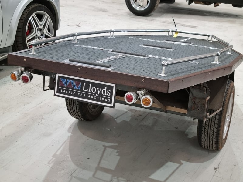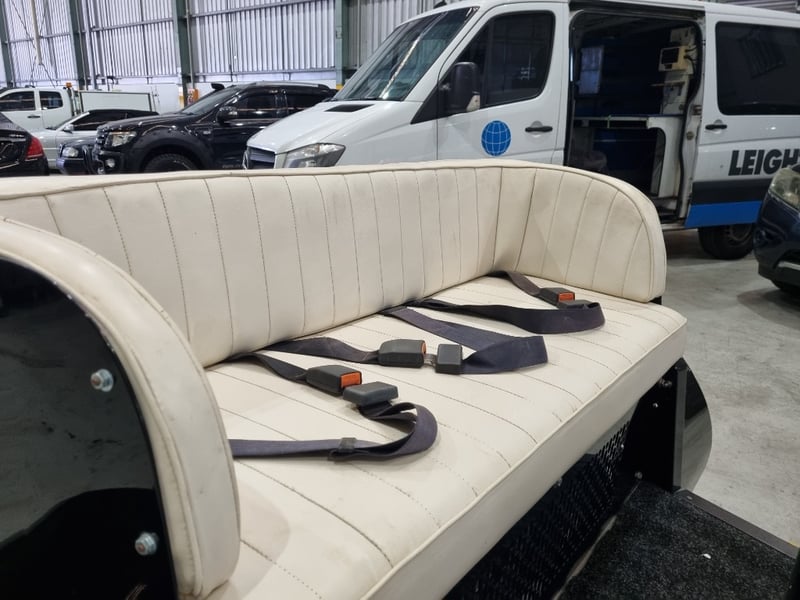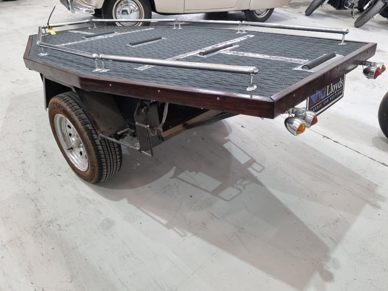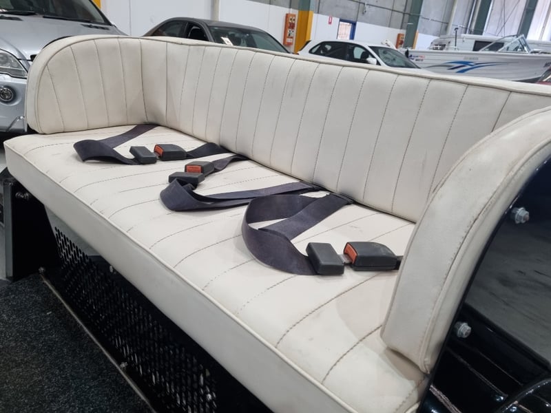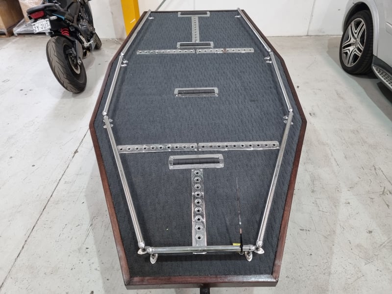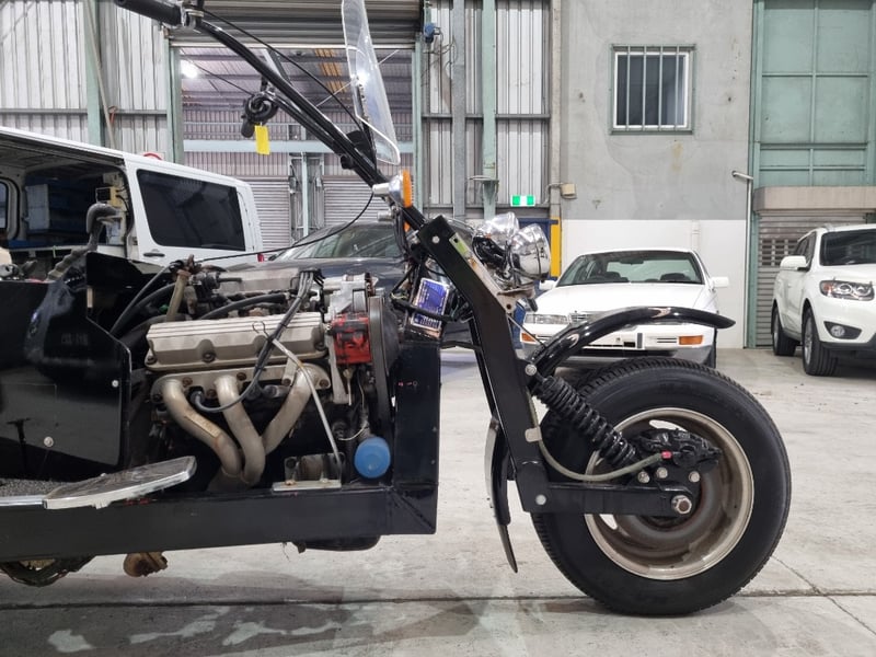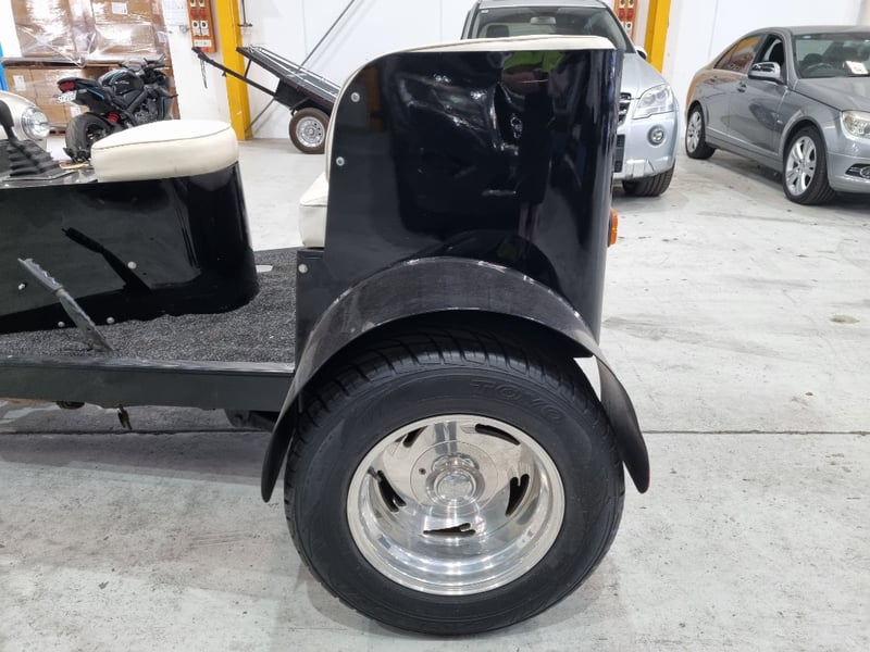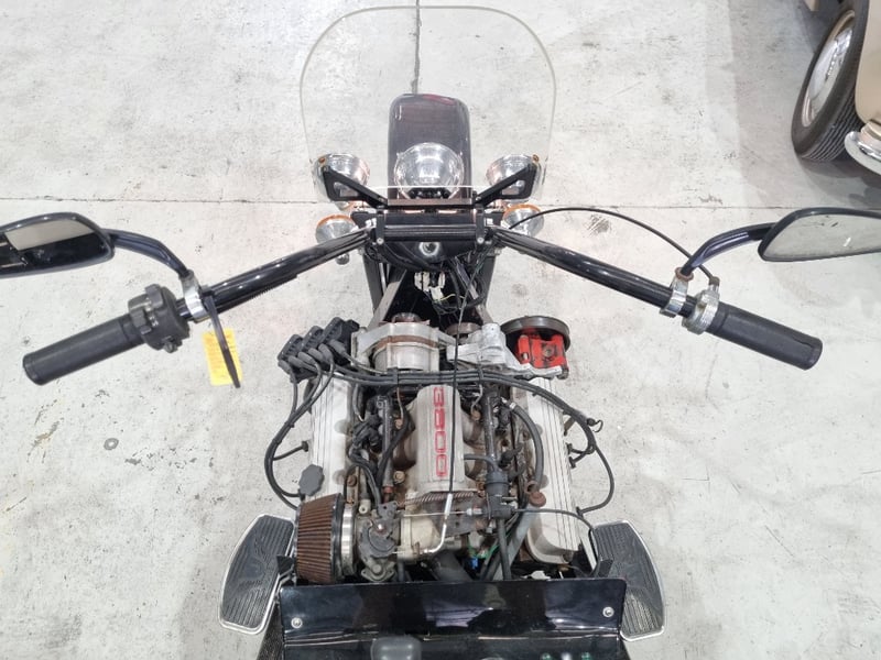 Description/extras: Distinctive custom-built motorcycle trike configured as a funeral hearse, featuring a black and cream colour scheme with professional branding. The trike comprises a substantial V-twin engine (1200cc) mounted to a purpose-built chassis with integrated sidecar attachment. The sidecar features a coffin-style cargo bed with dark grey textured deck surface, aluminium safety rails, and professional-grade tie-down points. Cream leather seating with vertical stitching accommodates the driver and passenger. The motorcycle section displays classic styling with dual headlights, chrome detailing, and extended handlebars. Mechanical specifications include manual transmission, rear-wheel drive configuration, and aspirated petrol engine. The vehicle exhibits a polished stainless steel exhaust system and modern braking components. Instrumentation panel visible with multiple gauges. Tyres show moderate wear. This specialised vehicle represents a unique niche application in the funeral services industry, combining traditional motorcycle aesthetics with functional cargo capacity. Tyre wear moderate, minor surface oxidation on chrome fixtures, weathering consistent with operational use.. Inspection recommended.