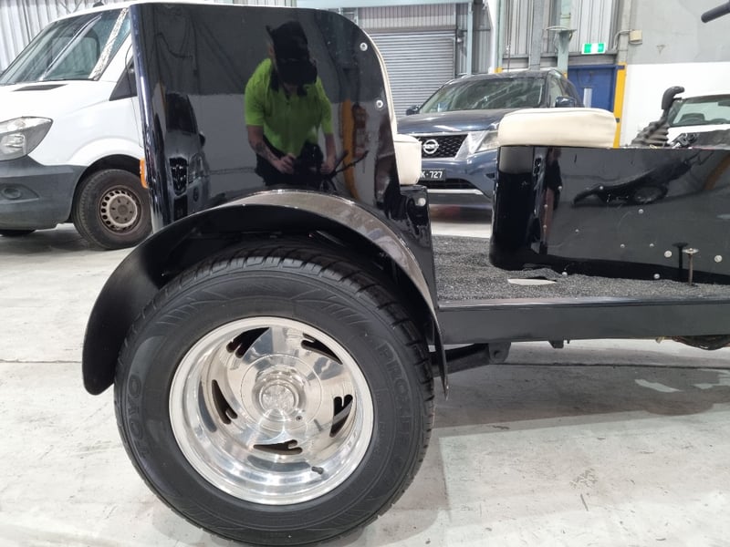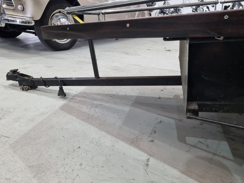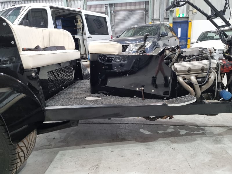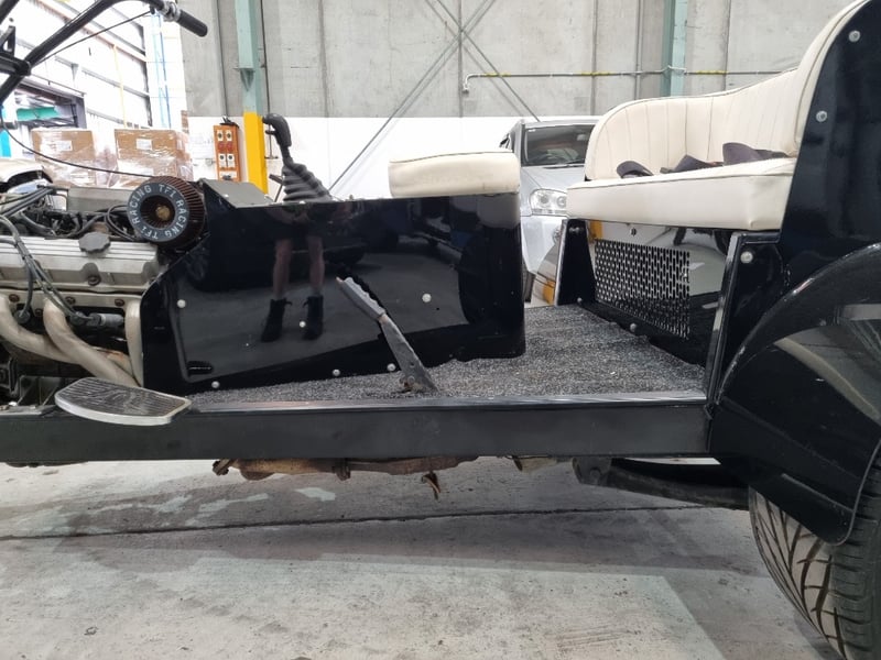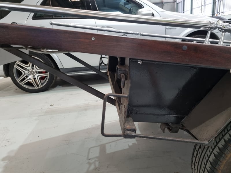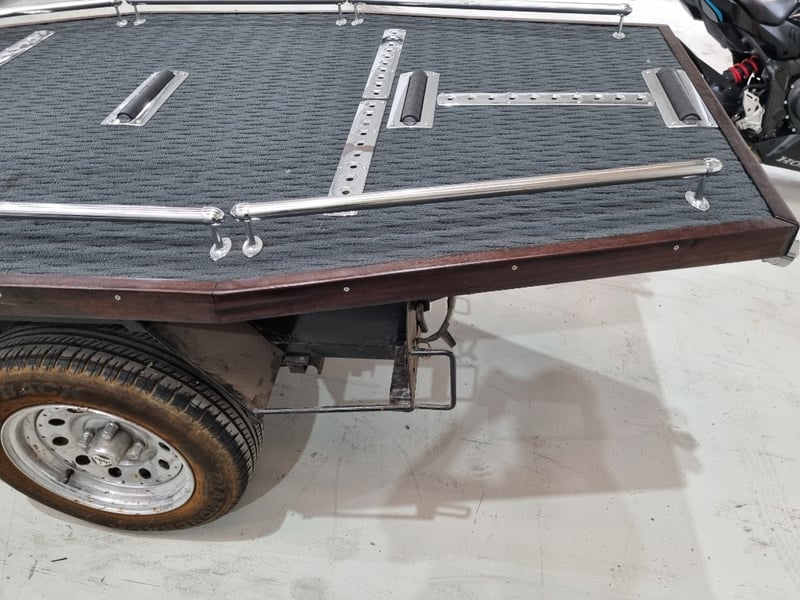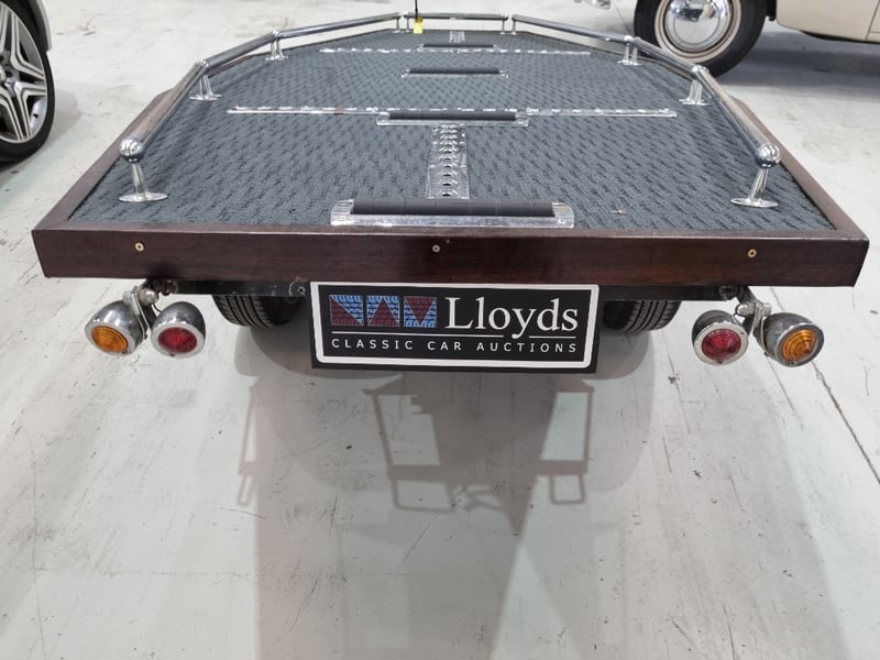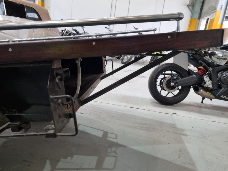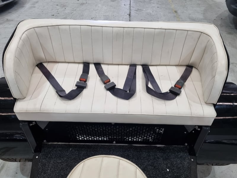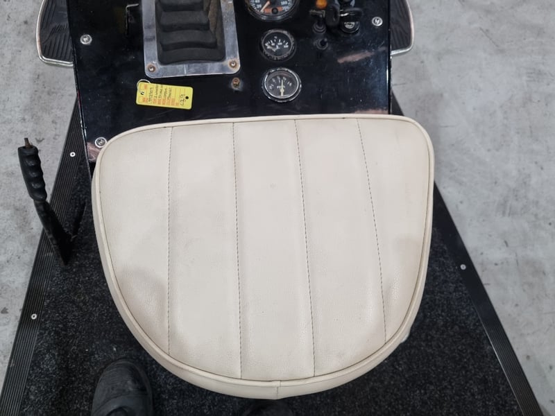 Description/extras: Distinctive custom-built motorcycle trike configured as a funeral hearse, featuring a black and cream colour scheme with professional branding. The trike comprises a substantial V-twin engine (1200cc) mounted to a purpose-built chassis with integrated sidecar attachment. The sidecar features a coffin-style cargo bed with dark grey textured deck surface, aluminium safety rails, and professional-grade tie-down points. Cream leather seating with vertical stitching accommodates the driver and passenger. The motorcycle section displays classic styling with dual headlights, chrome detailing, and extended handlebars. Mechanical specifications include manual transmission, rear-wheel drive configuration, and aspirated petrol engine. The vehicle exhibits a polished stainless steel exhaust system and modern braking components. Instrumentation panel visible with multiple gauges. Tyres show moderate wear. This specialised vehicle represents a unique niche application in the funeral services industry, combining traditional motorcycle aesthetics with functional cargo capacity. Tyre wear moderate, minor surface oxidation on chrome fixtures, weathering consistent with operational use.. Inspection recommended.