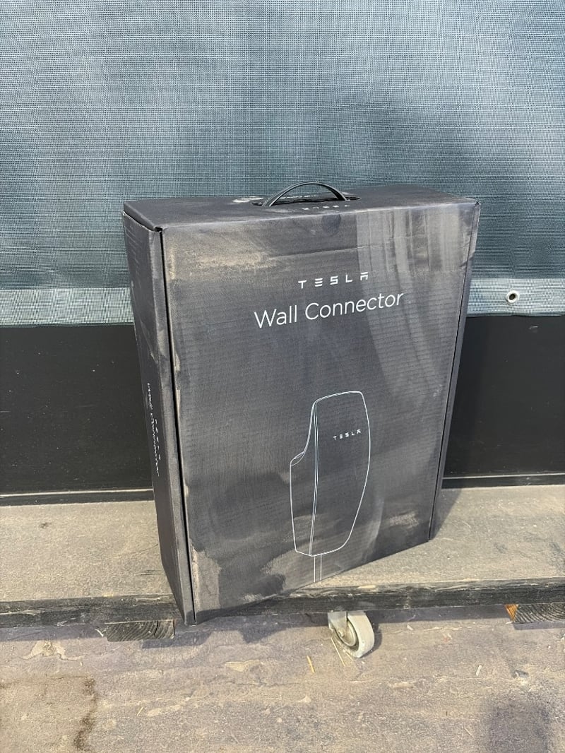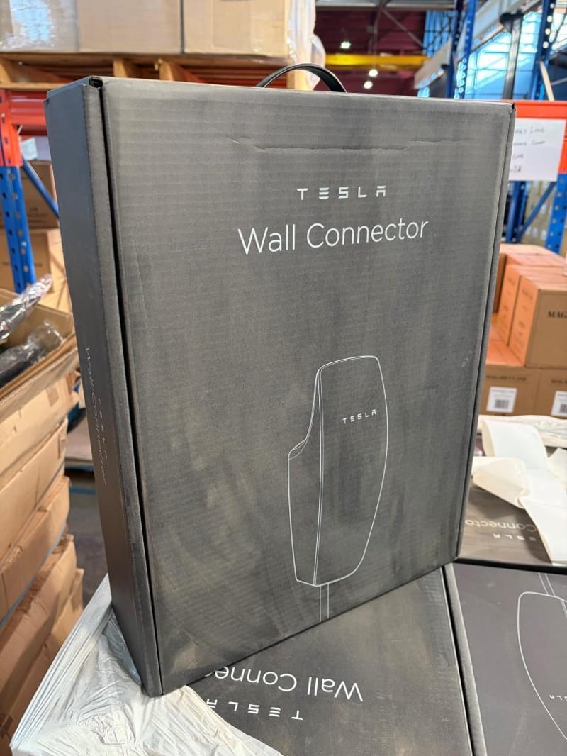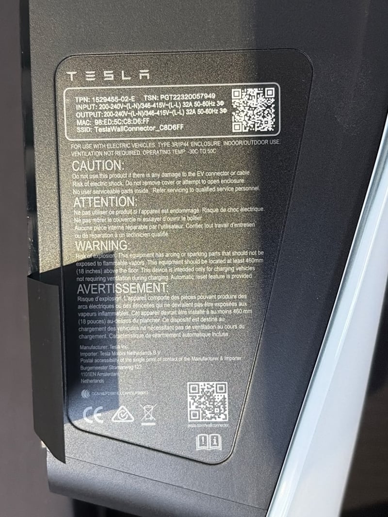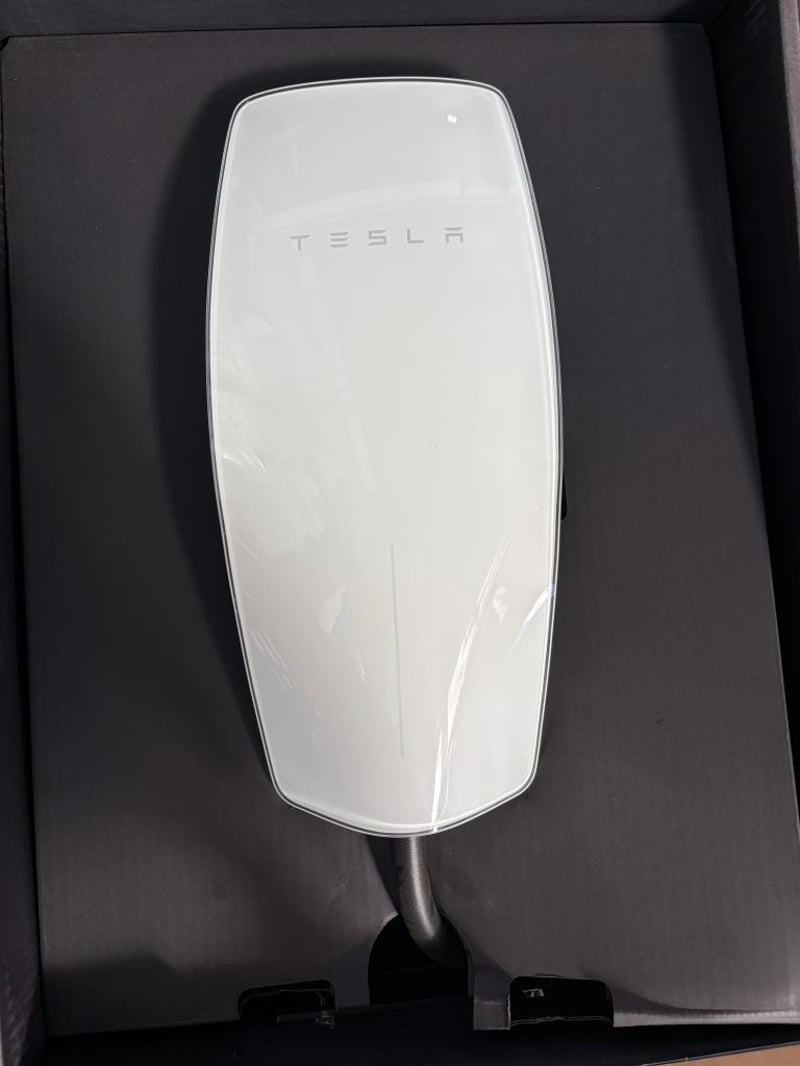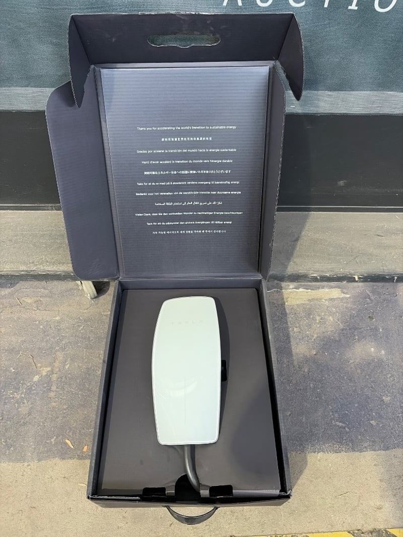 Tesla Wall Connector charging unit in original packaging. This is a Type 3/4 EV charger designed for electric vehicle charging with 32A capacity, supporting 200-240V single-phase input. The unit features an integrated cable with connector, housed in a white polymer enclosure. Specifications include output of 200-240V (~3)346-15V (-L1) 32A 50-60Hz 3Ø. The device is suitable for indoor/outdoor use and requires no ventilation. Operating temperature range -20°C to 50°C. Unit includes safety certifications (CE marked) and multilingual safety documentation. Original black cardboard packaging with product imagery and safety information intact. Includes power cord with handle for transport.