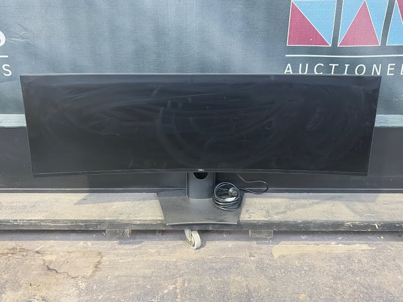 Dell U4919DW ultrawide curved monitor, 49-inch display with dual 24.5-inch screen configuration. Model U4919DW manufactured August 2022. Features curved design for immersive viewing experience. Includes original stand with cable management. Display shows minor signs of use. Powers on and displays image. Ideal for professional workstations, trading floors, or creative applications requiring extended screen real estate. Original packaging box included.