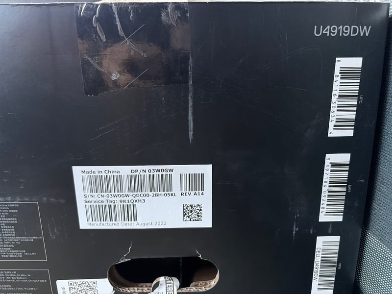 Dell U4919DW ultrawide curved monitor, 49-inch display with dual 24.5-inch screen configuration. Model U4919DW manufactured August 2022. Features curved design for immersive viewing experience. Includes original stand with cable management. New In Box. Ideal for professional workstations, trading floors, or creative applications requiring extended screen real estate. Original packaging box included.