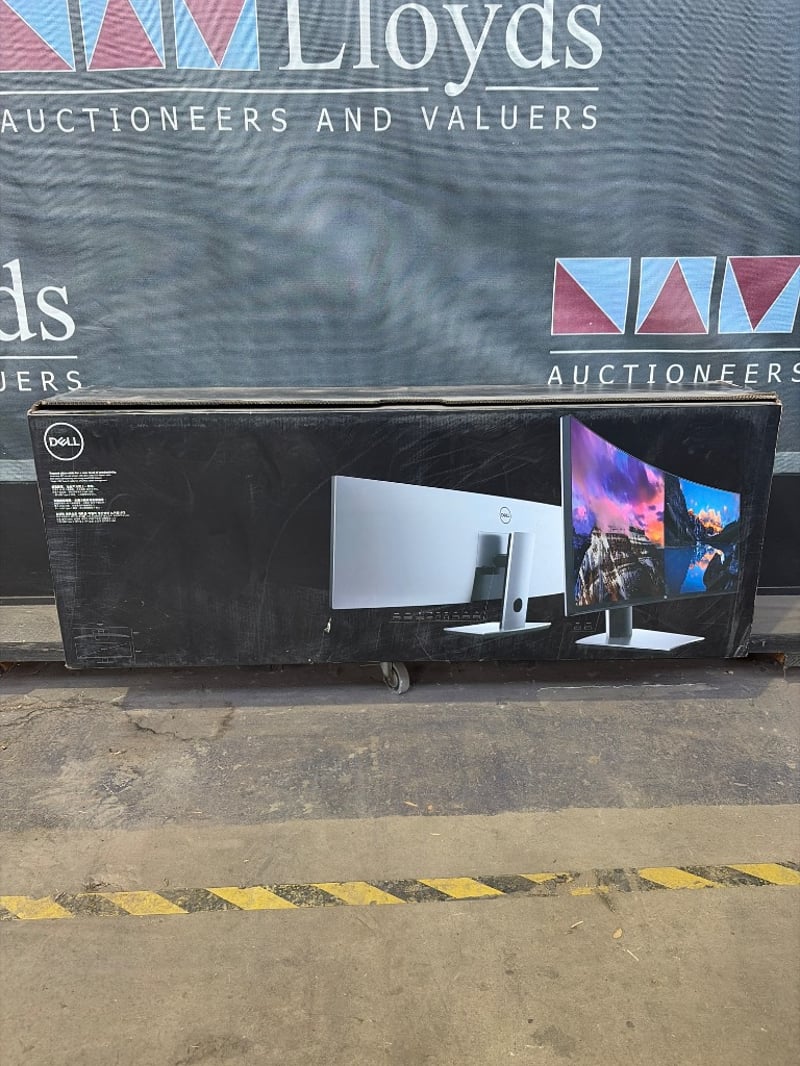 Dell U4919DW ultrawide curved monitor, 49-inch display with dual 24.5-inch screen configuration. Model U4919DW manufactured August 2022. Features curved design for immersive viewing experience. Includes original stand with cable management. New In Box. Ideal for professional workstations, trading floors, or creative applications requiring extended screen real estate. Original packaging box included.