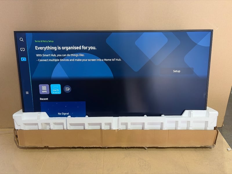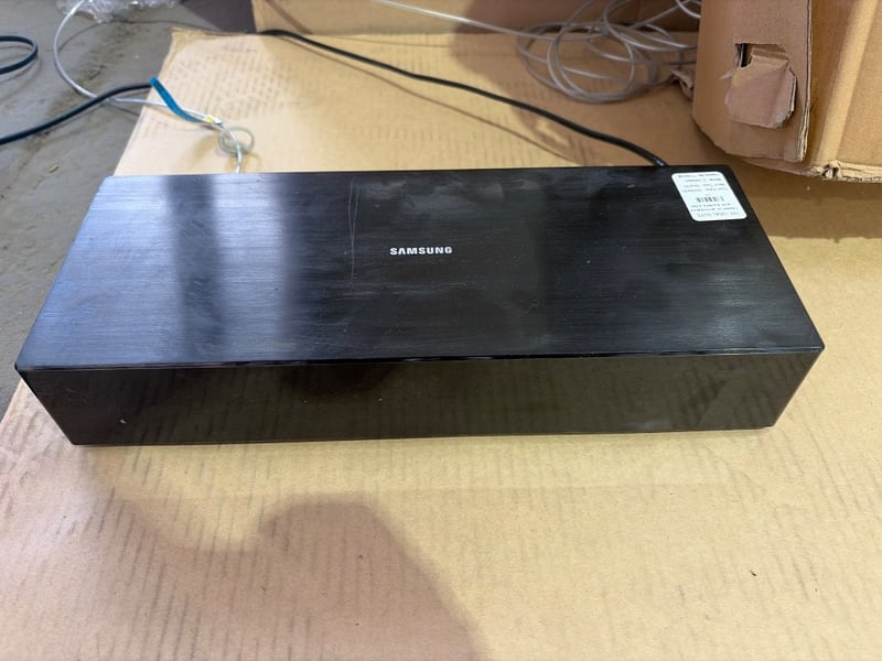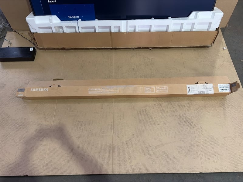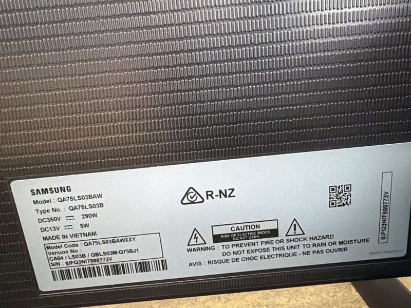 Samsung QA75LS03BAW 75-inch Smart TV soundbar system. The lot includes a Samsung soundbar (Model QA75LS03BAW, Type No. QA75LS03B) with integrated Smart Hub functionality featuring Home IoT connectivity. The soundbar displays a sleek black finish with brushed metal top panel. Specifications include DC350V/290W and DC13V/5W power ratings. Made in Vietnam. The unit is shown in original packaging with protective foam inserts and includes setup documentation. The TV display demonstrates the Smart Hub interface with options to connect multiple devices. Ideal for home entertainment setup with modern smart home integration capabilities.Note: Wall Mount Included, No Remote, Includes Samsung 75” The Frame.