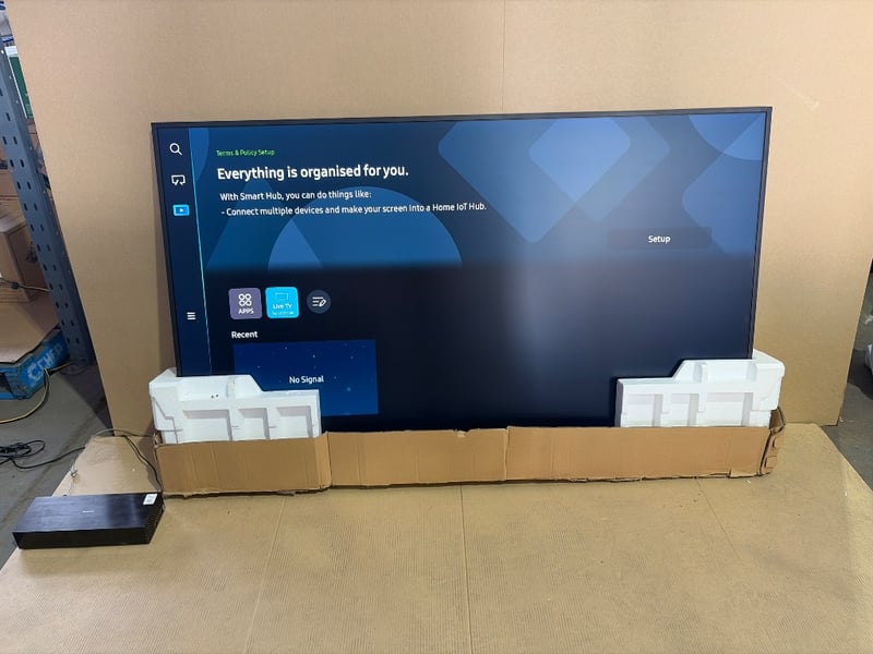 Samsung QN75LS03BAW 75-inch Smart TV soundbar system. Model QA75LS03BAW (Type No. QA75LS03B). Features Smart Hub integration for home IoT connectivity and device management. Unit includes Samsung soundbar with integrated stand and mounting hardware. Display shows Terms & Policy Setup screen with "Everything is organised for you" interface. Made in Vietnam. Includes original packaging and accessories. Device is in working condition and powers on successfully. Ideal for home entertainment setup with smart home capabilities.