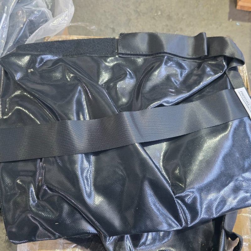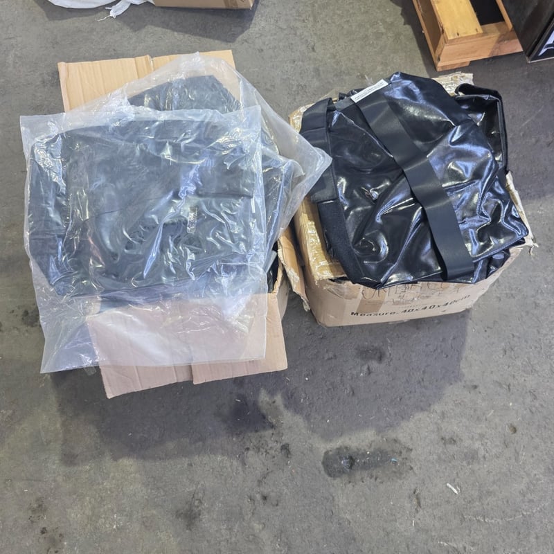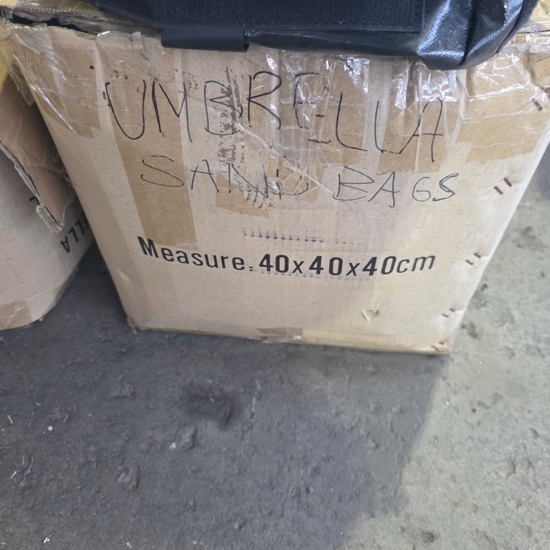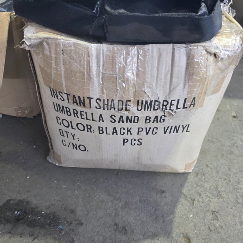 Bulk lot of umbrella sand bags featuring black PVC vinyl construction,. Includes multiple umbrella sand bags with carrying straps and protective plastic wrapping. Sand bags measure 40x40x40cm
