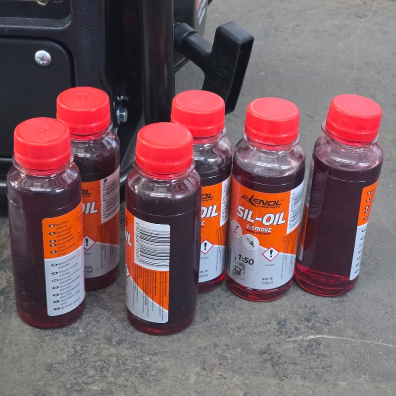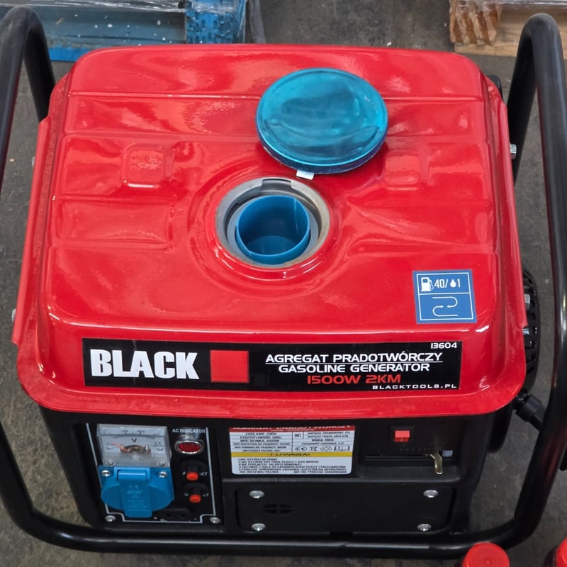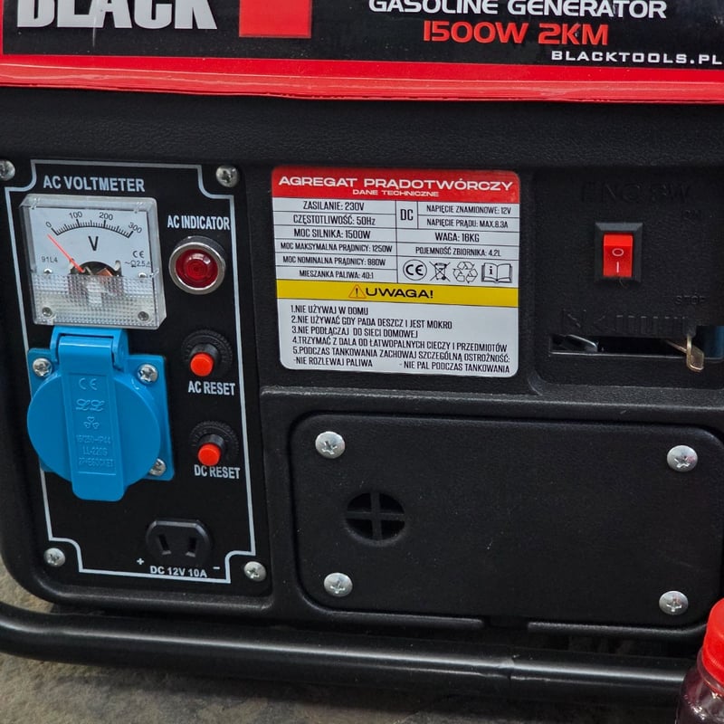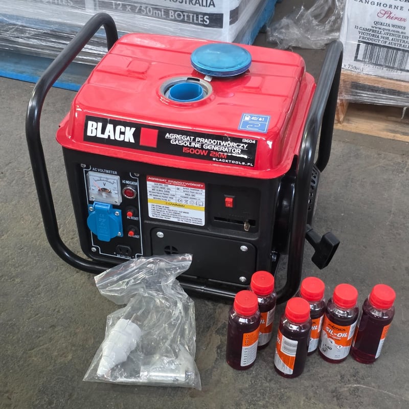 Black 1500W 2KM portable gasoline generator (model B3604) by Agregat Pradotwórczy. Features 230V AC output at 50Hz with 1500W rated power and 1250W maximum capacity. Includes 12V DC output (10A max) and electronic ignition system. Equipped with oil alert safety feature and 4.2L fuel tank capacity. Comes with 6x bottles of 2-stroke Sil-Oil engine oil (100ml each), plastic fuel funnel, and instruction manual. AC voltmeter and reset buttons visible on control panel. Dual-handle design for portability. Ideal for outdoor events, camping, emergency backup power, or remote work sites. Condition appears new/unused with original packaging materials visible.