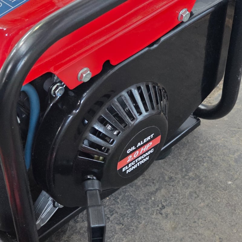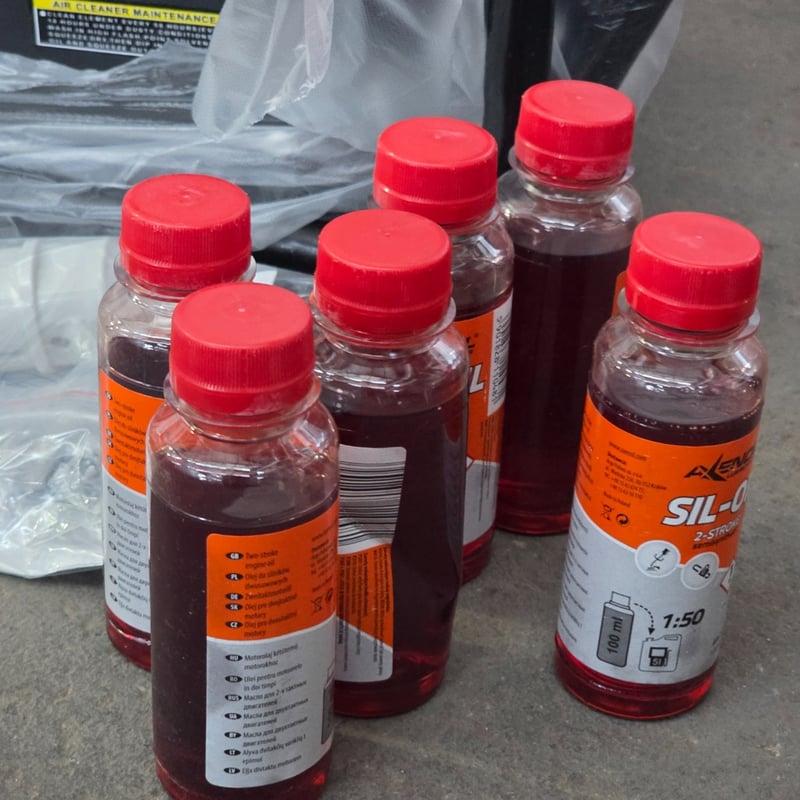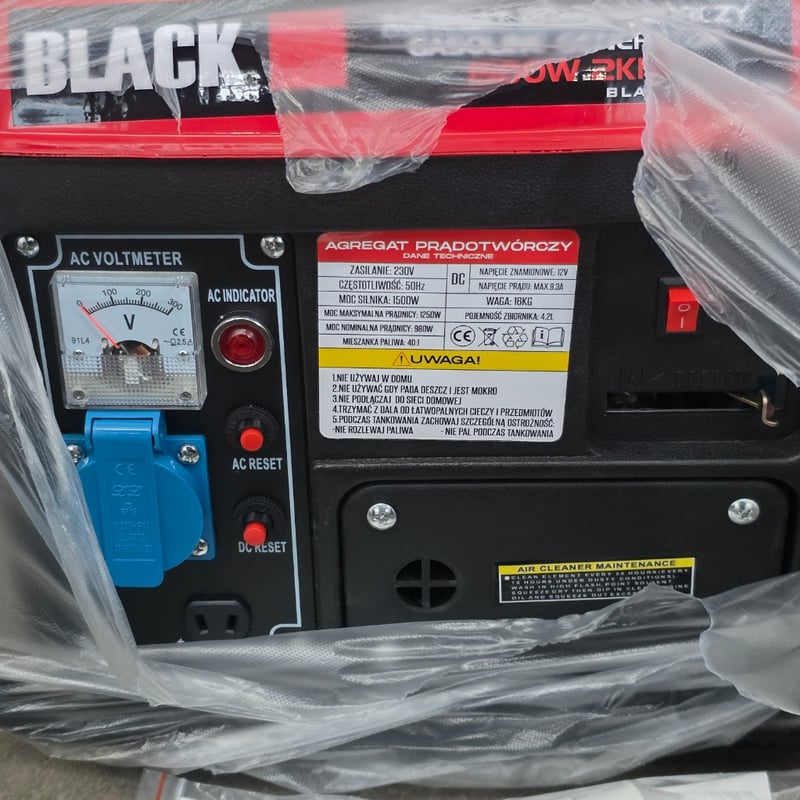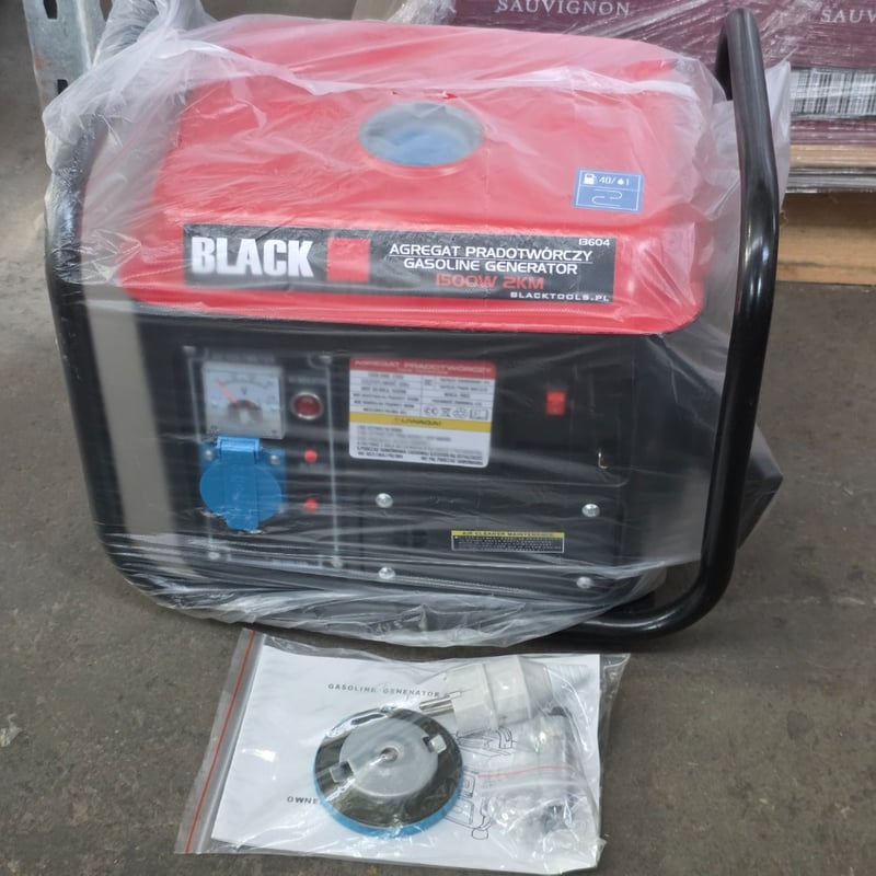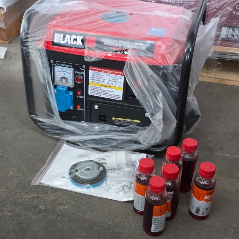 Black 1500W 2KM portable gasoline generator (model B3604) by Agregat Pradotwórczy. Features 230V AC output at 50Hz with 1500W rated power and 1250W maximum capacity. Includes 12V DC output (10A max) and electronic ignition system. Equipped with oil alert safety feature and 4.2L fuel tank capacity. Comes with 6x bottles of 2-stroke Sil-Oil engine oil (100ml each), plastic fuel funnel, and instruction manual. AC voltmeter and reset buttons visible on control panel. Dual-handle design for portability. Ideal for outdoor events, camping, emergency backup power, or remote work sites. Condition appears new/unused with original packaging materials visible