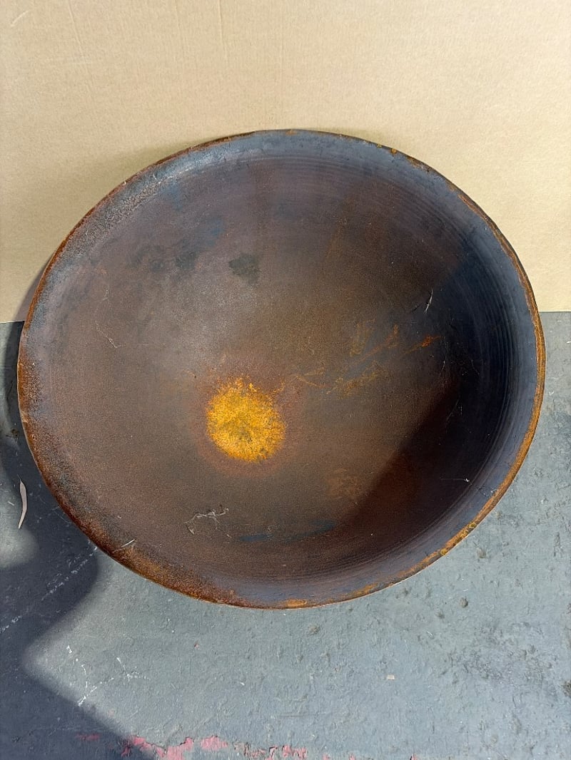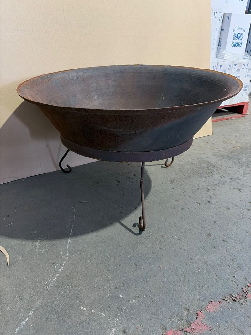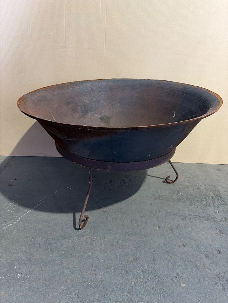 Vintage cast iron fire bowl with tripod stand. This substantial outdoor heating piece features a wide, shallow bowl with gently sloped sides and a rolled rim. The bowl sits atop a cylindrical metal band with three curved wrought iron legs terminating in scrolled feet. The dark patina indicates age and outdoor use. The interior shows rust bloom and oxidation consistent with exposure to the elements. Suitable for garden display or functional outdoor entertaining. A classic piece of garden furniture with rustic appeal.