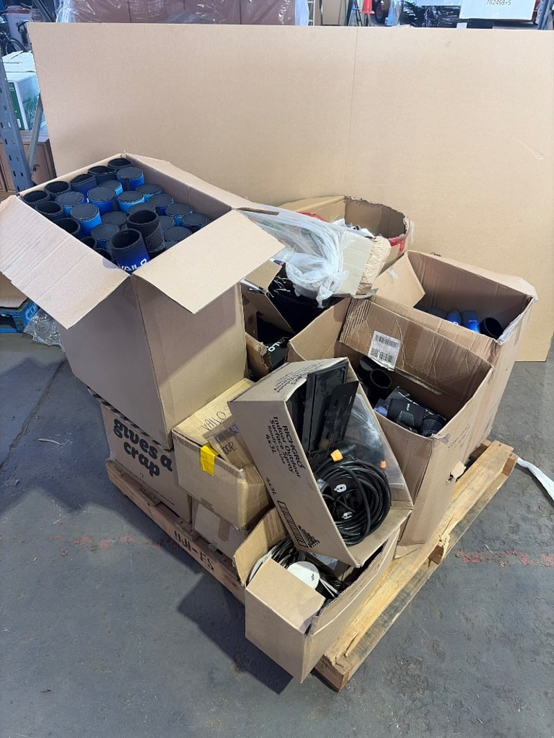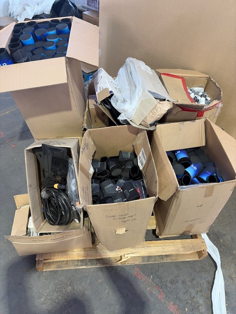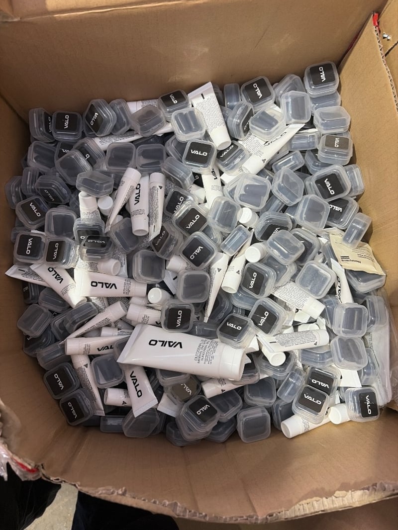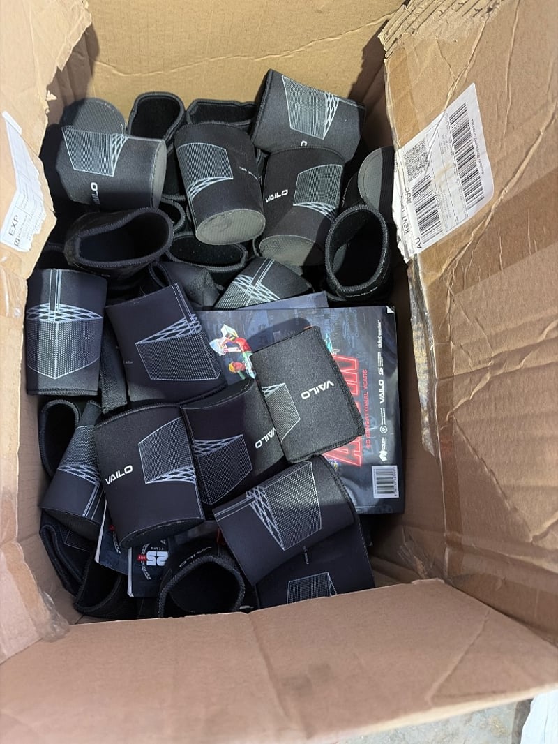 Bulk lot of miscellaneous protective equipment and accessories including VAILO brand stubbie coolers, ear plugs, Lot comprises multiple sealed units in clear plastic packaging, loose protective gear, blue plastic storage containers with lids, black cables/cords, and various sports safety accessories. Stock appears to be retail inventory or overstock. Mixed condition items ranging from sealed new stock to display/opened units. Ideal for sports retailers, resellers, or bulk buyers seeking protective equipment inventory.